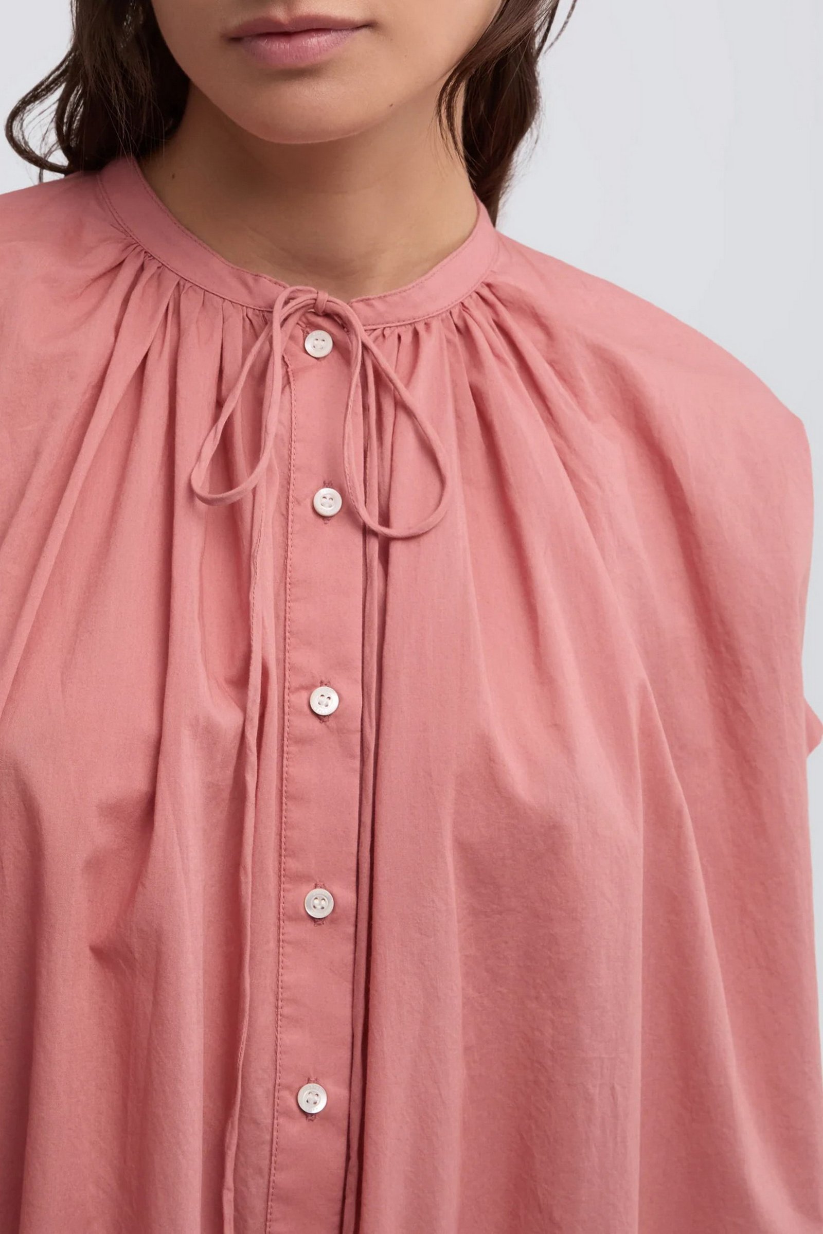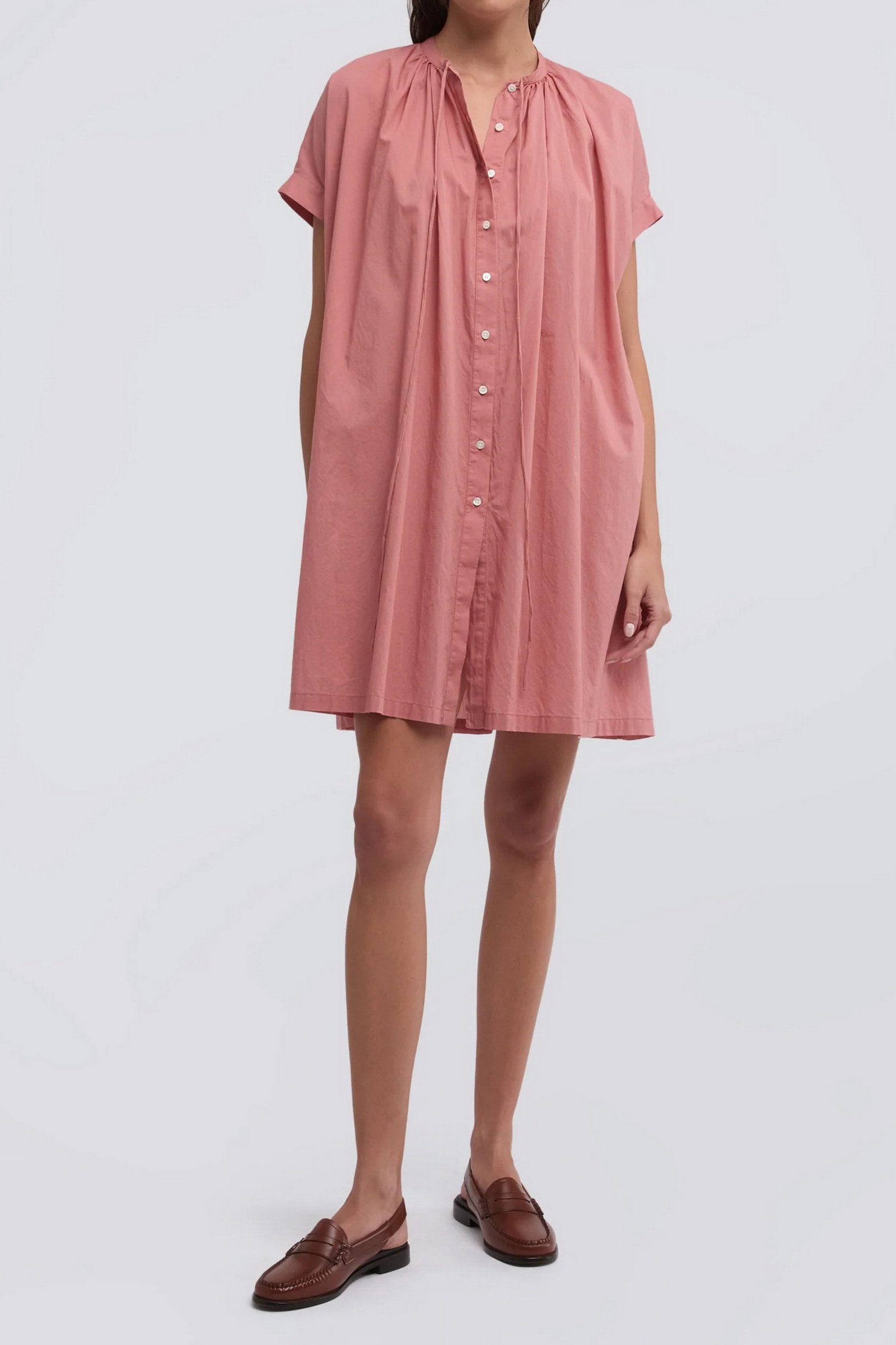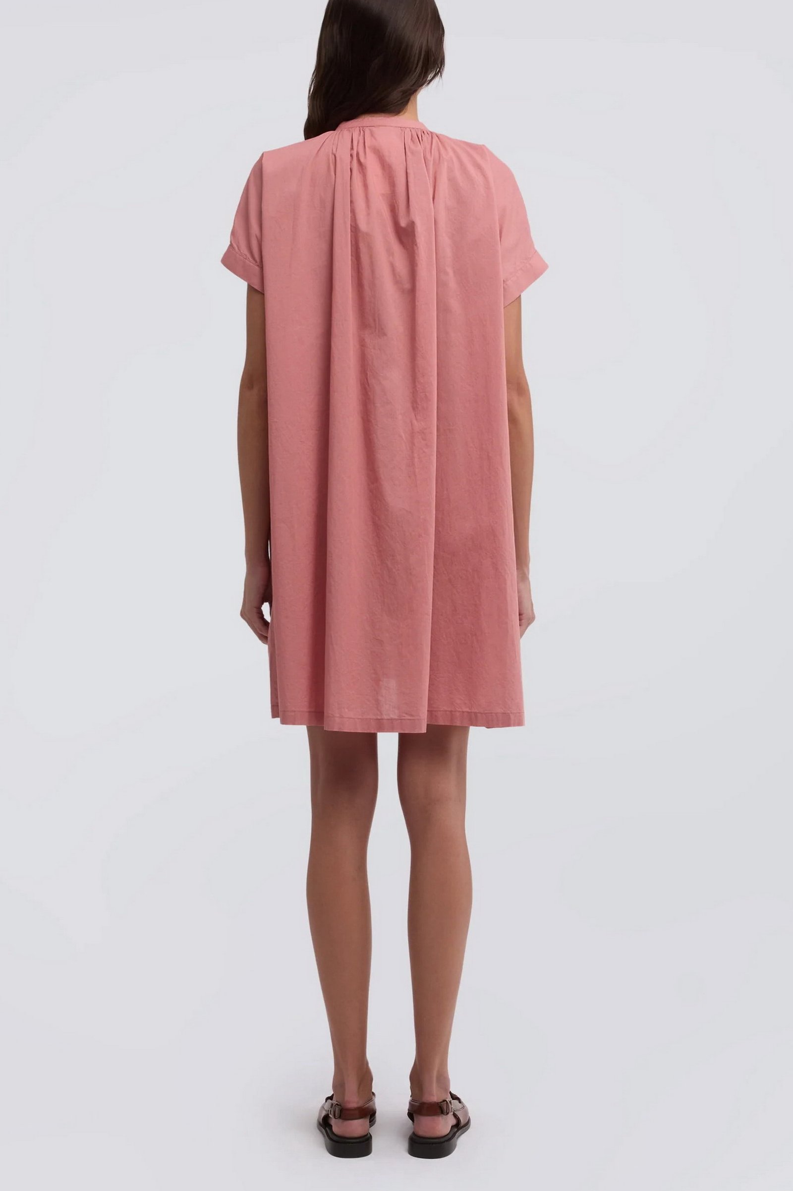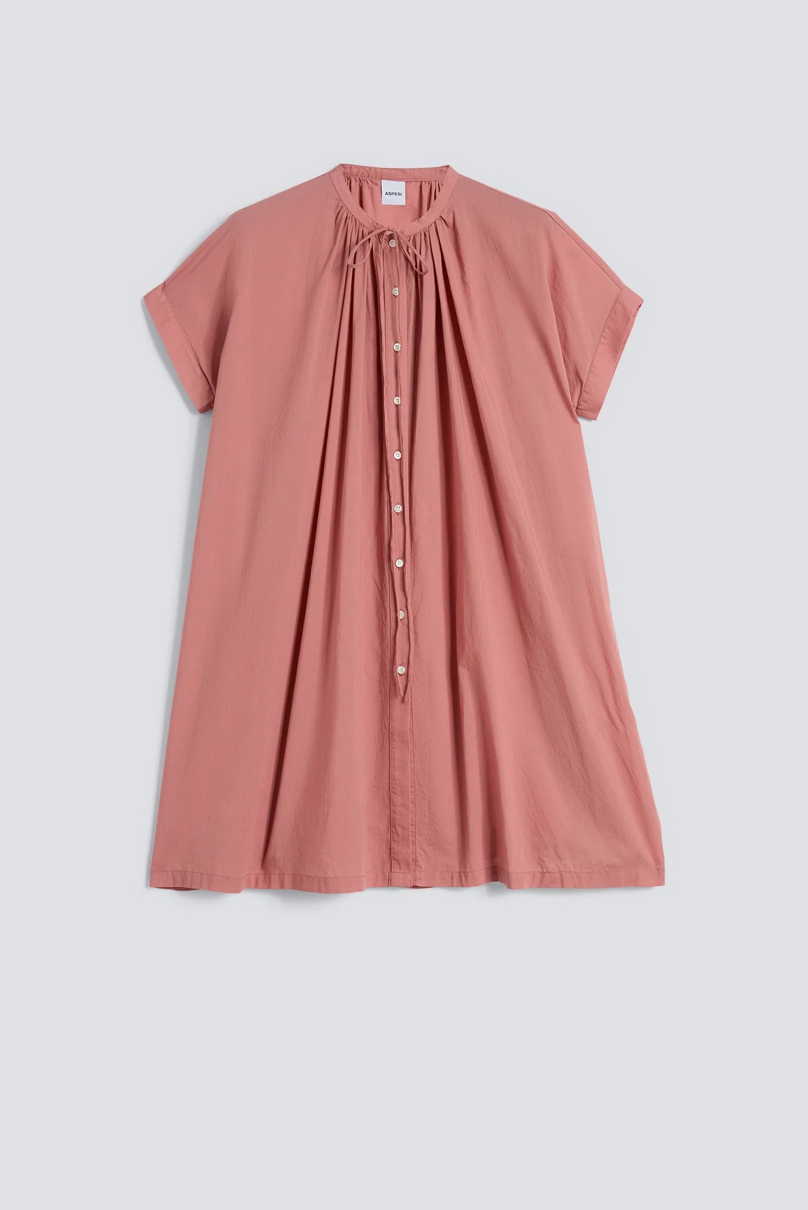 Abito sfoderato in mussola di cotone. Collo alla coreana con arricciature e laccetti. Allacciatura con bottoni. Manica corta con bordo. Linea a trapezio. Vestibilita ampia.