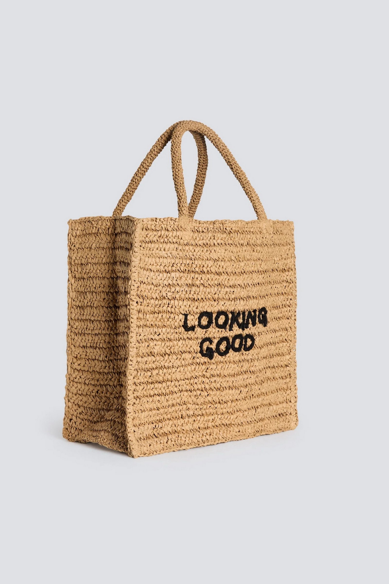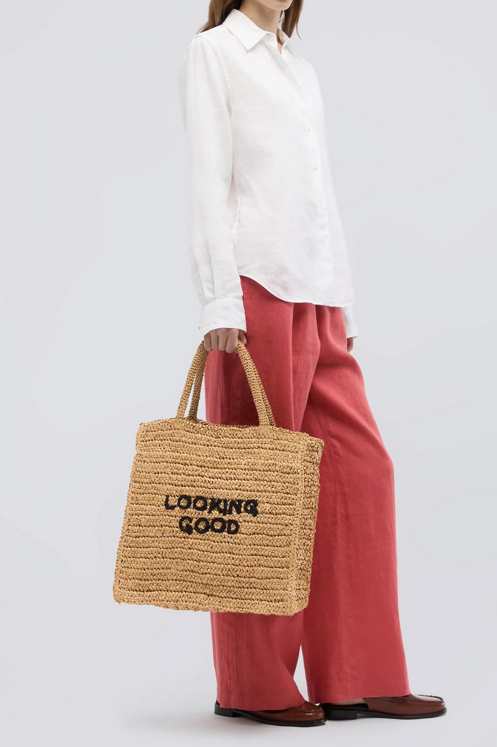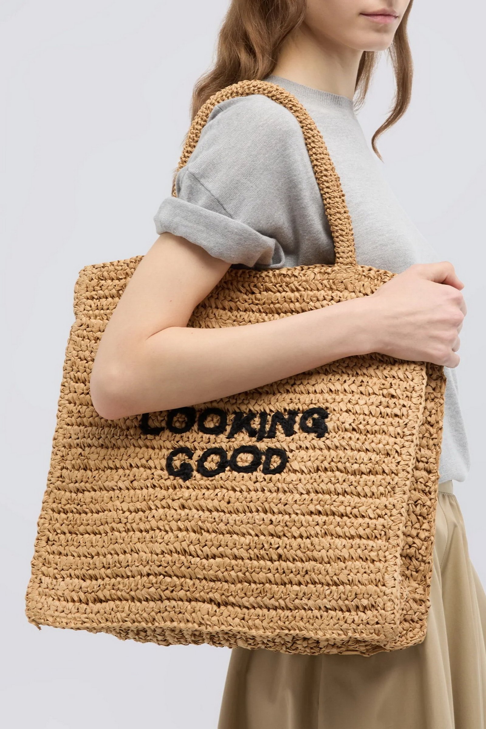 Borsa in raffia con logo ASPESI frontale e lettering -Feeling Right- sul retro. Fodera in nylon stampato.