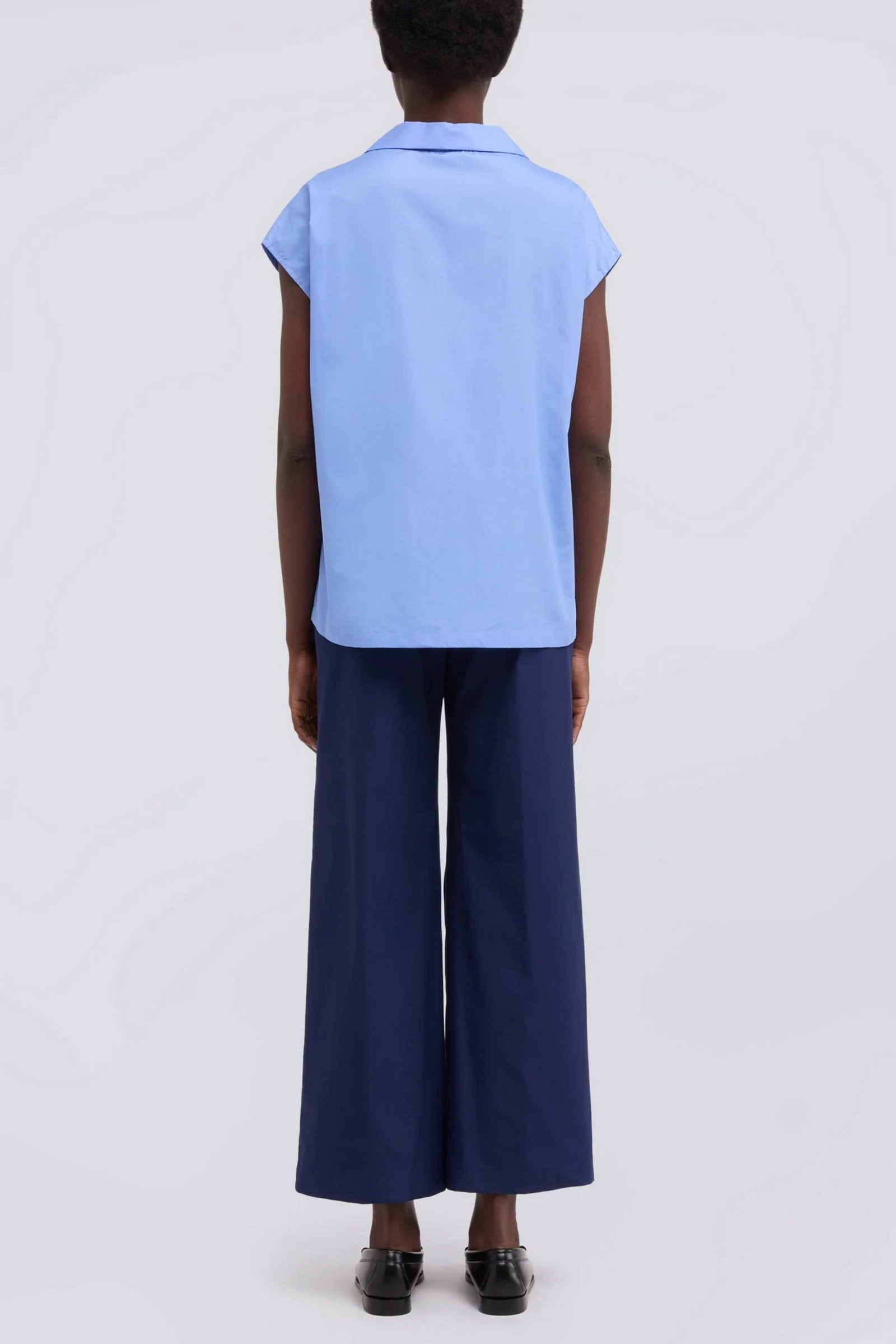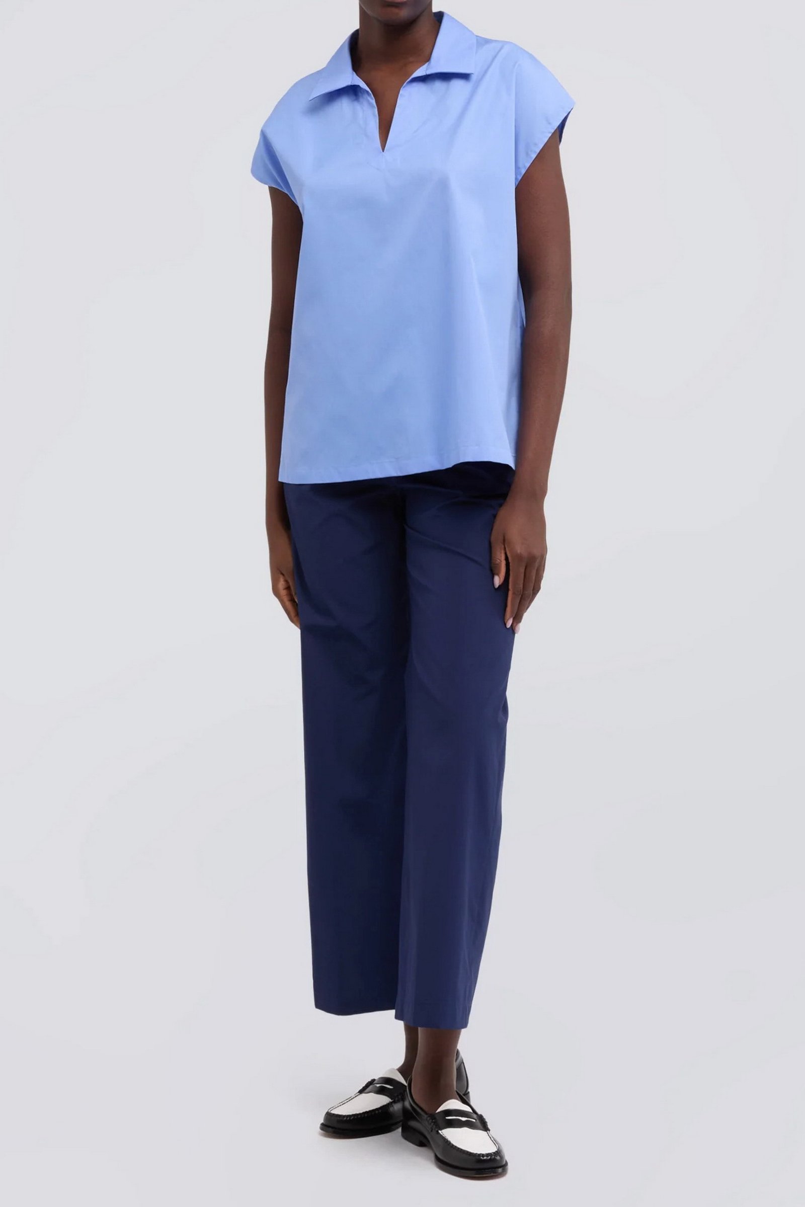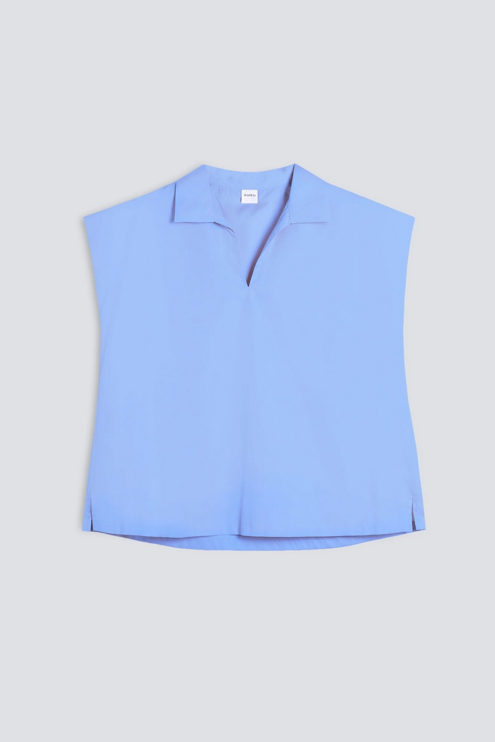 Top in popeline compatto. Collo classico con apertura a V centrale. Spalla scesa, senza maniche. Dettaglio di impuntura sullo scollo. Corpo a sacchetto con spacchetti laterali. Vestibilita regolare.