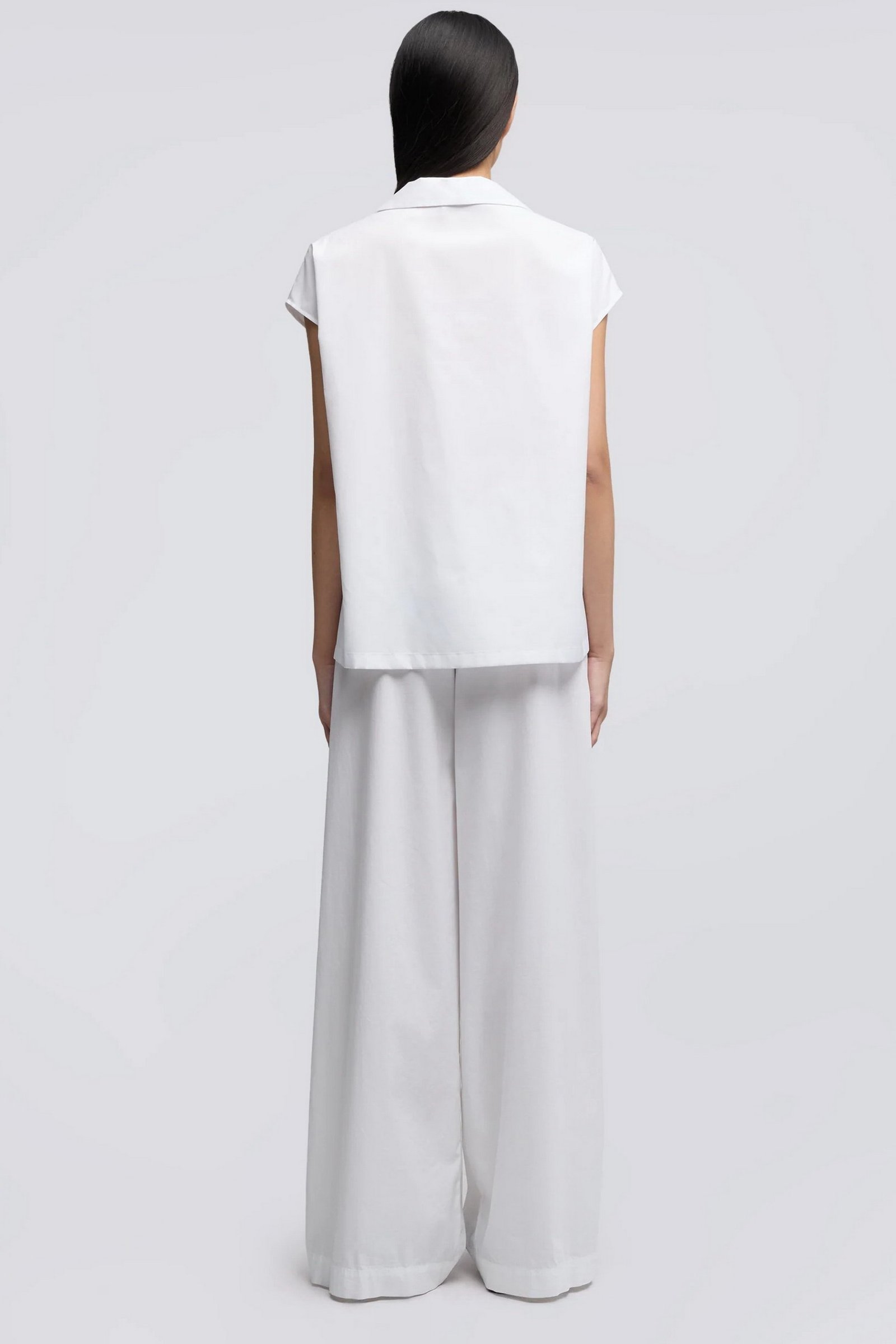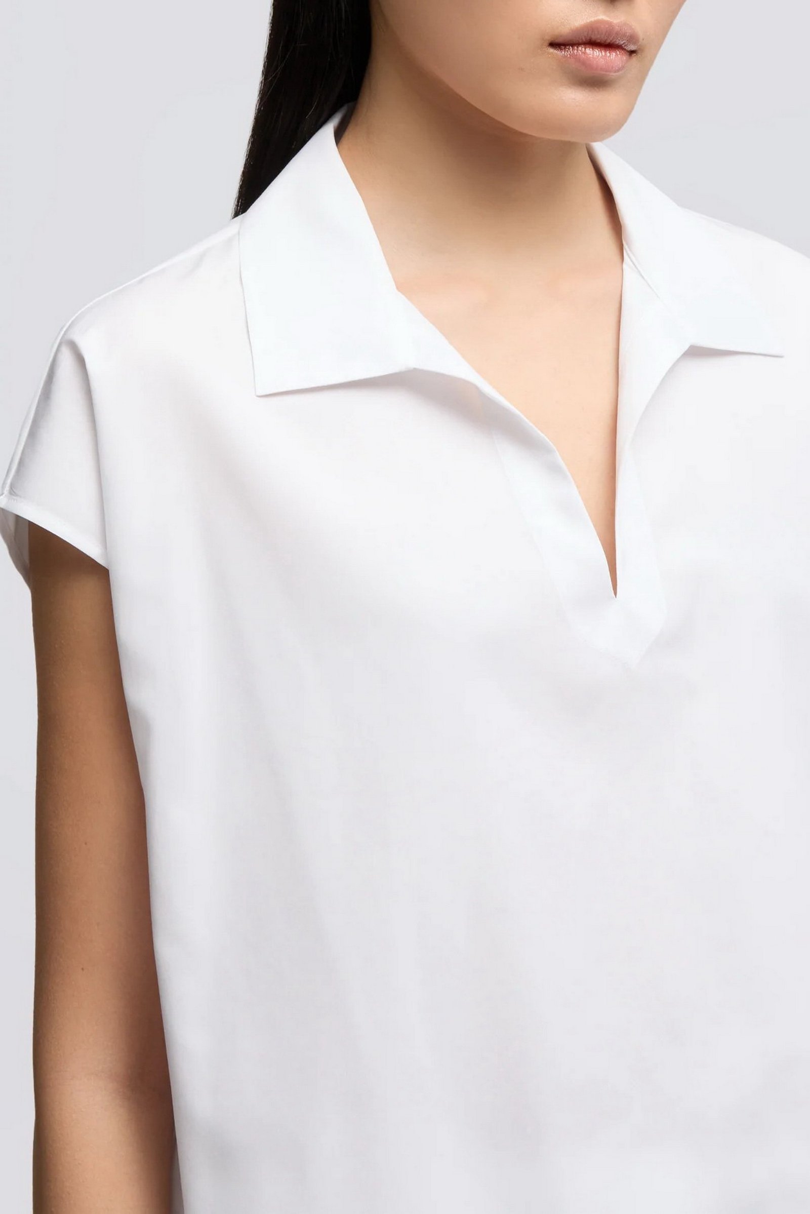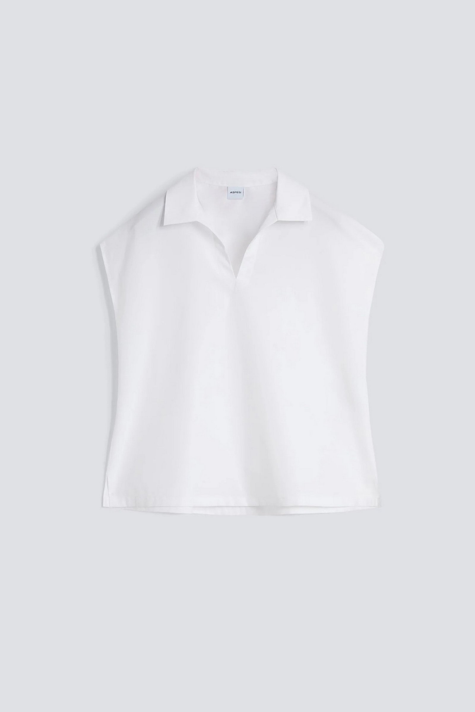 Top in popeline compatto. Collo classico con apertura a V centrale. Spalla scesa, senza maniche. Dettaglio di impuntura sullo scollo. Corpo a sacchetto con spacchetti laterali. Vestibilita regolare.
