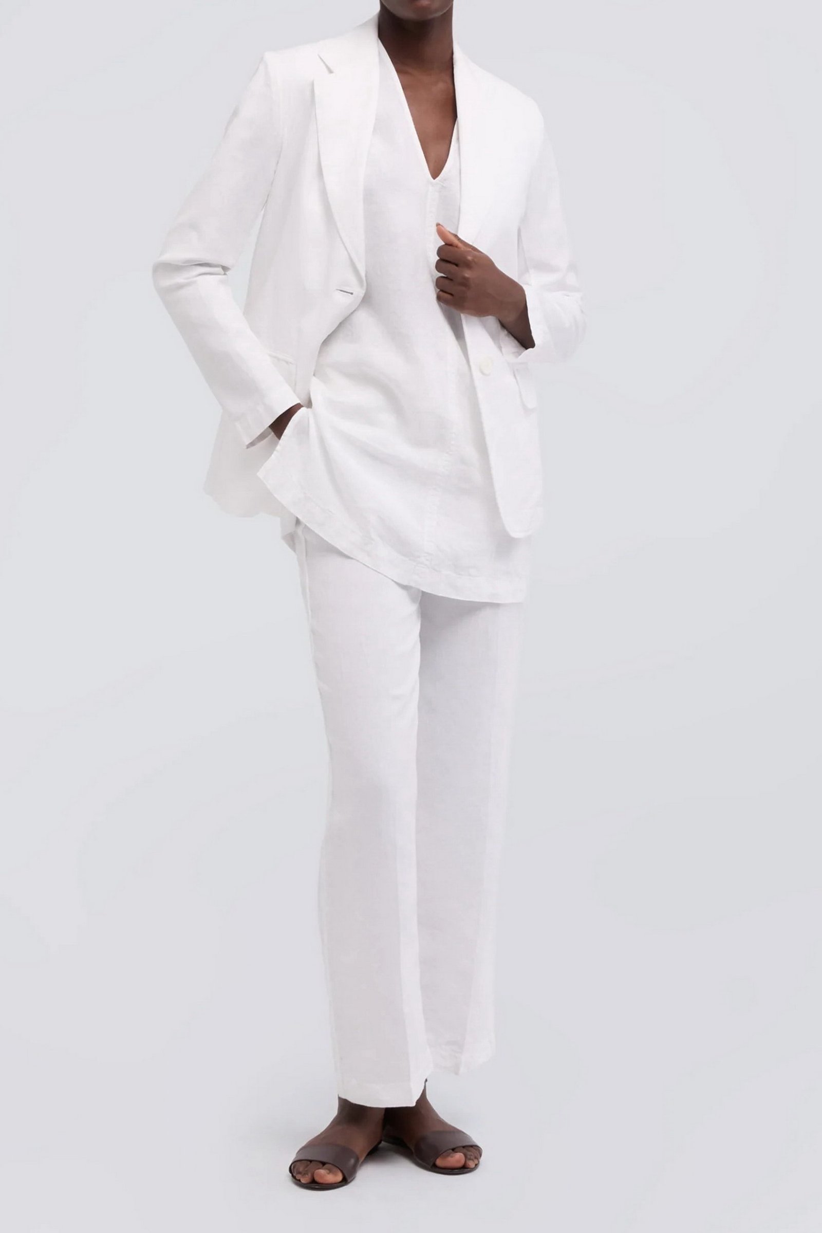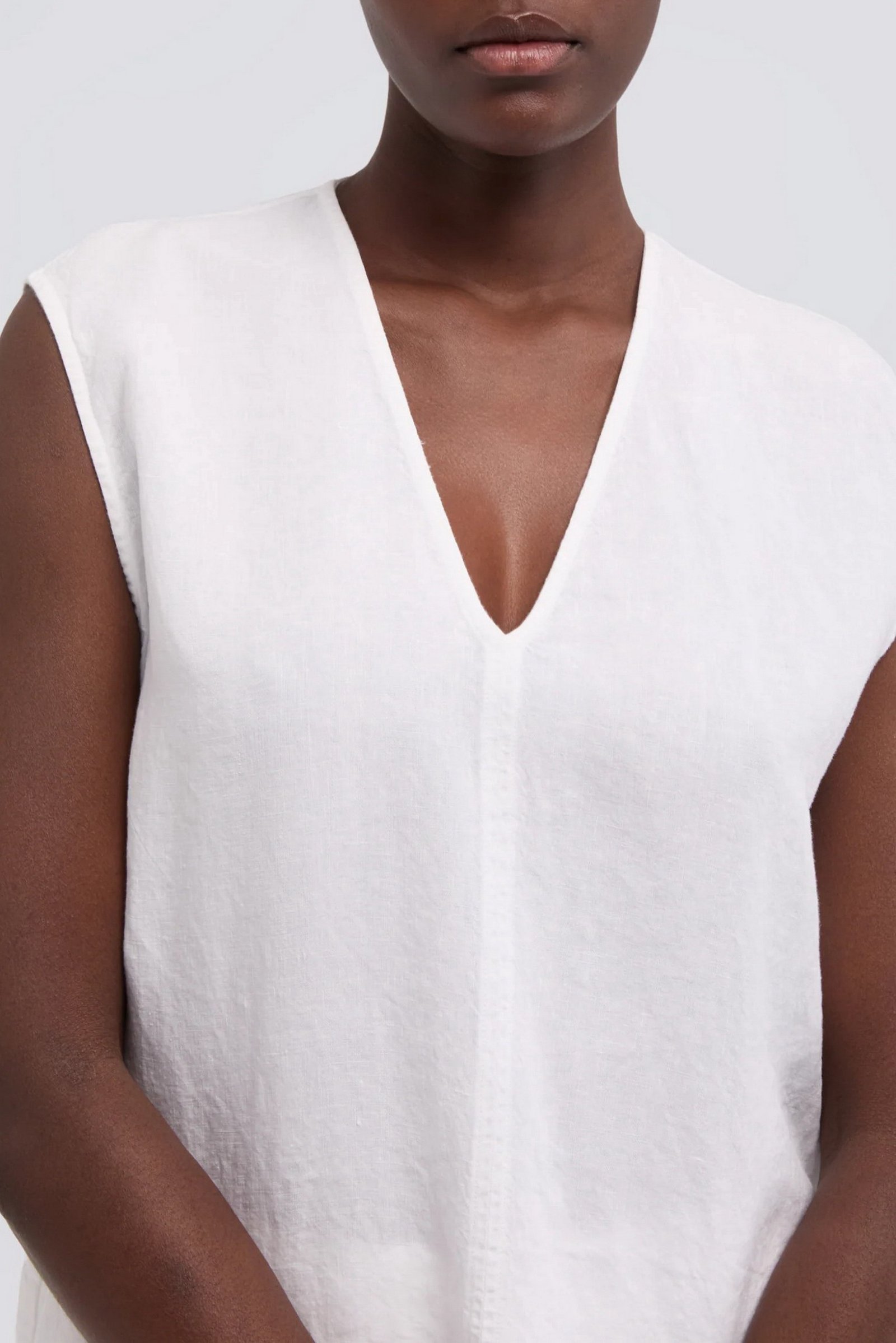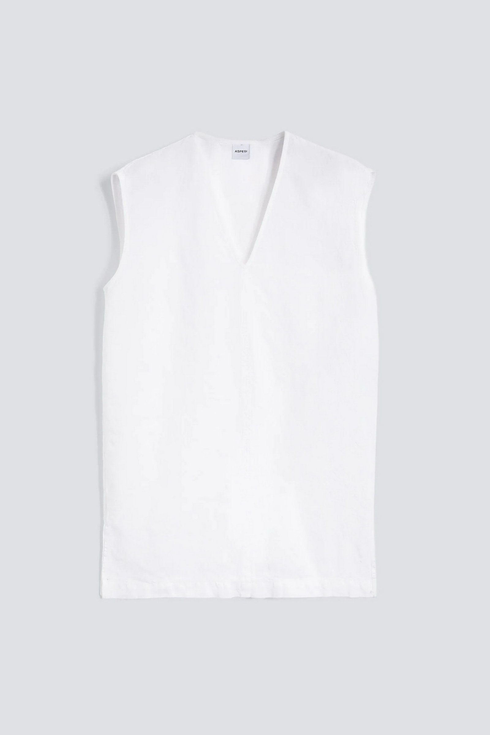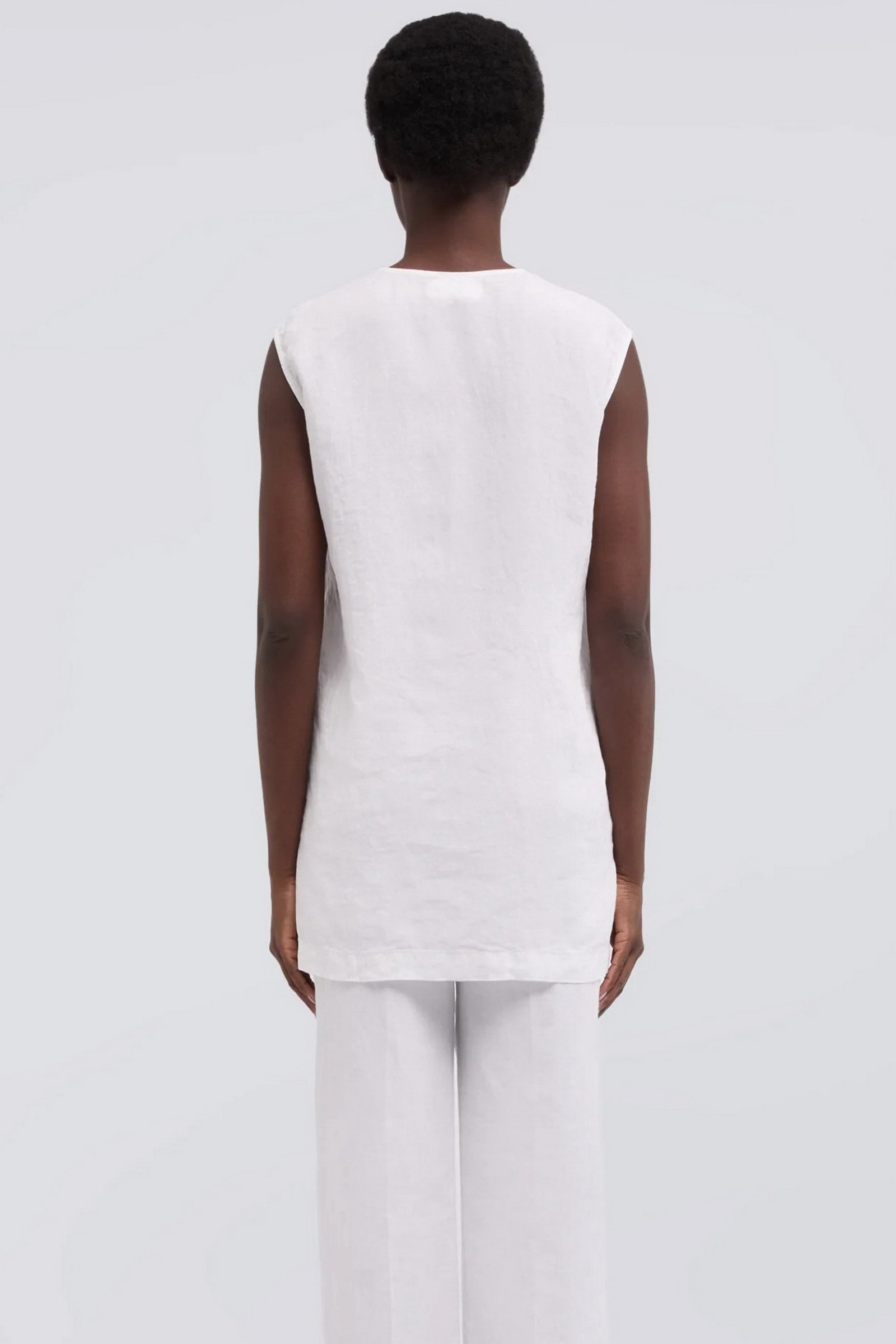 Top in tela di lino compatta tinto capo. Scollo a V, spalla scesa. Senza maniche. Taglio centrale sul davanti. Corpo a sacchetto con spacchi laterali. Vestibilita regolare.
