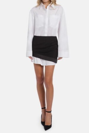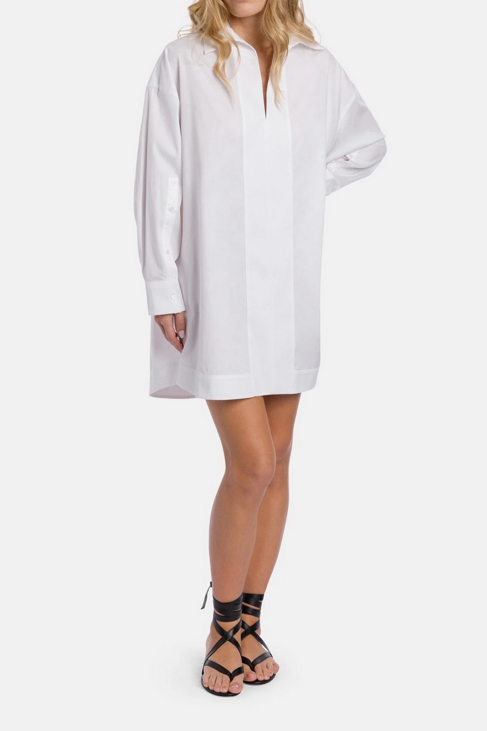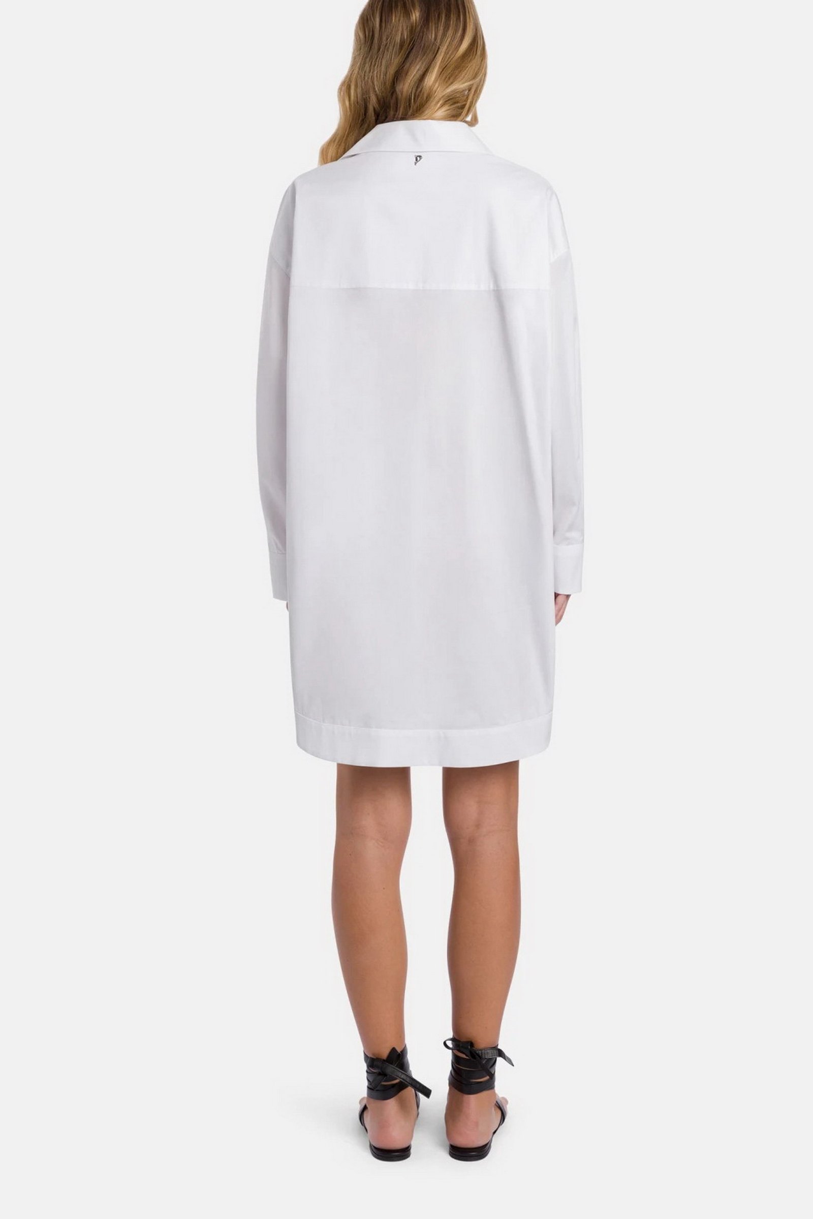 Abito corto a maniche lunghe con scollo a polo, bande doppie di tessuto al fondo e davanti. Gabardina tinto filo. Logo Dondup. Made in Italy