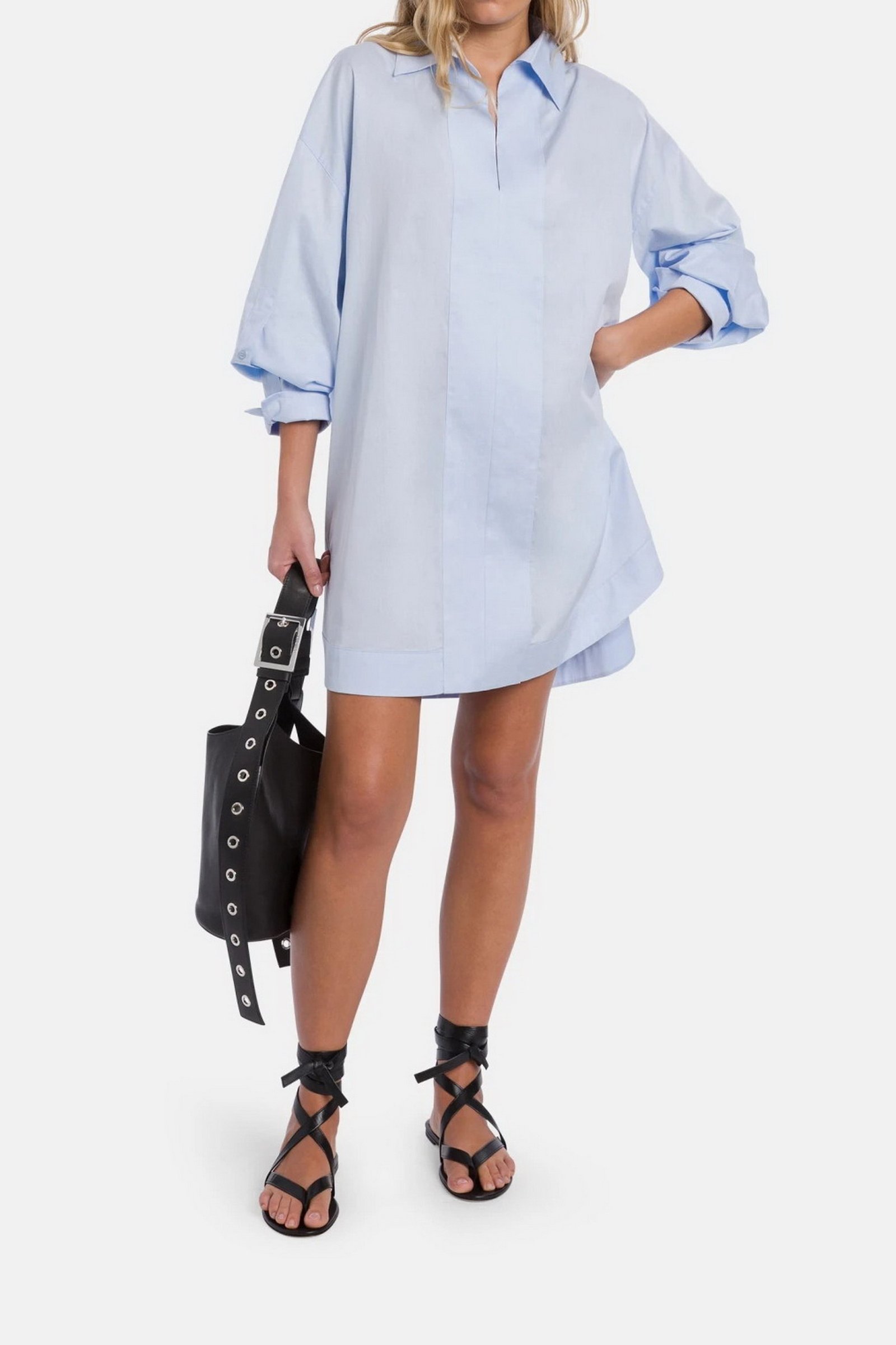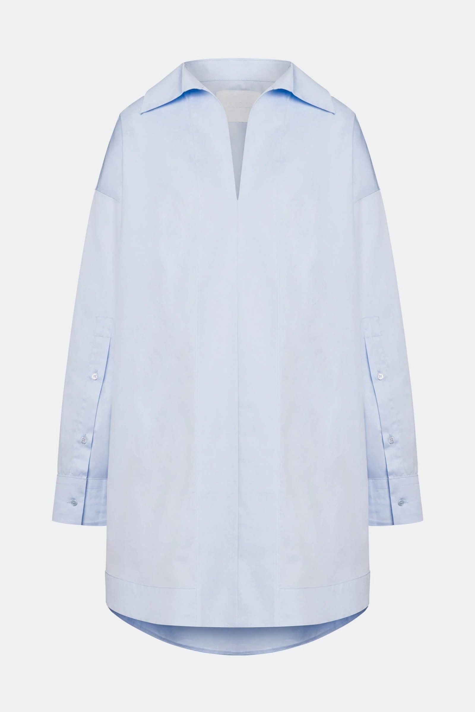 Abito corto a maniche lunghe con scollo a polo, bande doppie di tessuto al fondo e davanti. Gabardina tinto filo. Logo Dondup. Made in Italy