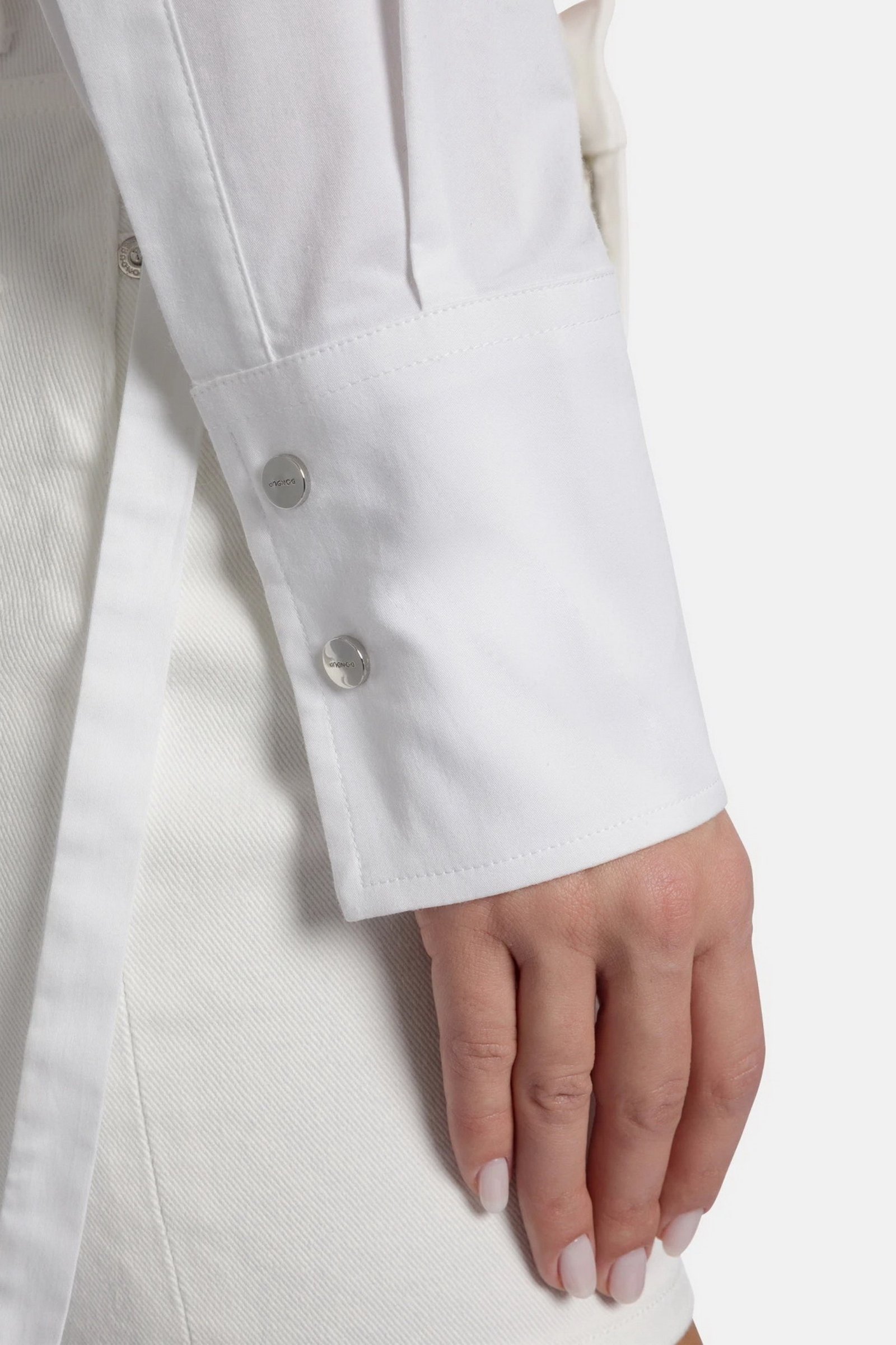 Abito corto a maniche lunghe con scollo a polo, bande doppie di tessuto al fondo e davanti. Gabardina tinto filo. Logo Dondup. Made in Italy