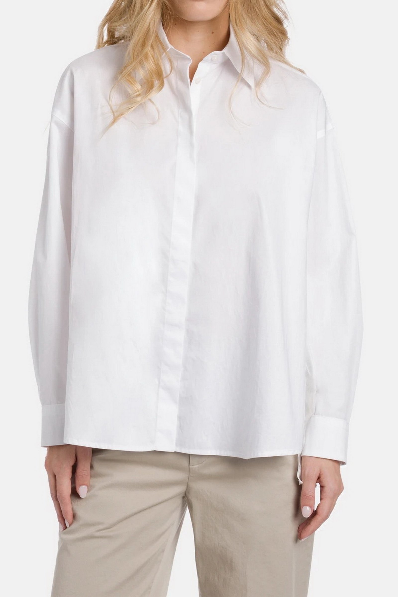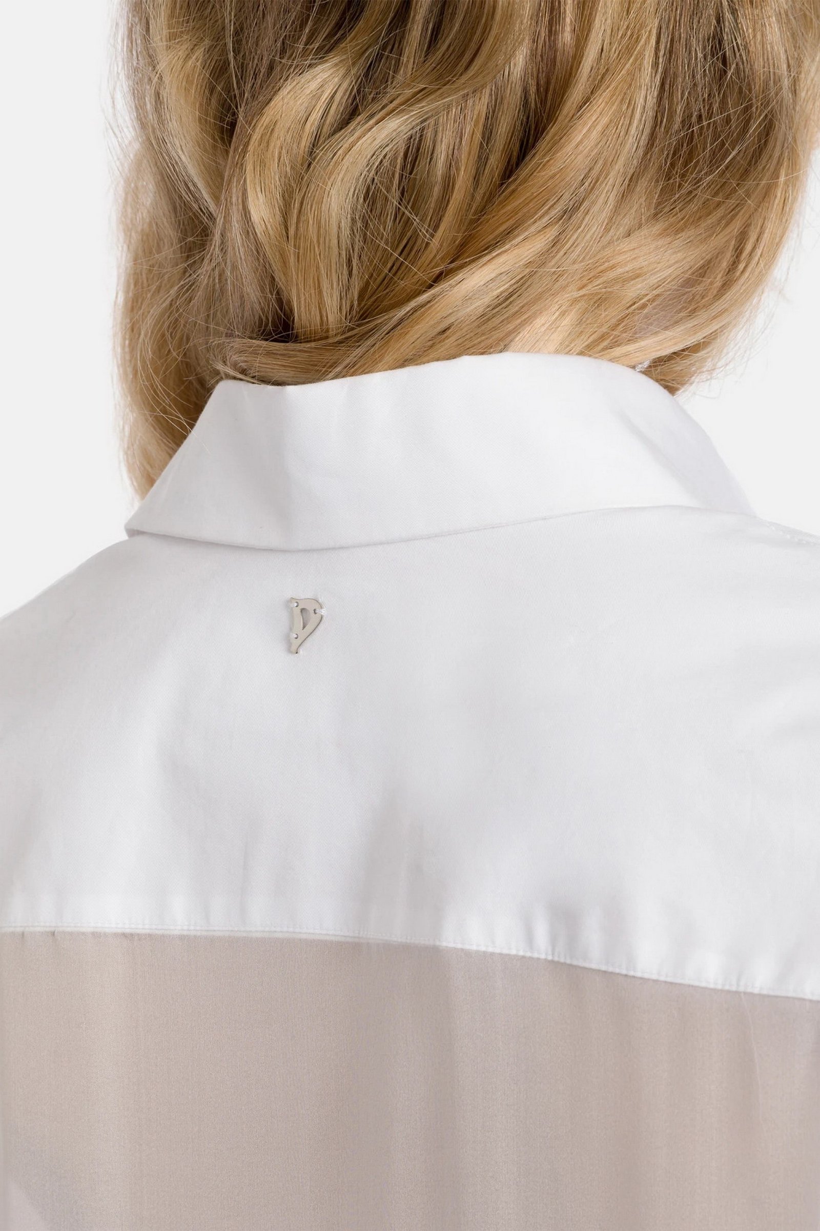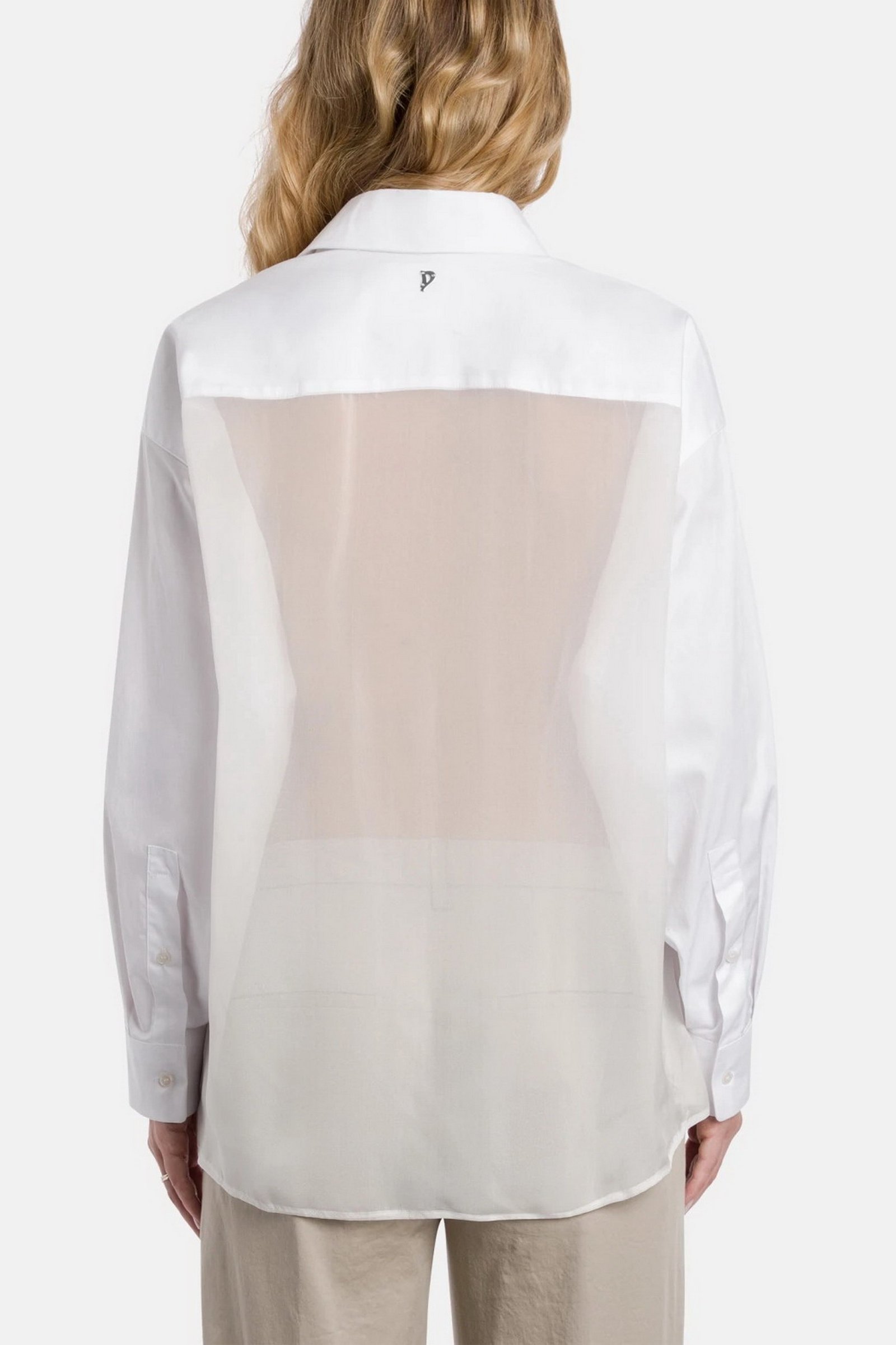 Camicia over a maniche lunghe con abbottonatura davanti nascosta e dietro in voile. Gabardina tinto filo. Logo Dondup. Made in Italy