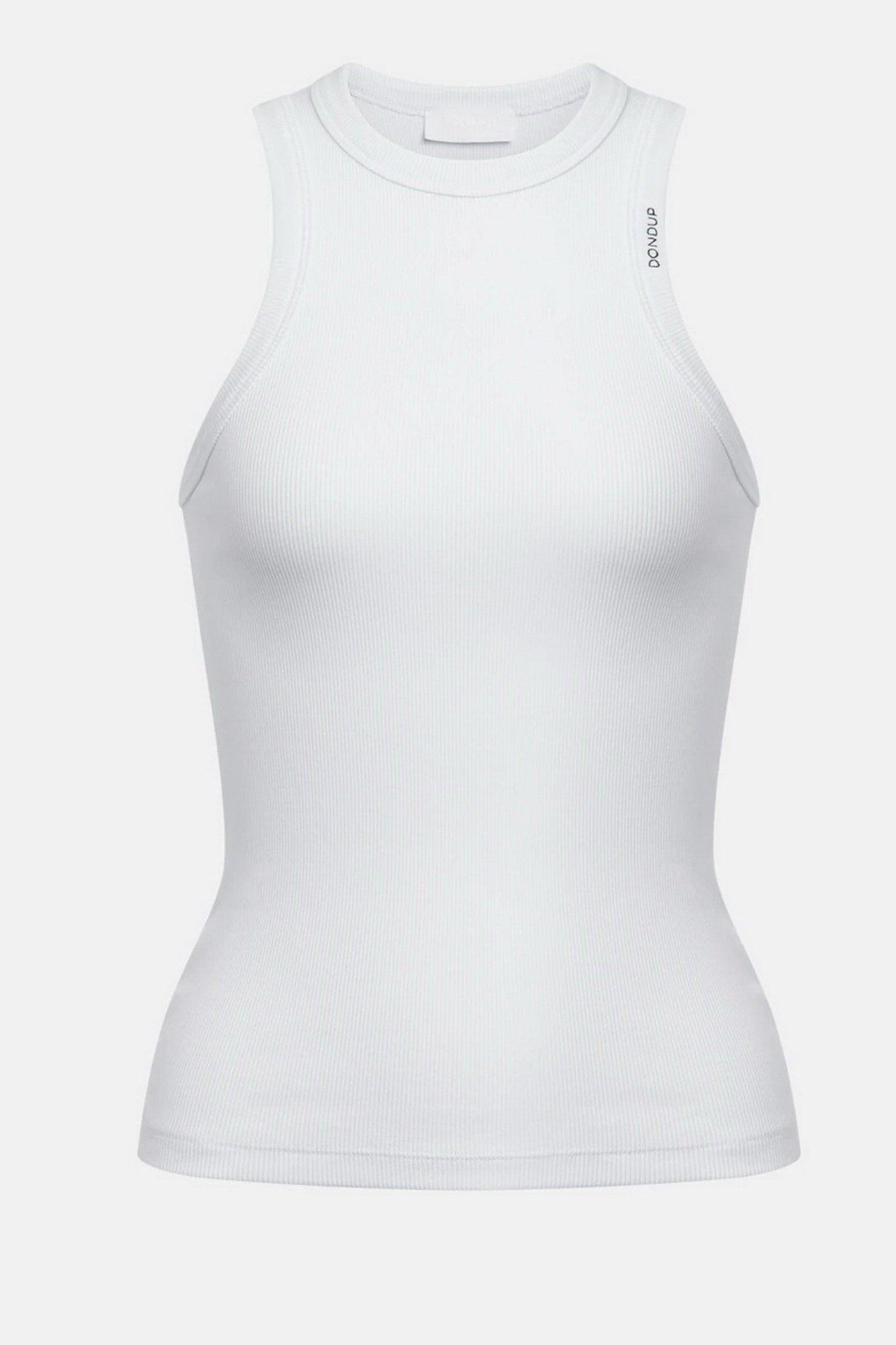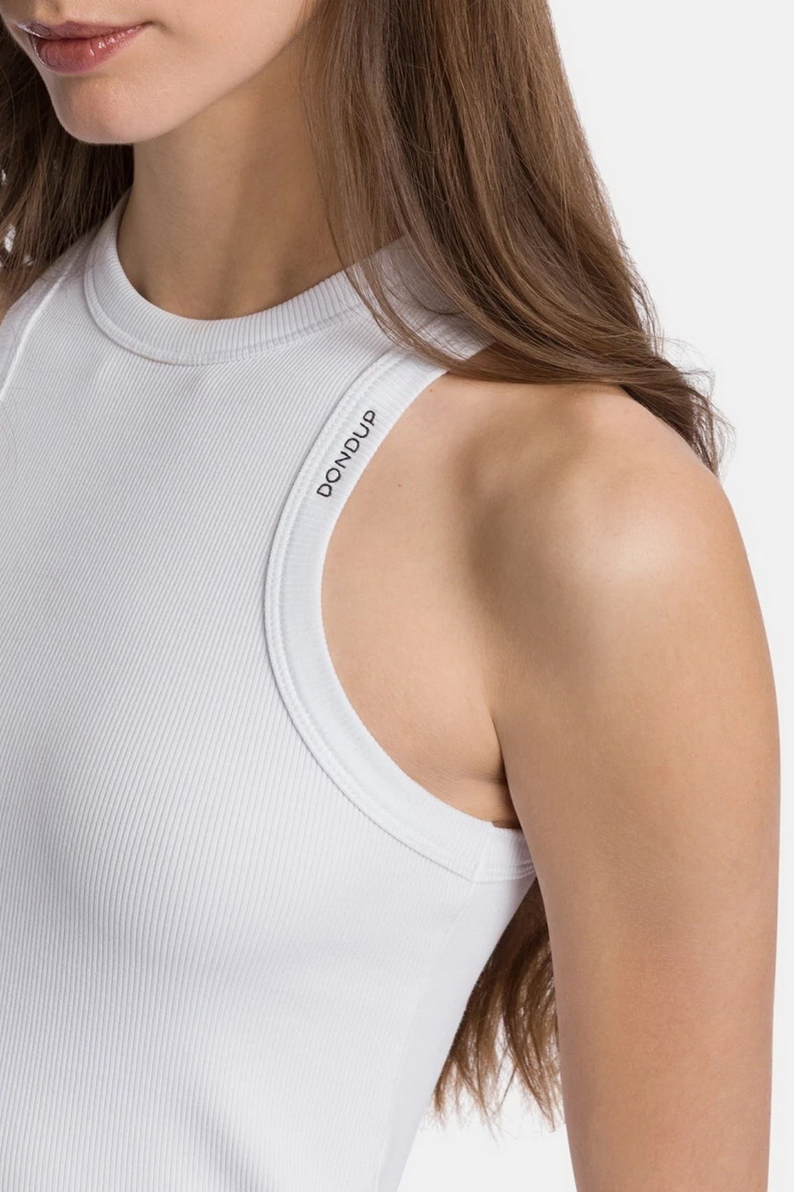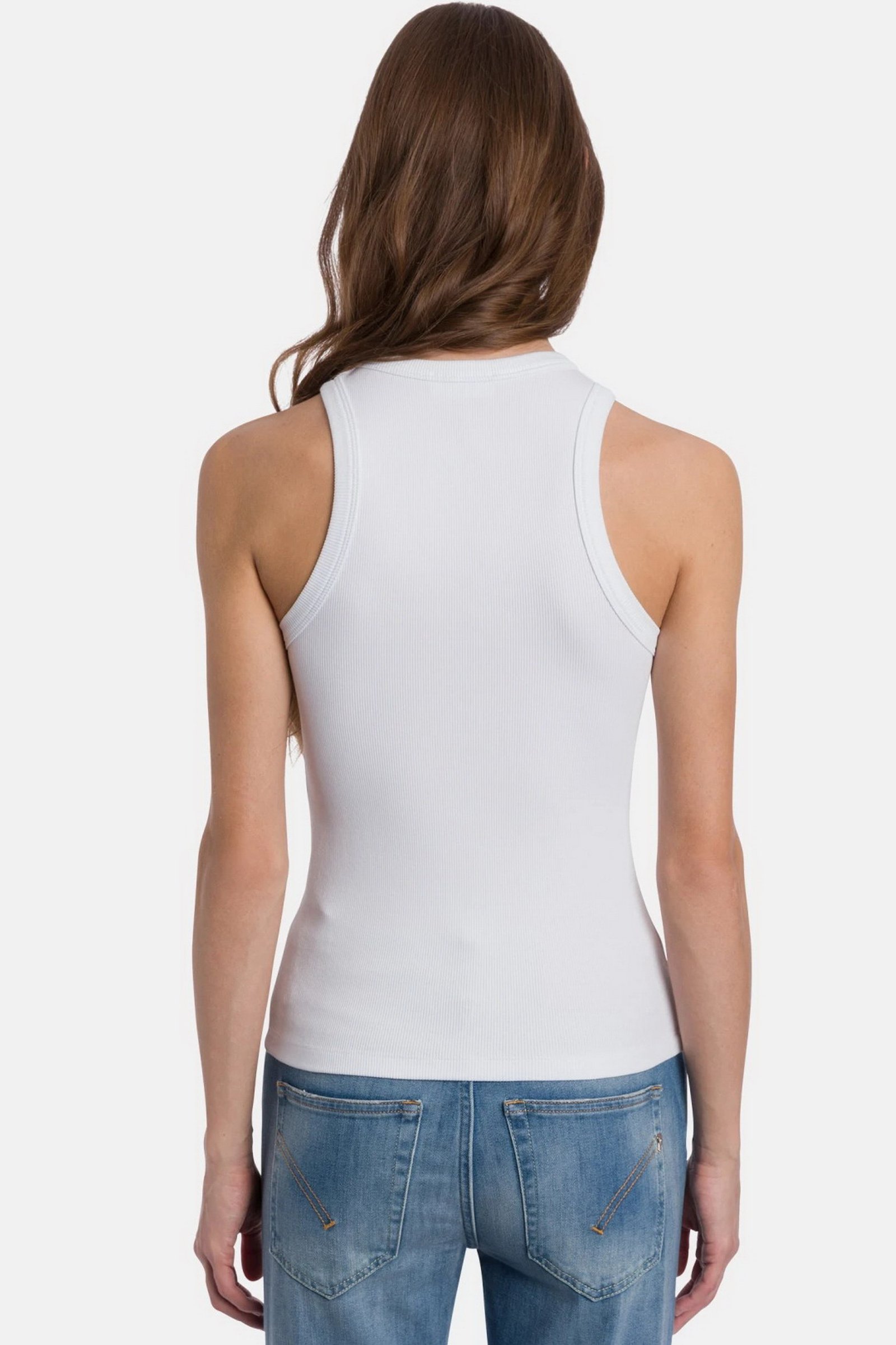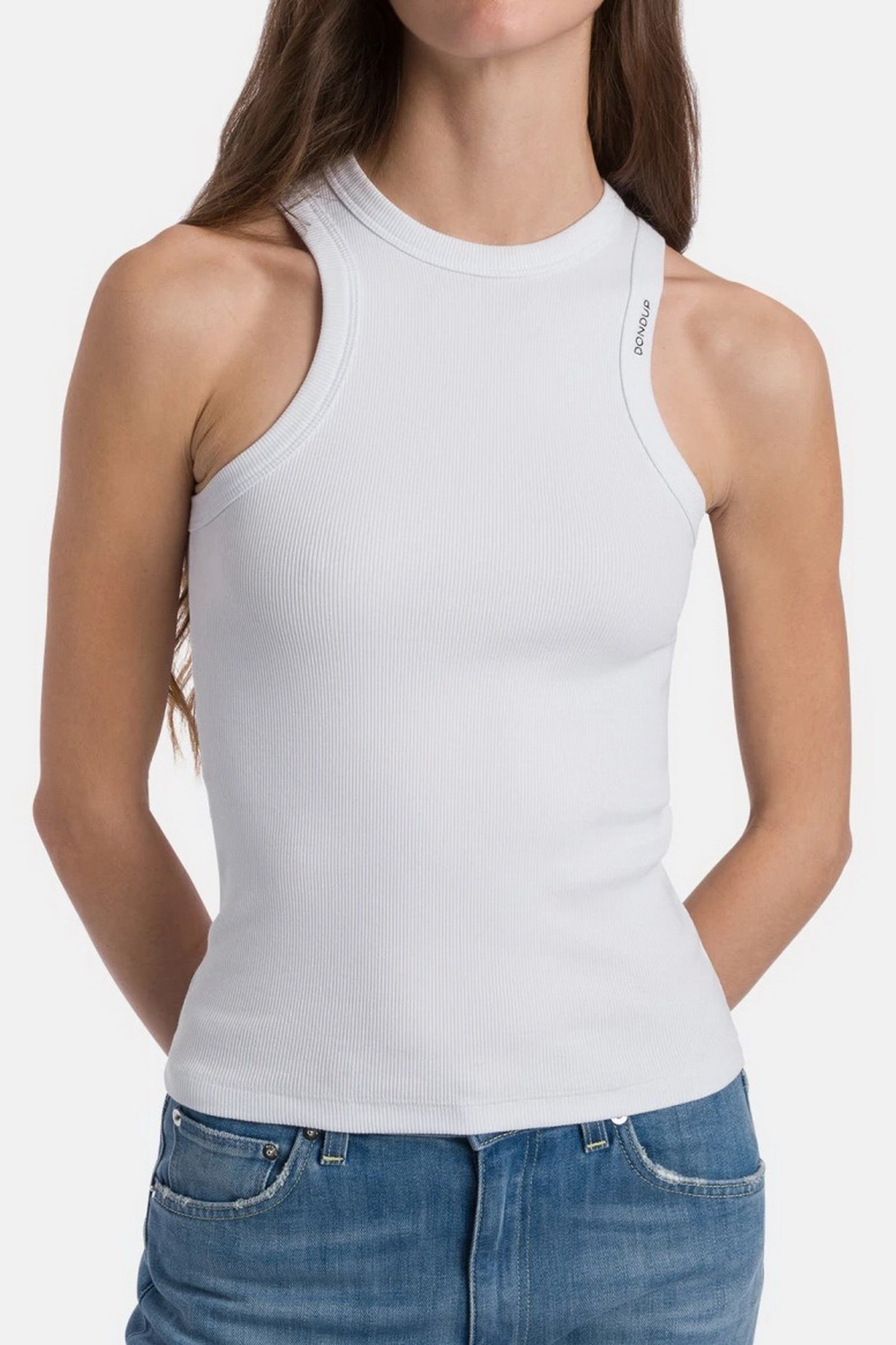 Canotta girocollo slim con scollo all’americana e logo ricamato sulla spalla sinista. Costina di cotone. Logo Dondup. Made in Italy