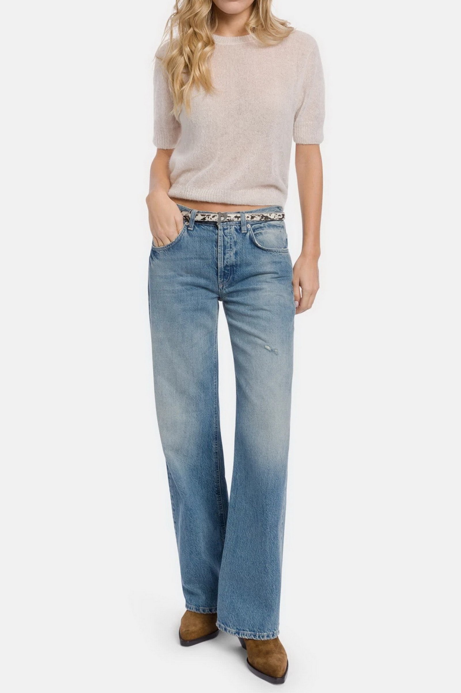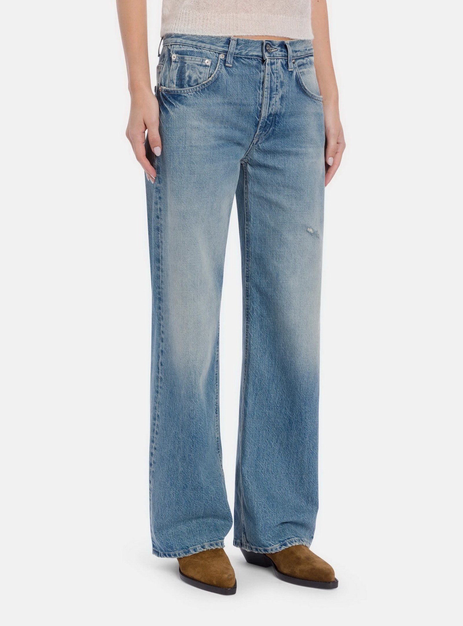 Jeans Jacklyn cinque tasche wide leg fit, vita bassa, gamba a palazzo. Denim fisso sale pepe blu 13 oz. Lavaggio vintage chiaro con rotture. Logo Dondup. Made in Italy