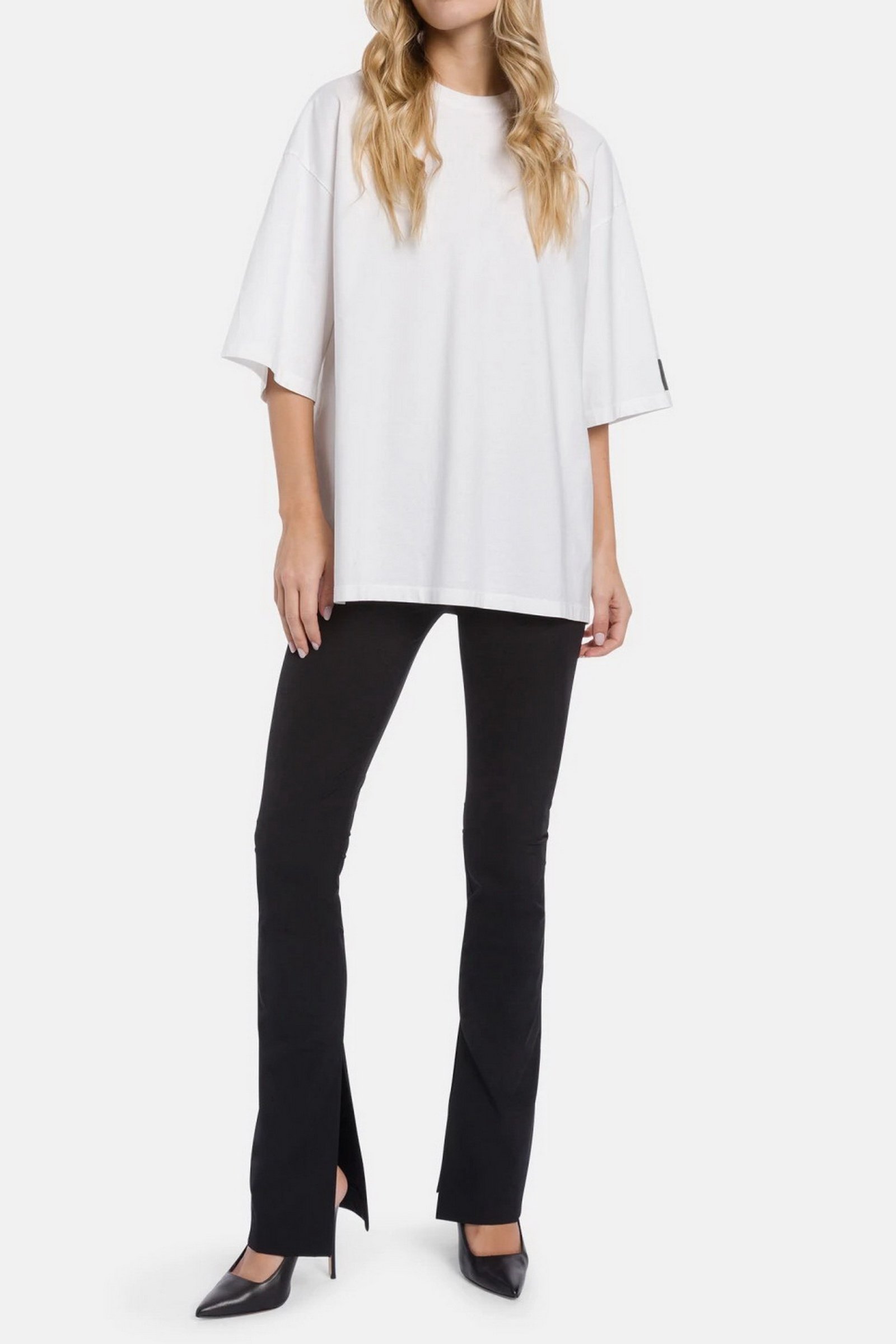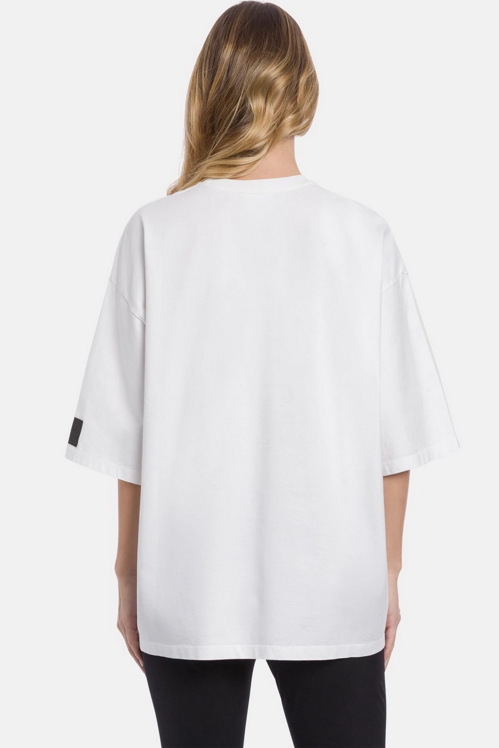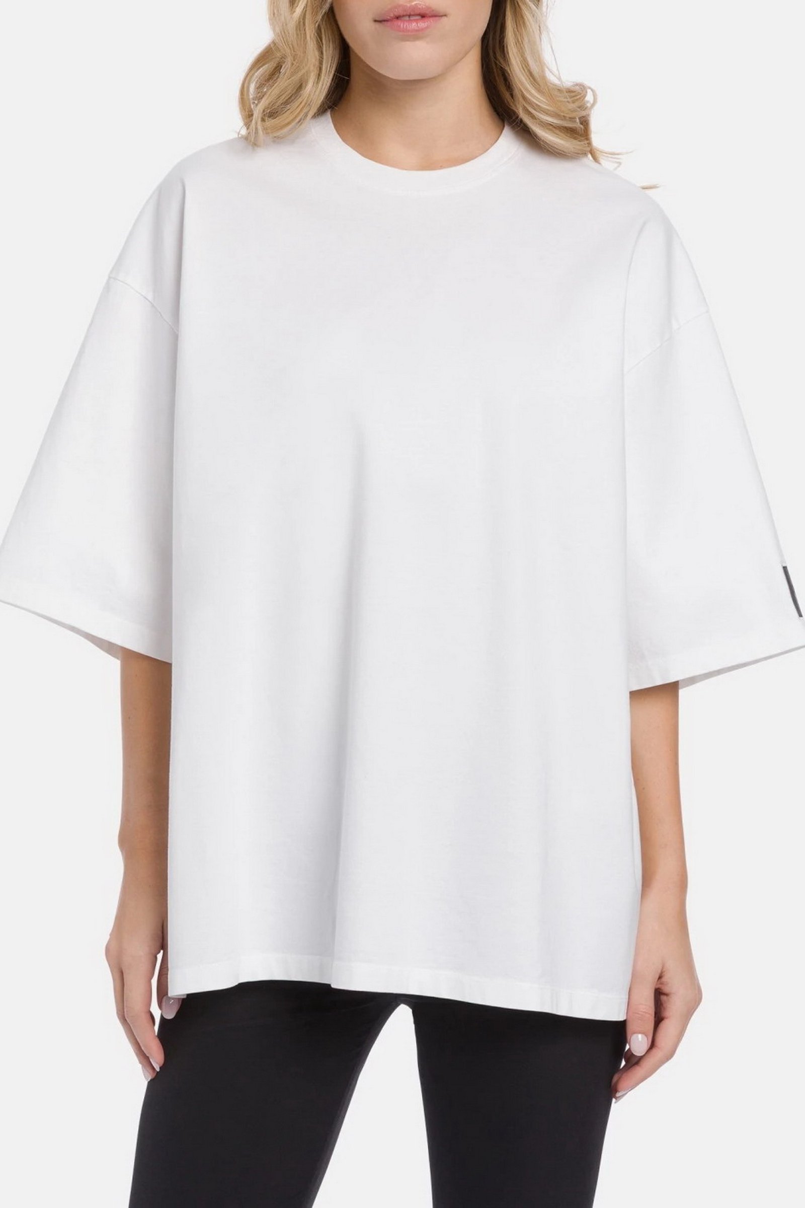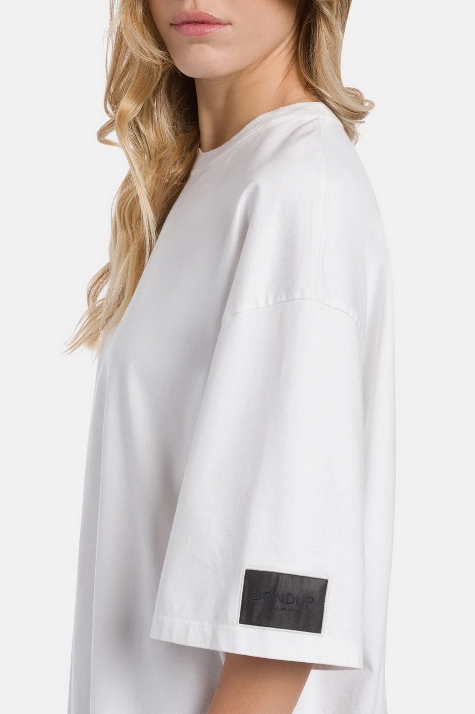 T-shirt girocollo over a maniche corte con etichetta grande sulla manica sinistra. Jersone. Logo Dondup. Made in Italy