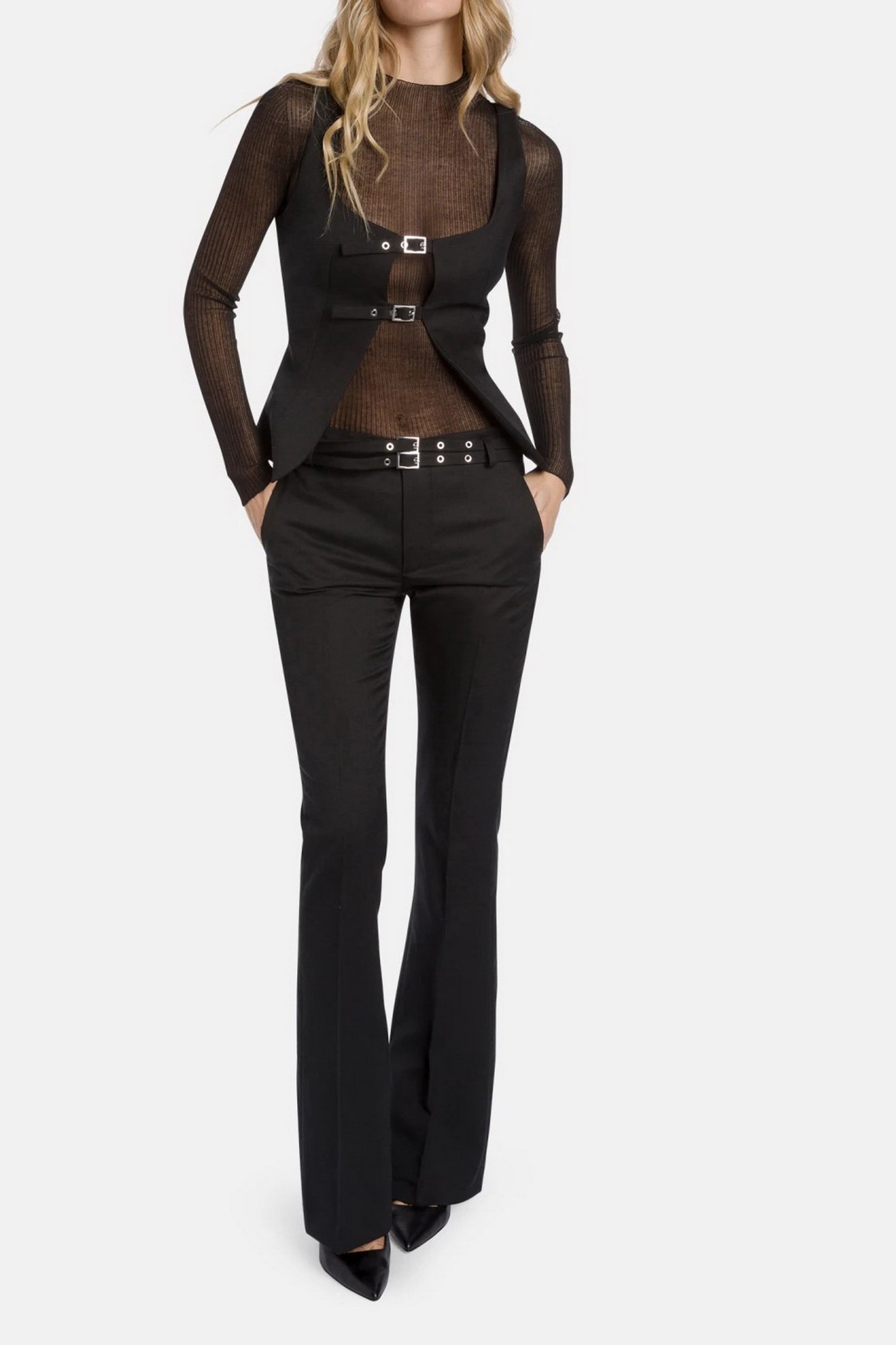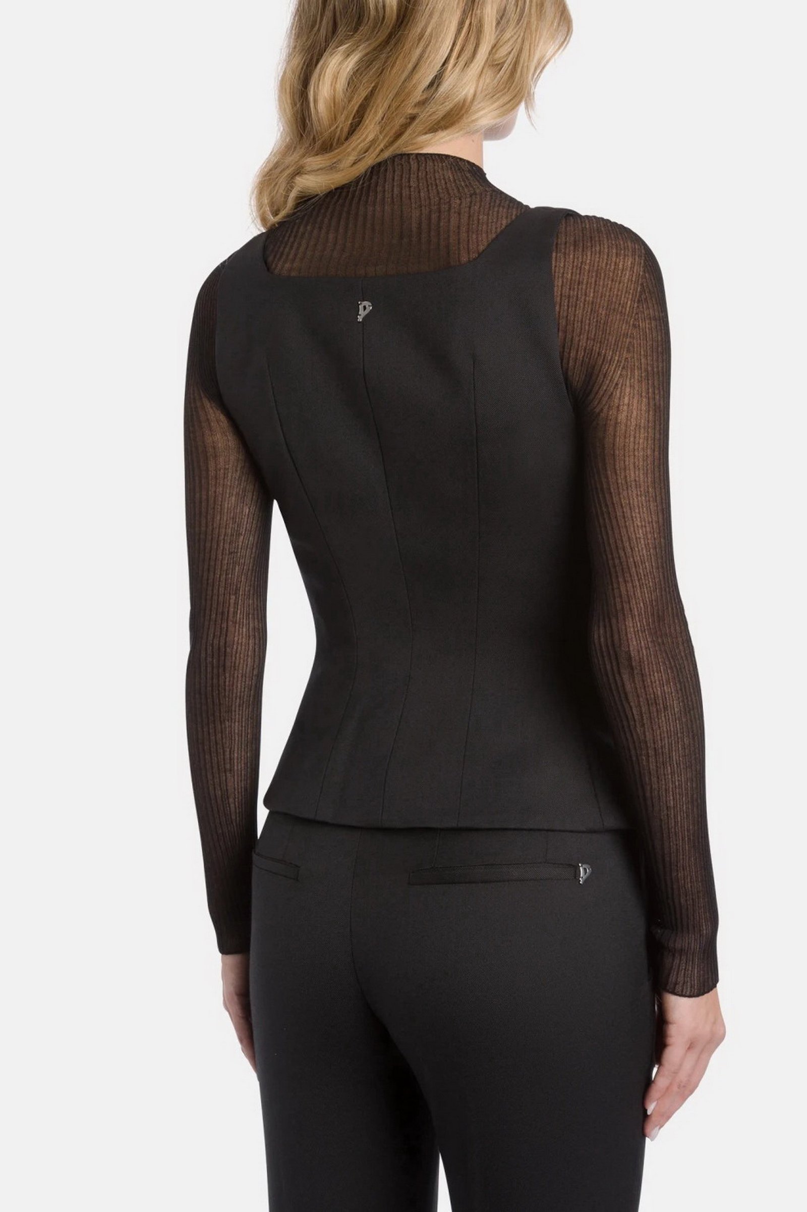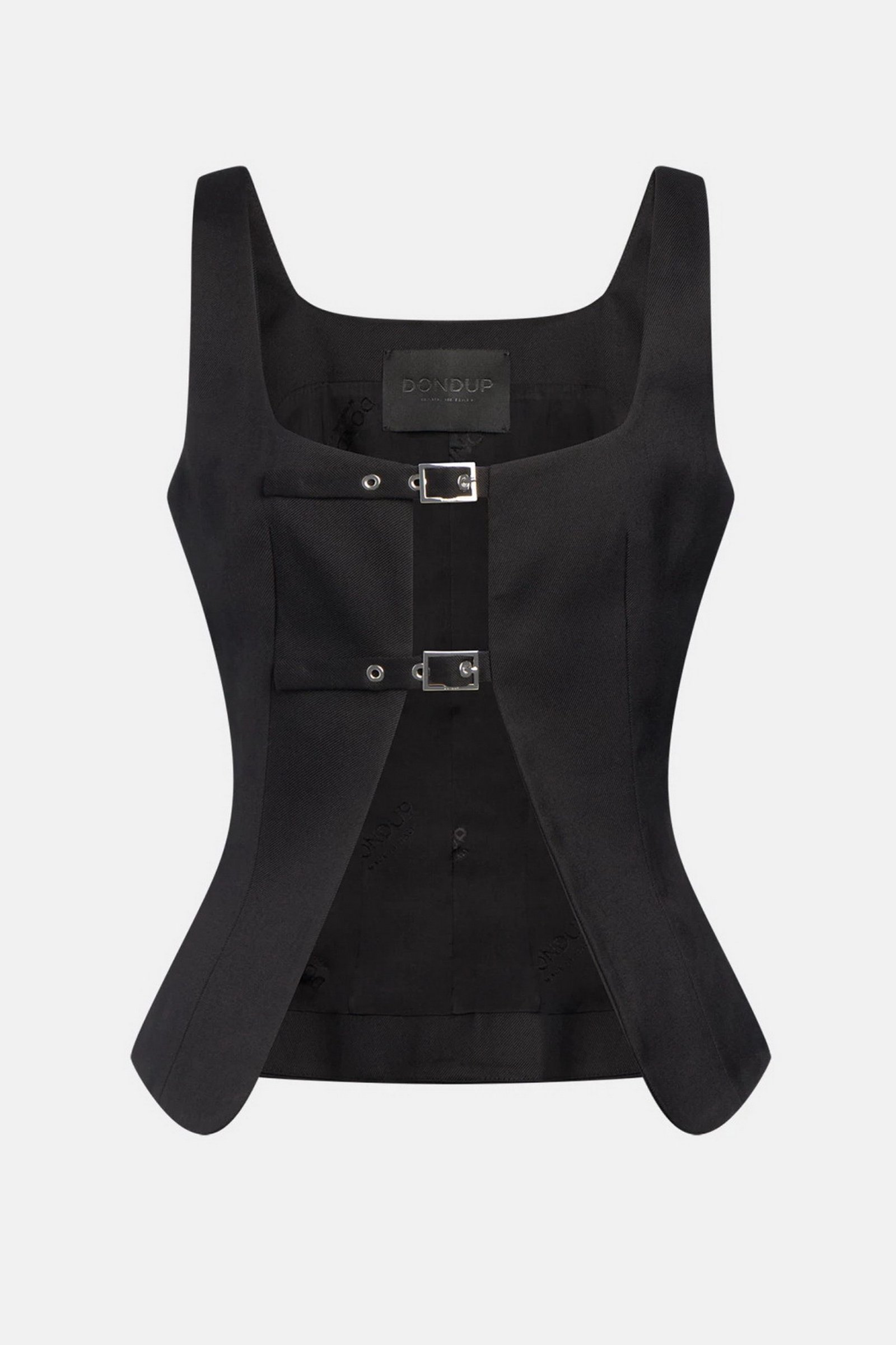 Top slim senza maniche allacciato davanti con fibbie e occhielli. Cover misto lana stretch. Logo Dondup. Made in Italy