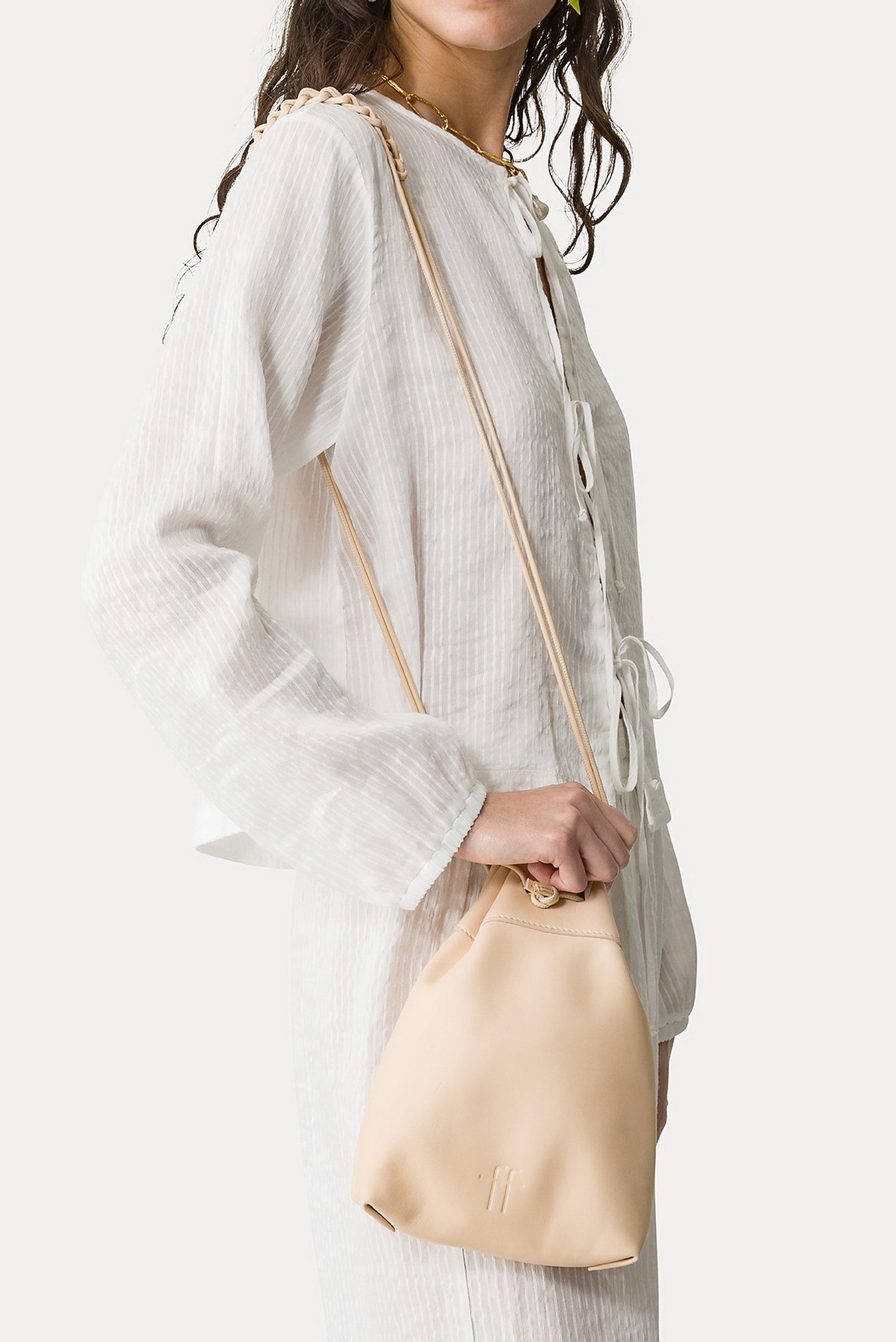 forme semplici e nuance polverose, la borsa a secchiello piatto si indossa con un gesto veloce e permette di portare con sé tutto l’essenziale. dall’aperitivo all’ufficio, con la stessa delicata nonchalance.