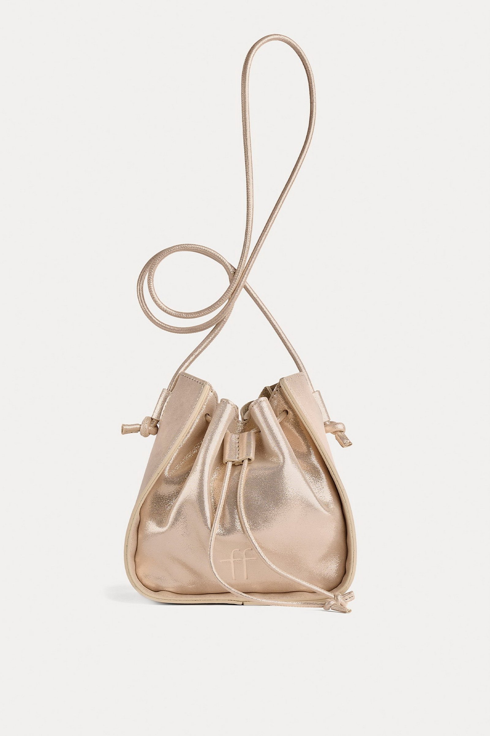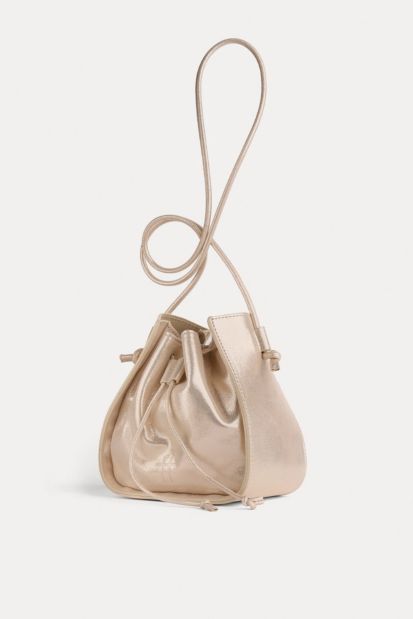 borsa secchiello piccola dalle forme morbide e dal mood metropolitano. realizzata in vitello laminato e scintillante, si chiude con coulisse e nastro in pelle per contenere gli effetti personali e gli oggetti più cari. la borsa secchiello piccola si indossa a spalla o cross body grazie alla sua tracollina coordinata.
