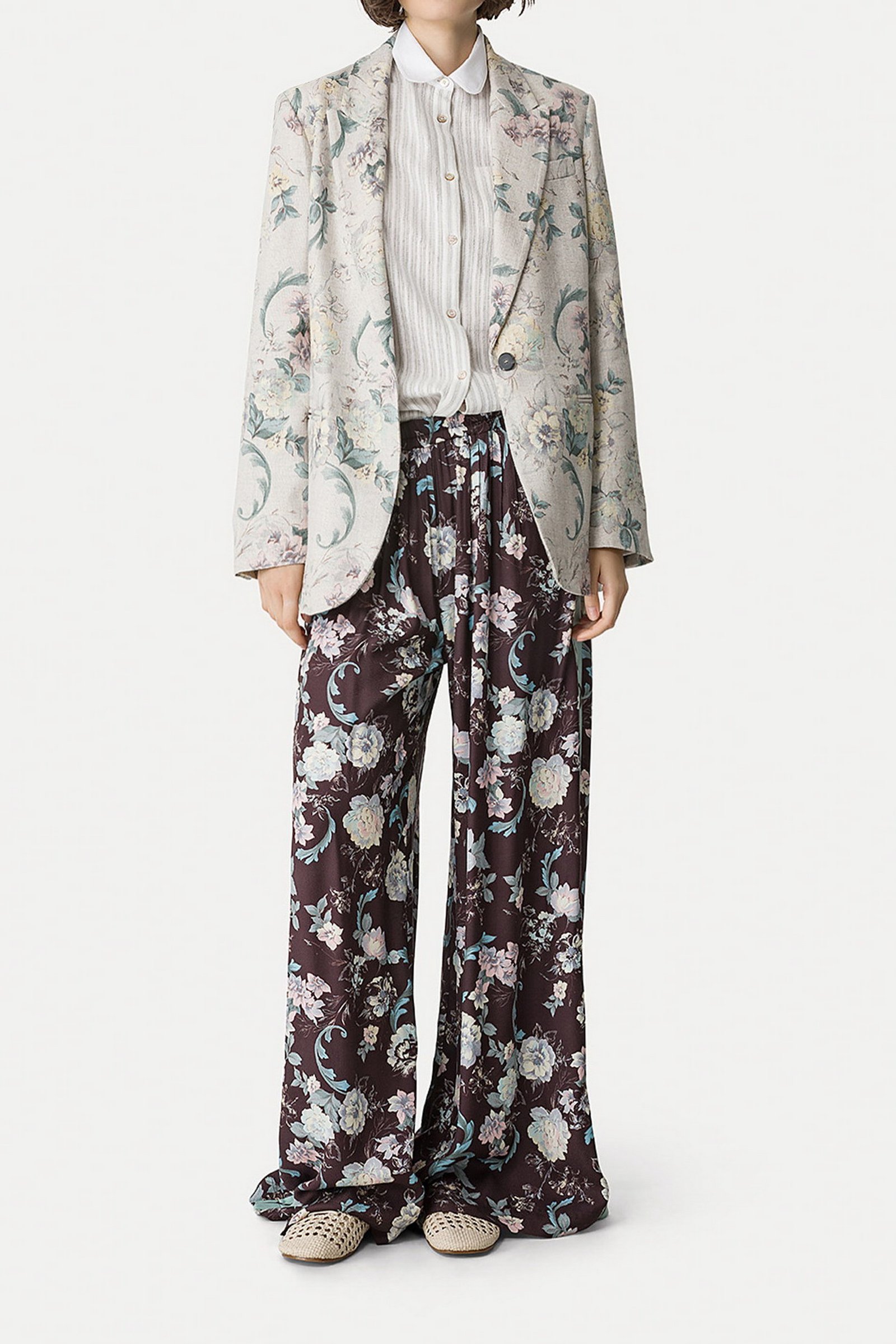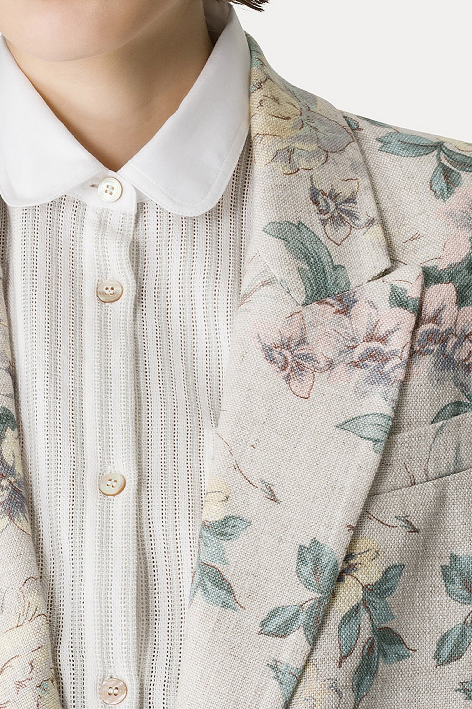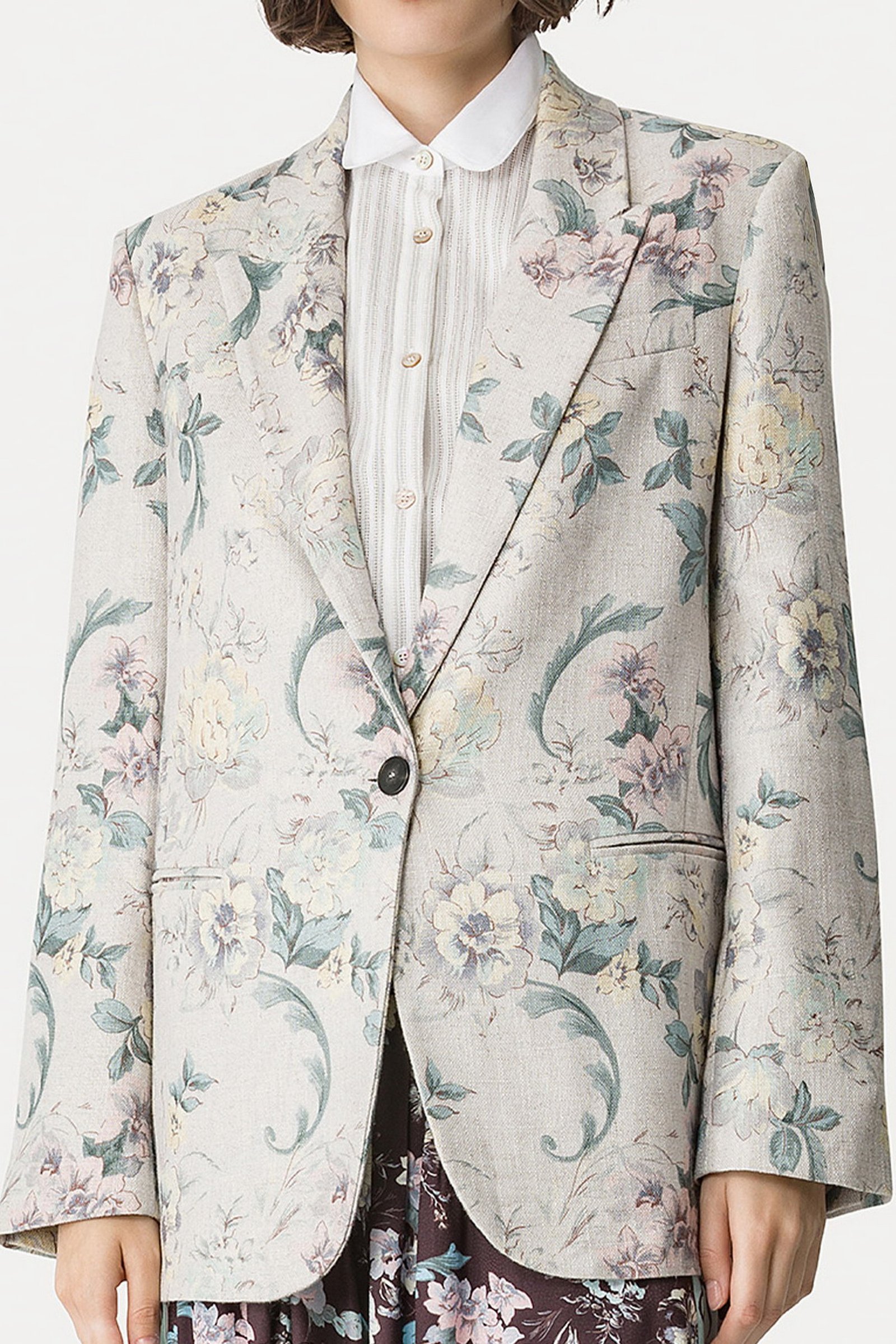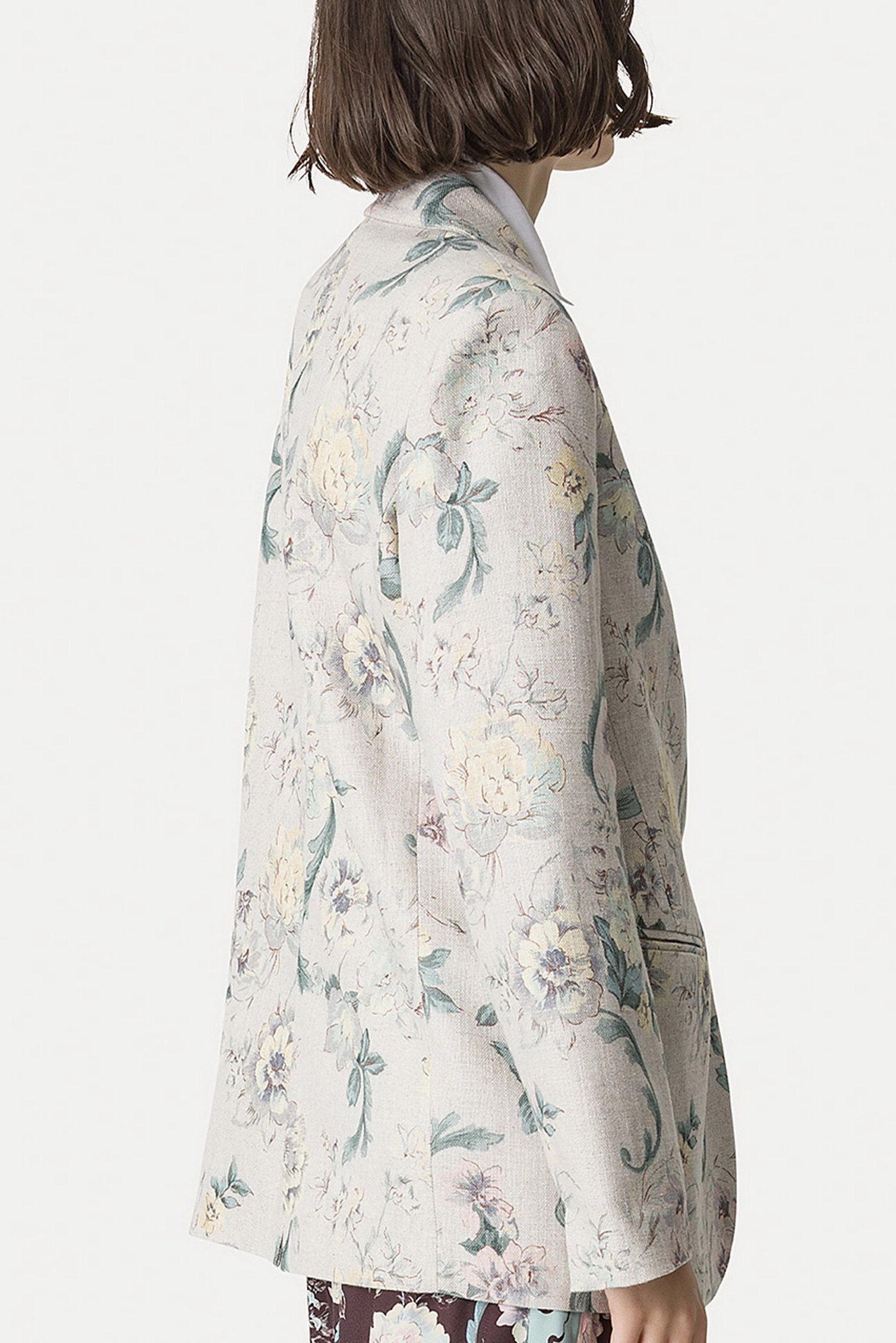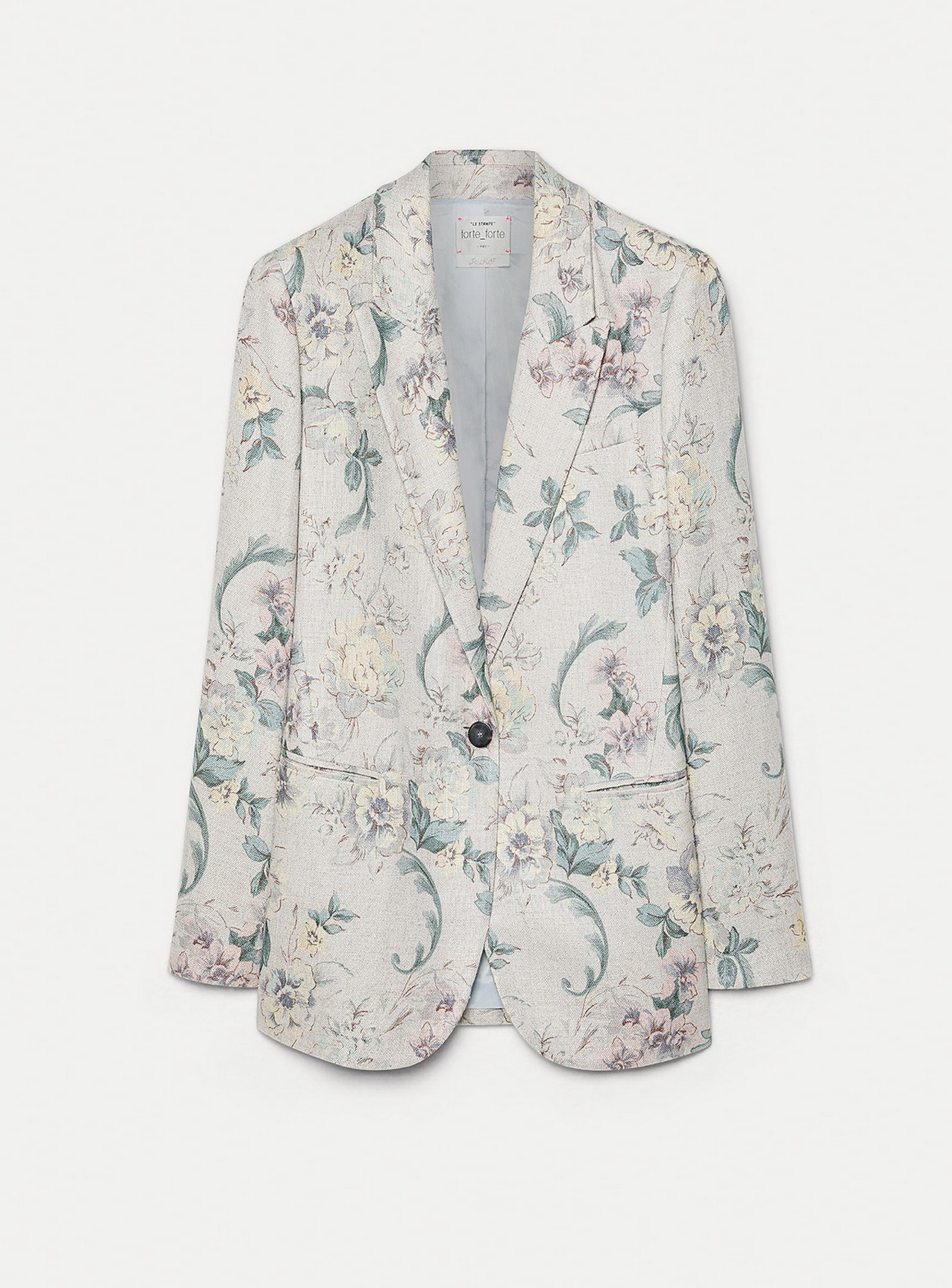 la matericità ricca del lino e viscosa trasforma questa giacca in misto lino in un pezzo perfettamente inserito nella visione estetica forte_forte. decorata con il motivo “peonia my love” emana leggerezza e femminilità, mentre le spalle leggermente imbottite e lo spacco posteriore aggiungono dettagli sartoriali ad una giacca in hopsack pensata per una primavera fiorita