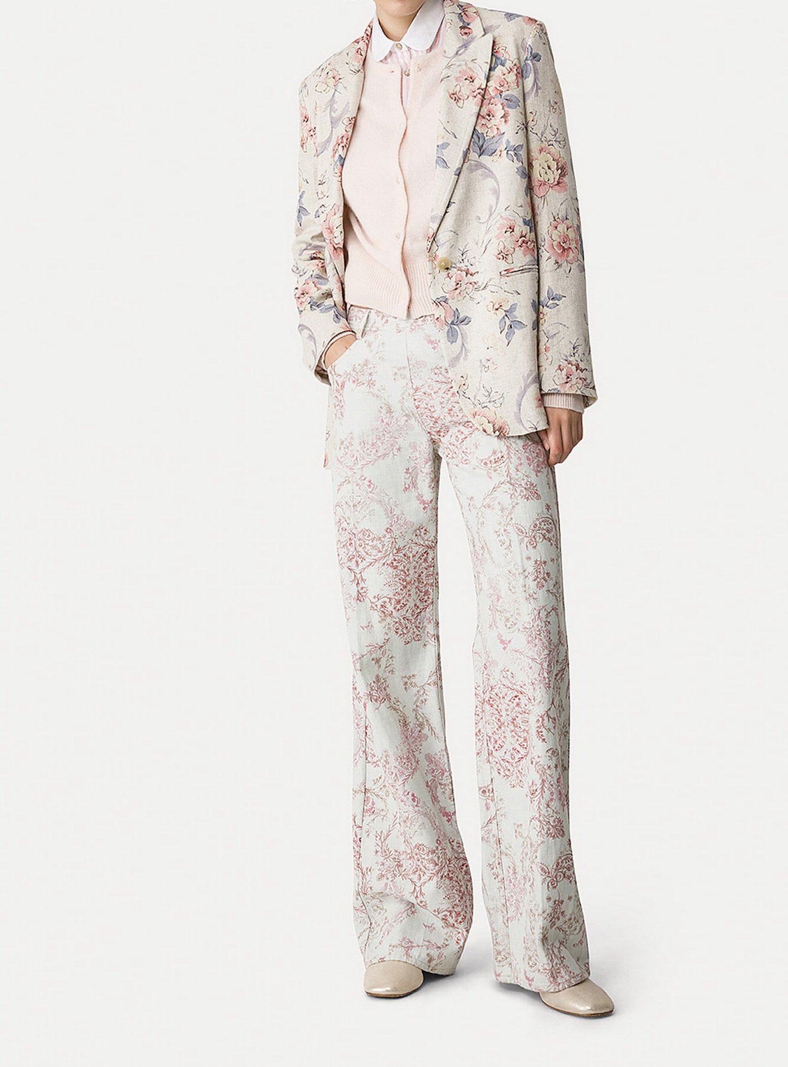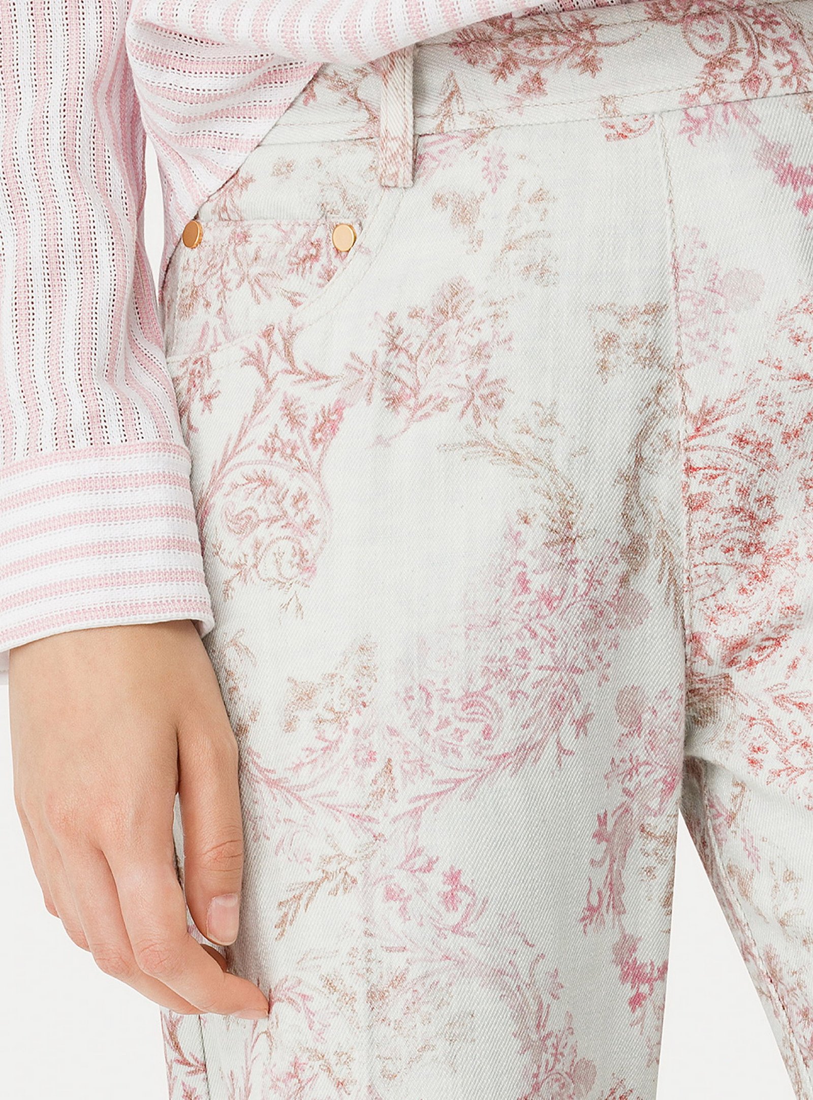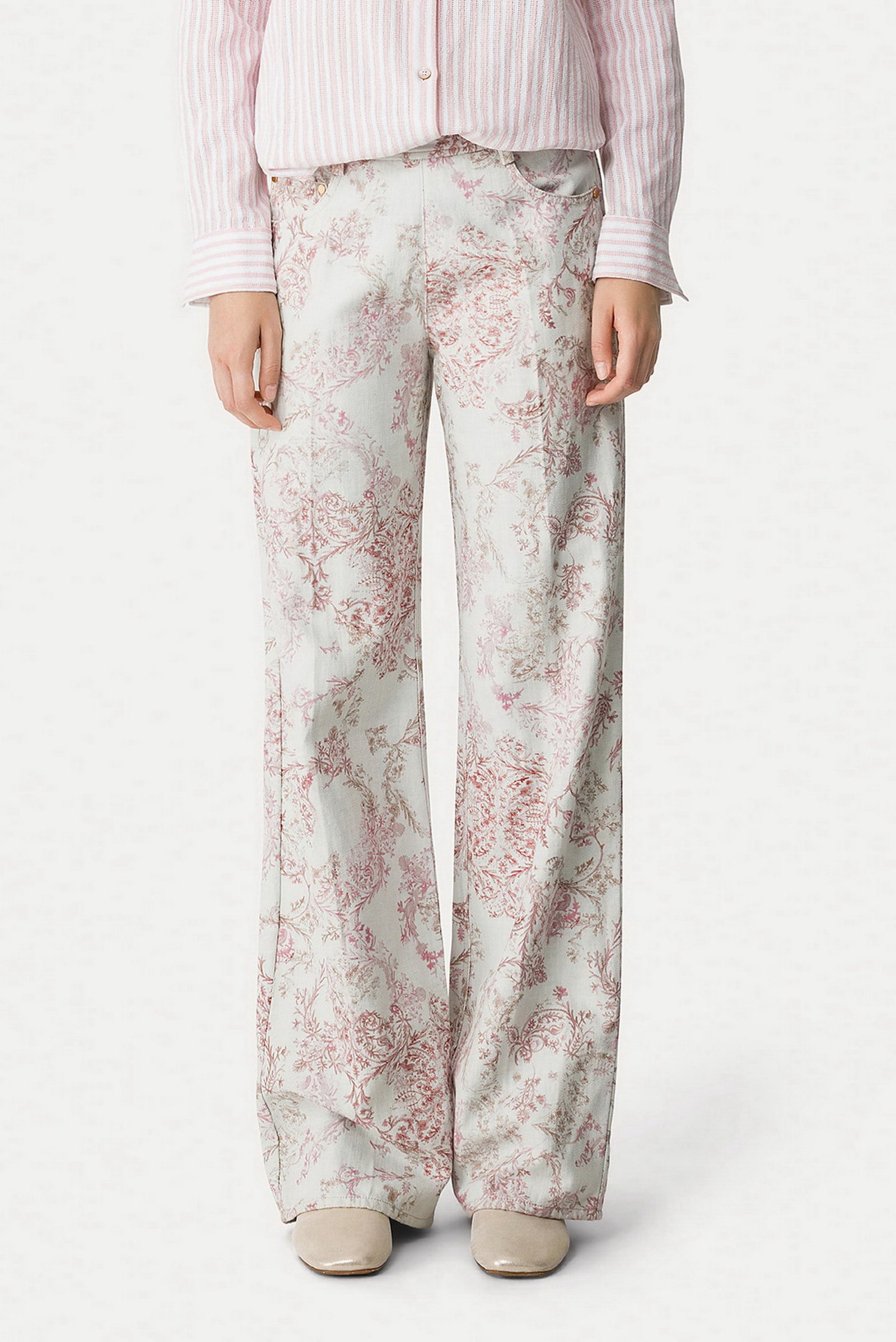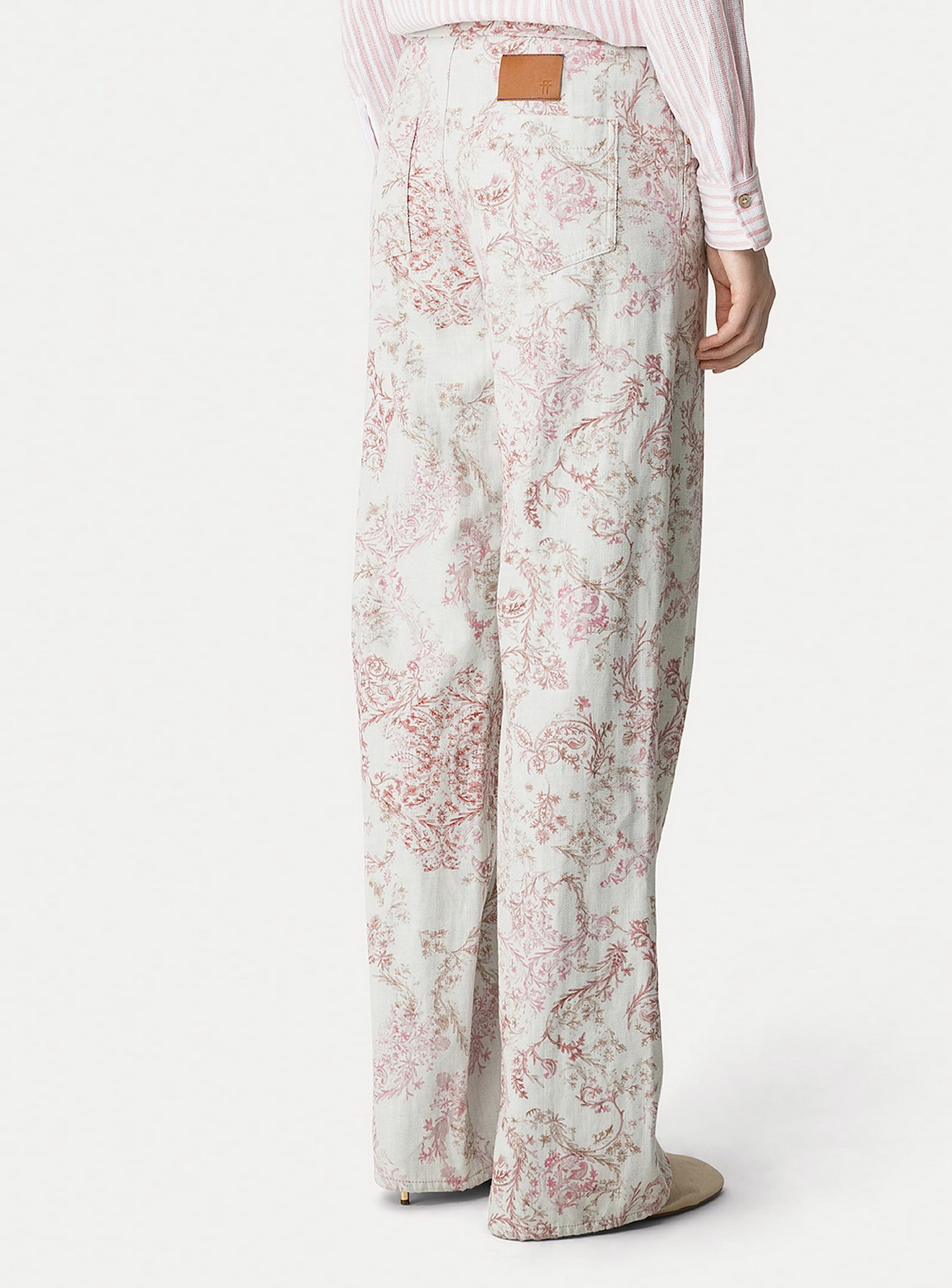 interpretazione poetica e primaverile del pantalone 5 tasche in denim, decorato da una pioggia di delicati fiori “nontiscordardime”. il contrasto delicato delle nuance e la linea pulita in vita con inserto elastico posteriore donano versatilità e leggerezza a questo pantalone a vita alta pensato per un approccio romantico alla nuova stagione.