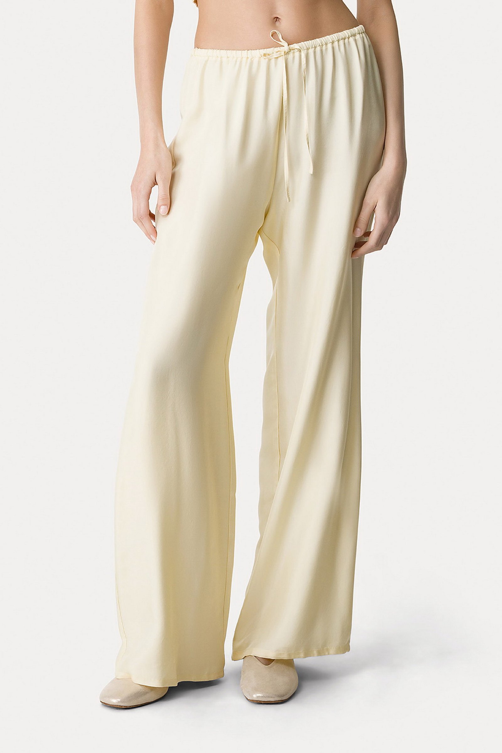 armonie di forme e nuance delicate definiscono questo pantalone con coulisse in twill di viscosa. fluido e leggero, si chiude con nastro in vita e ondeggia morbido verso il fondo, grazie al volume ampio e dritto della gamba. il cavallo leggermente basso dona un effetto rilassato al pantalone in viscosa leggero più versatile di stagione.