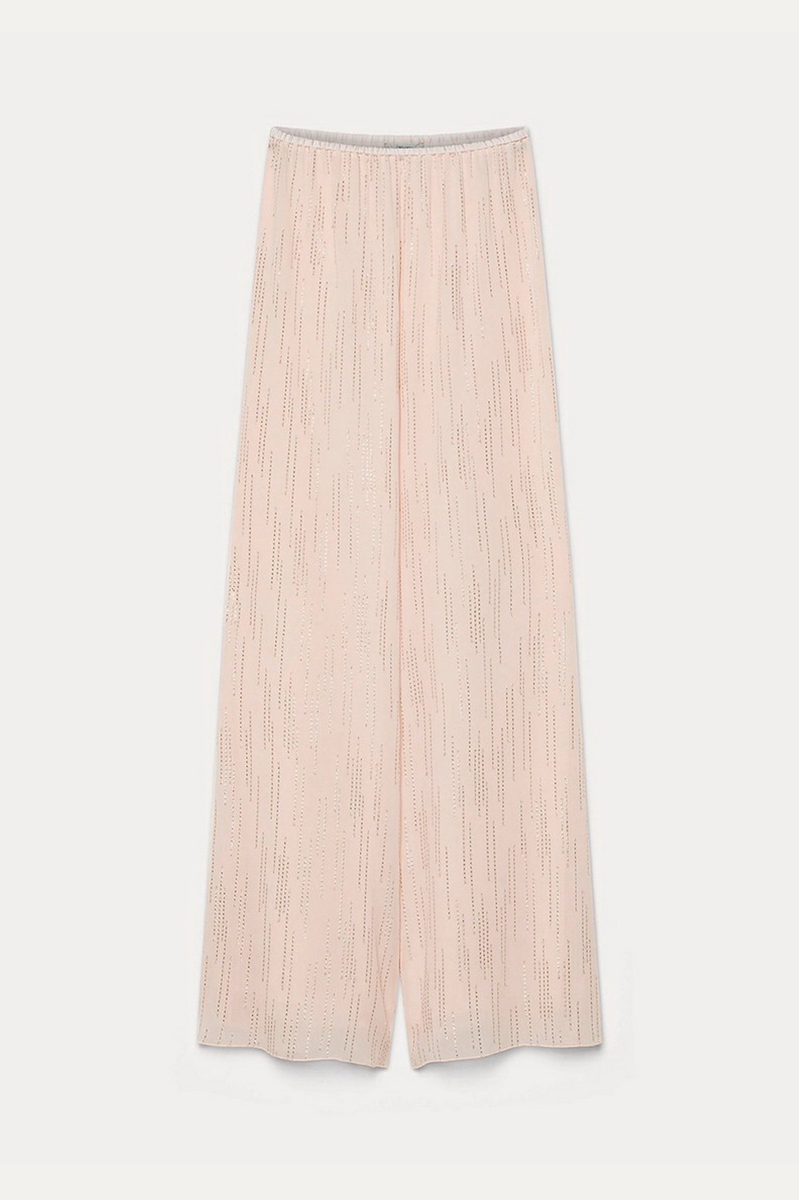 morbido, fluido, sognante: nuovo pantalone jacquard con un disegno verticale di fili argentati in lamé, che compongono una delicata pioggia di luce. foderato, con elastico in vita, ondeggia ad ogni passo creando un gioco di luci che attira gli sguardi, con discrezione.