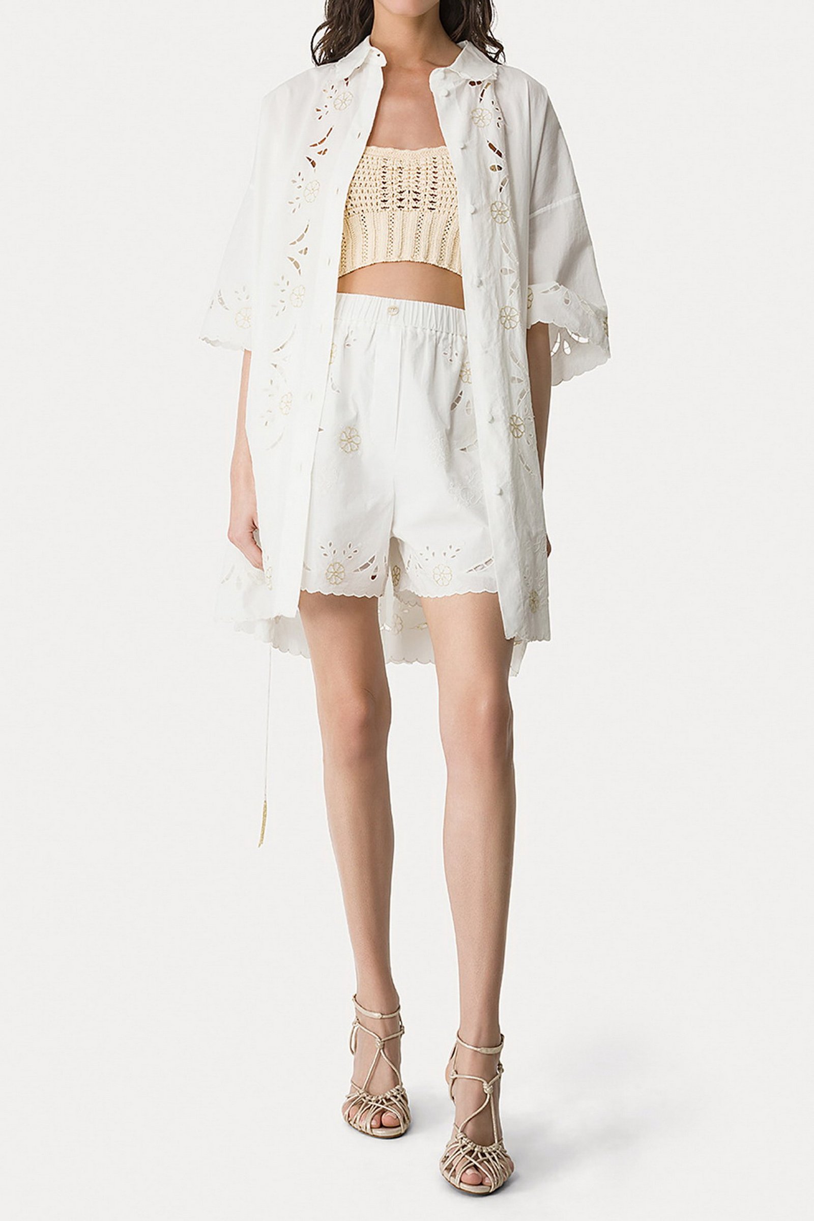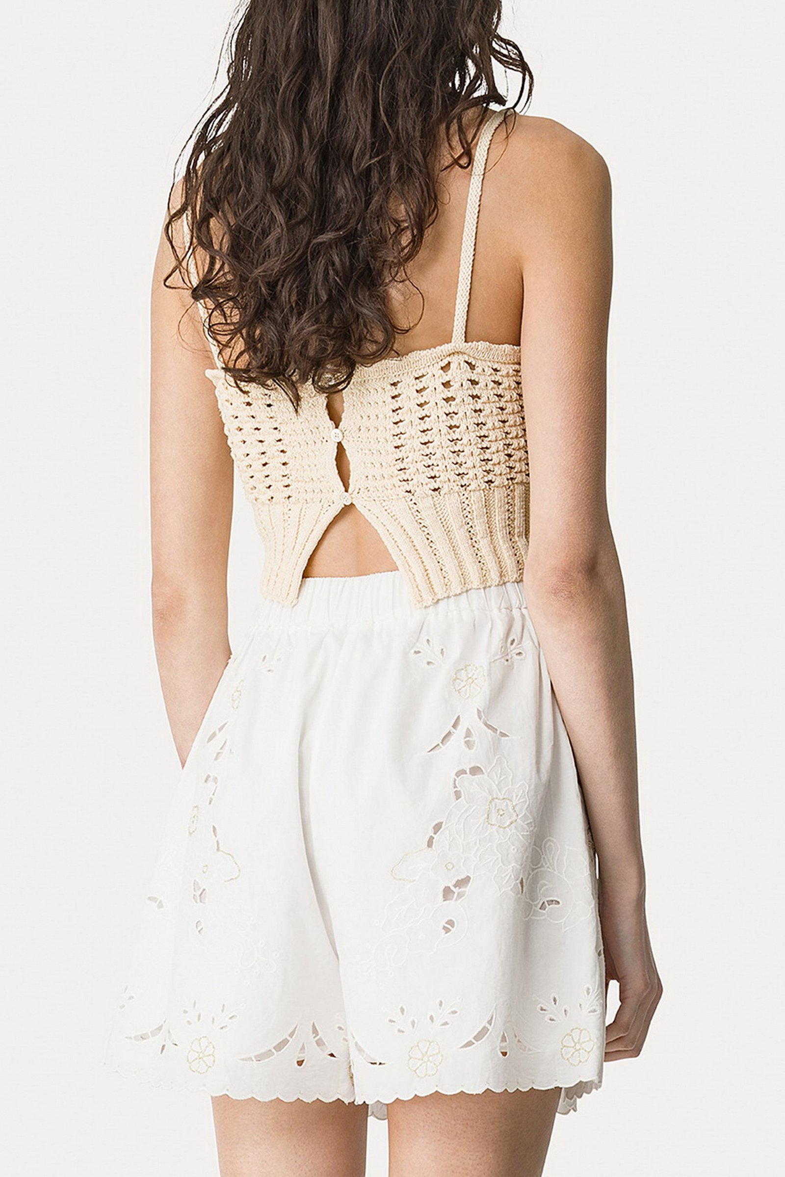 lascia scoperte spalle e décolleté questo top corto in maglia cablé: corto, con lavorazione effetto crochet, presenta piccoli punti tridimensionali e traforature che regalano un’allure romantica e femminile. apertura posteriore con bottoncini in madreperla.