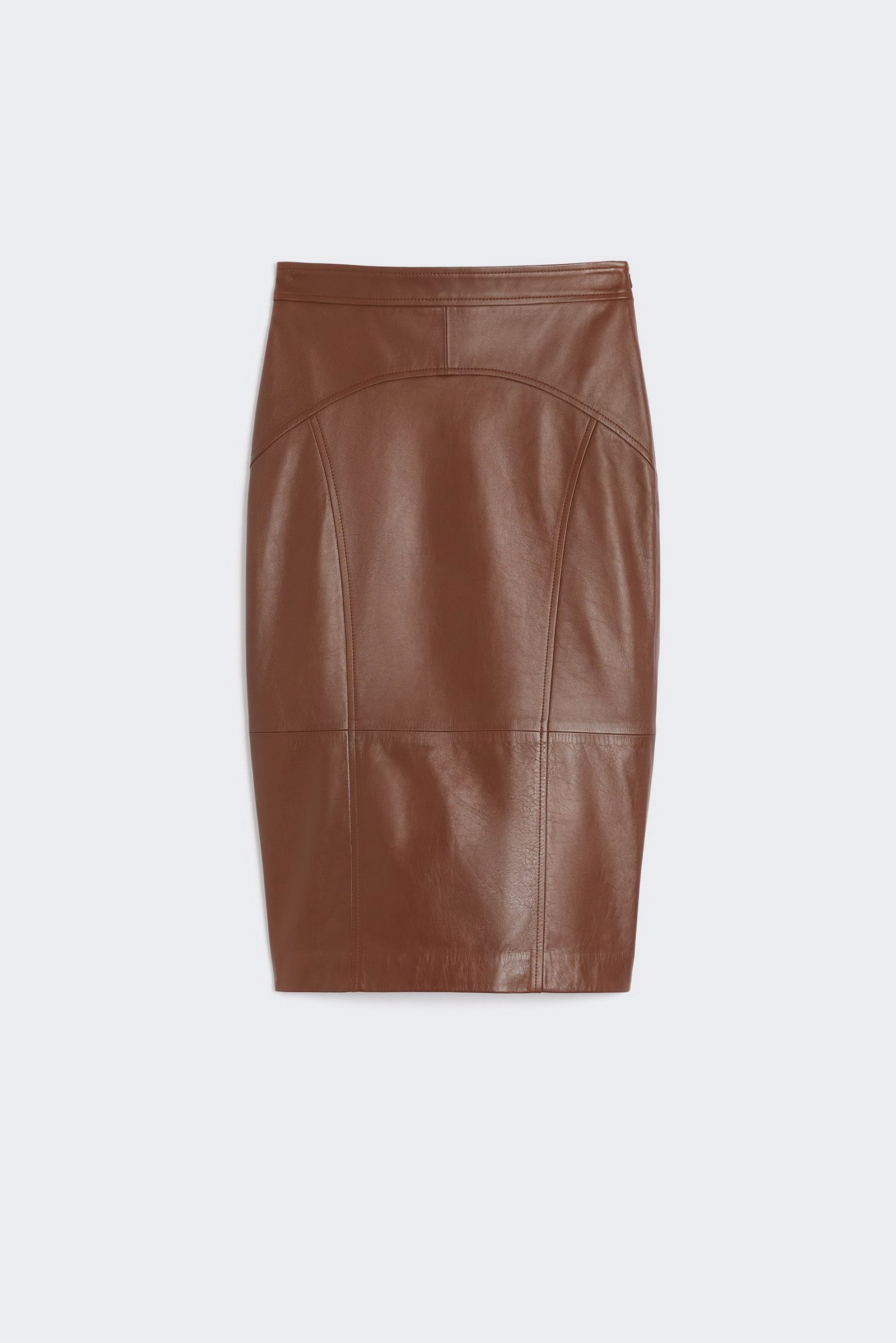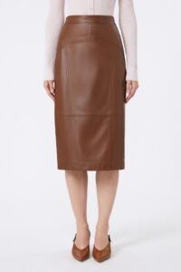 Gonna a tubino con impunture verticali e a volta che slanciano la silhouette.
