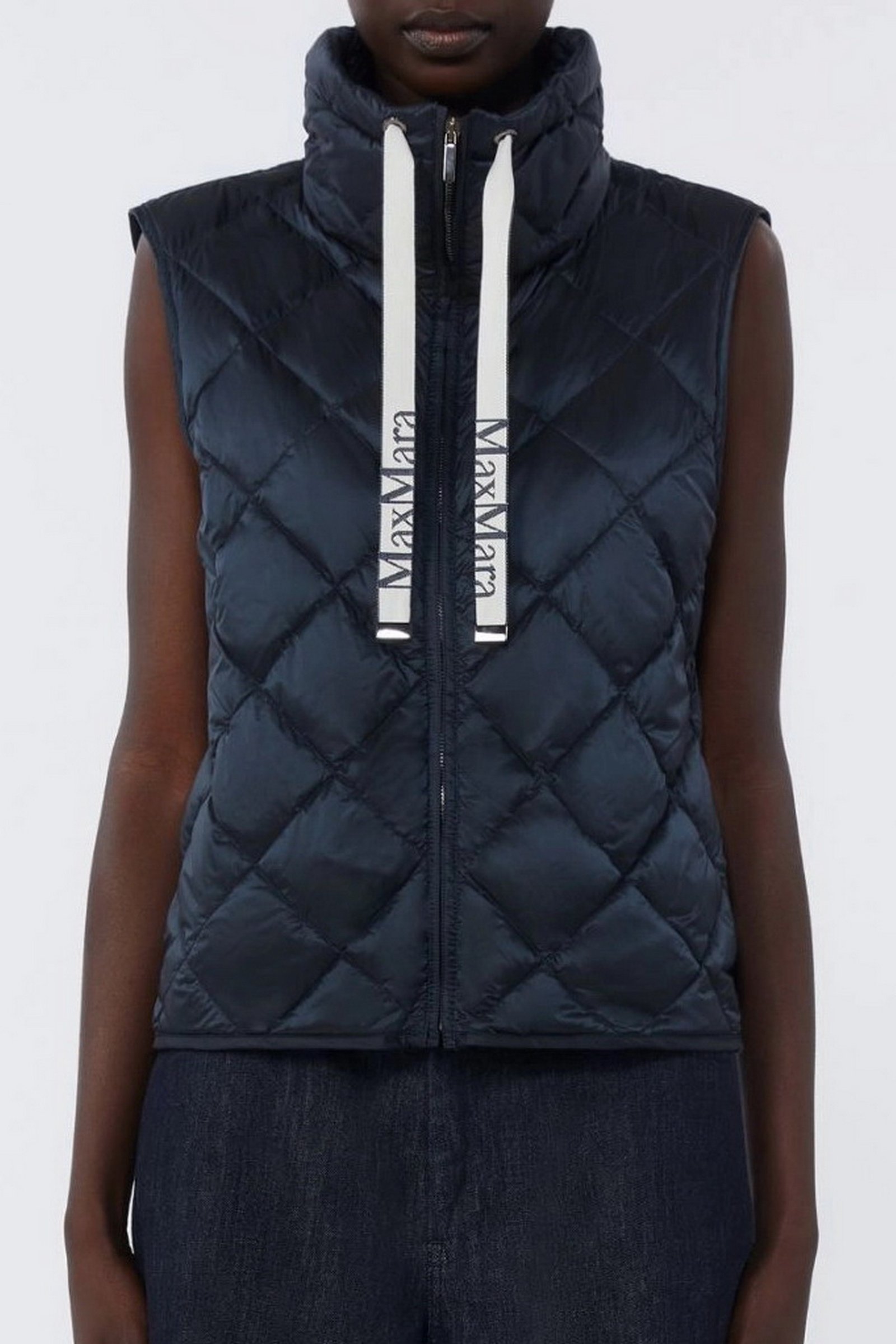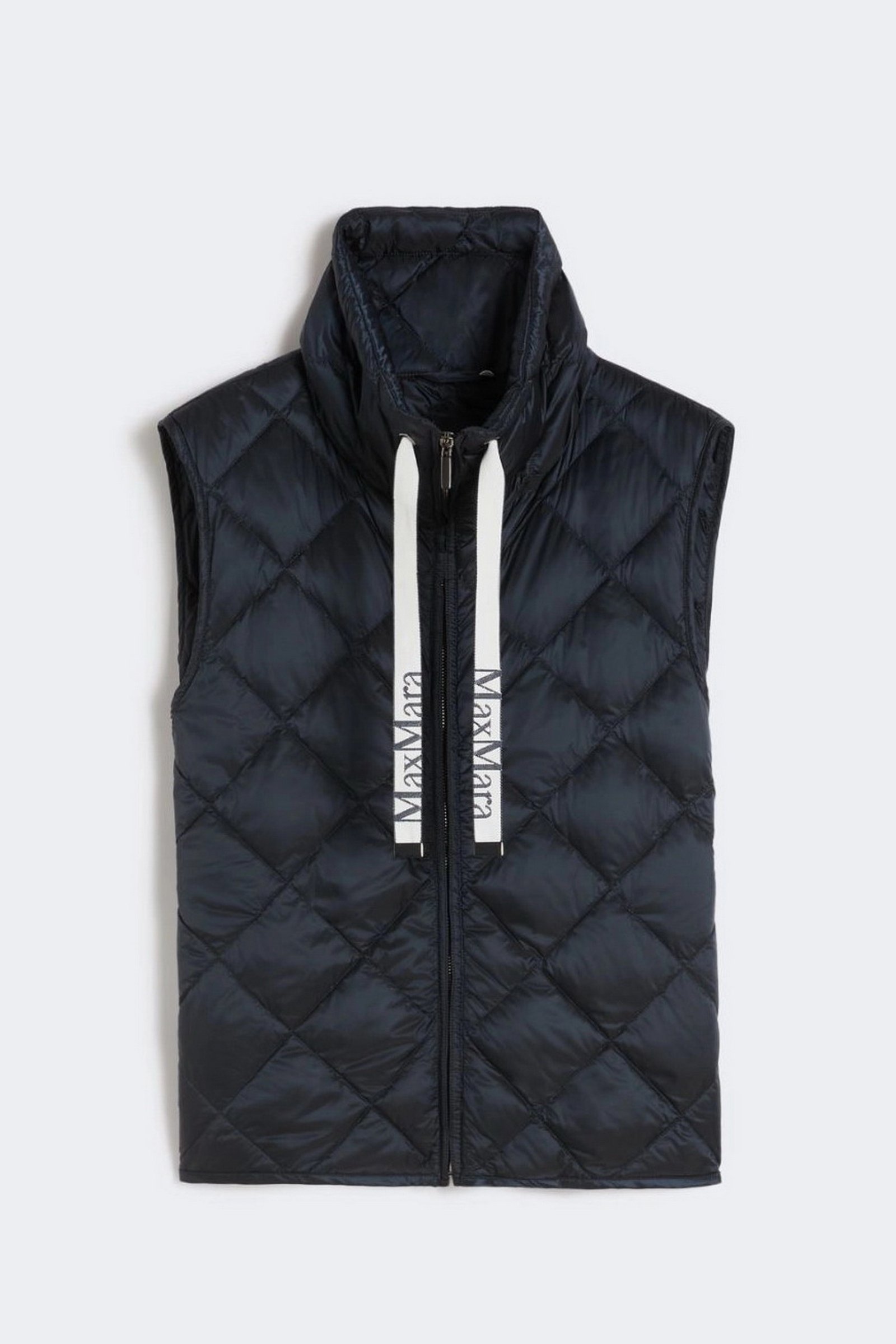 Gilet trapuntato a rombi, caratterizzato da collo alto a coulisse con nastri logati jacquard.