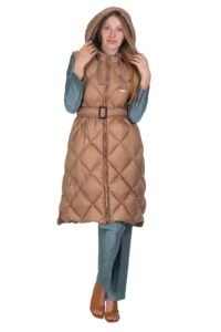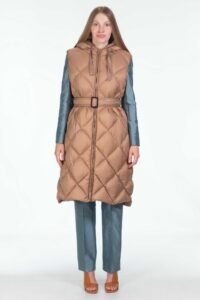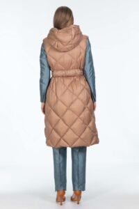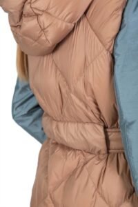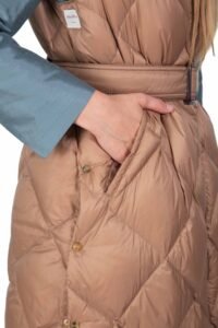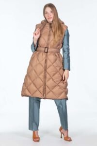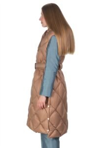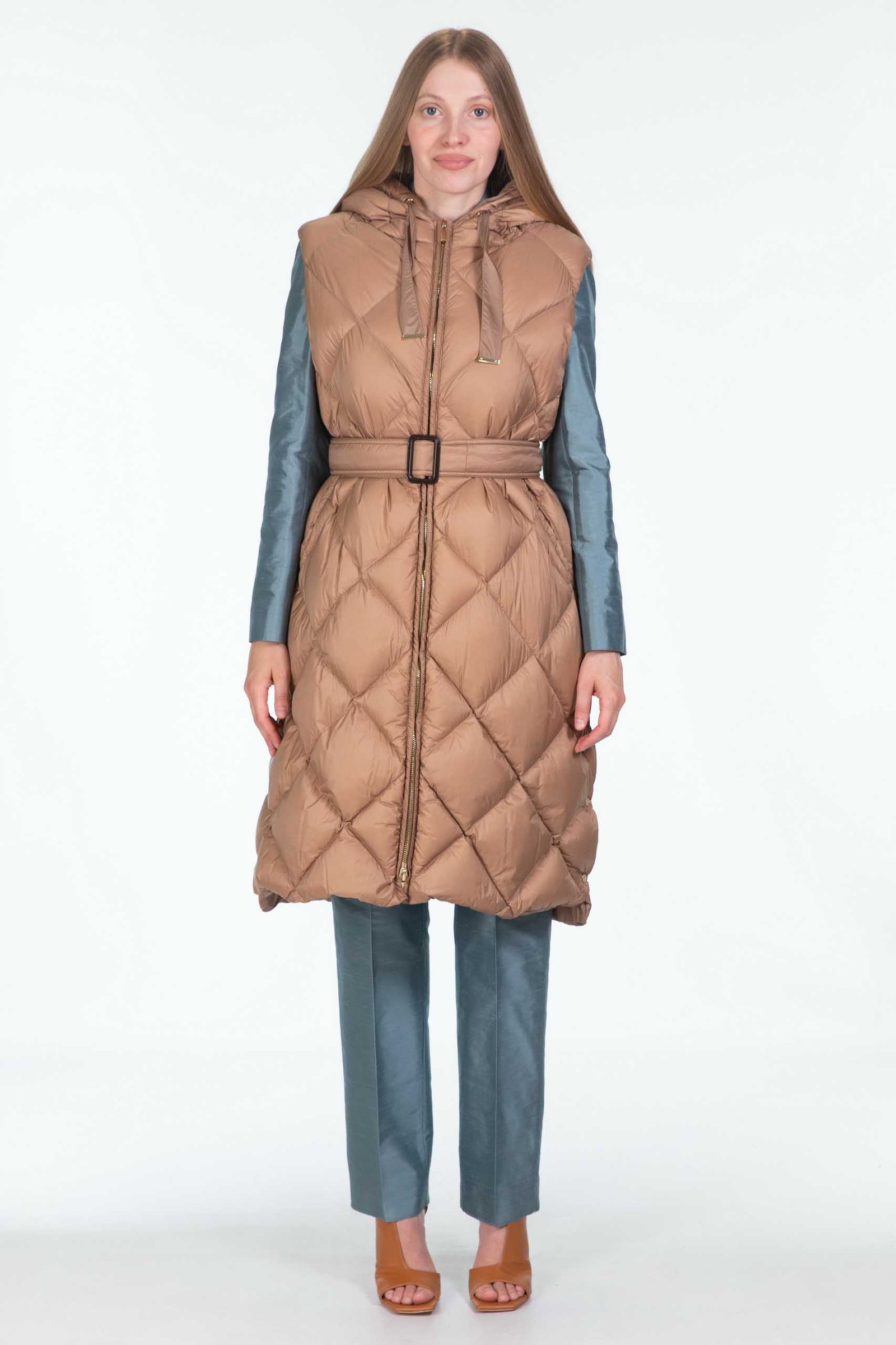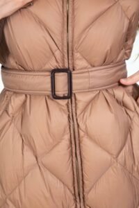 Gilet midi imbottito e trapuntato, caratterizzato da cintura rimobile inserita nella martingala in vita sul retro.