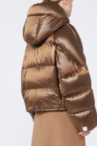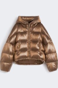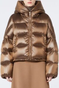 Piumino imbottito con cappuccio, caratterizzato da linea dritta e taglio leggermente cropped.