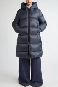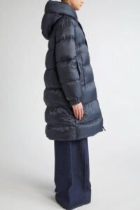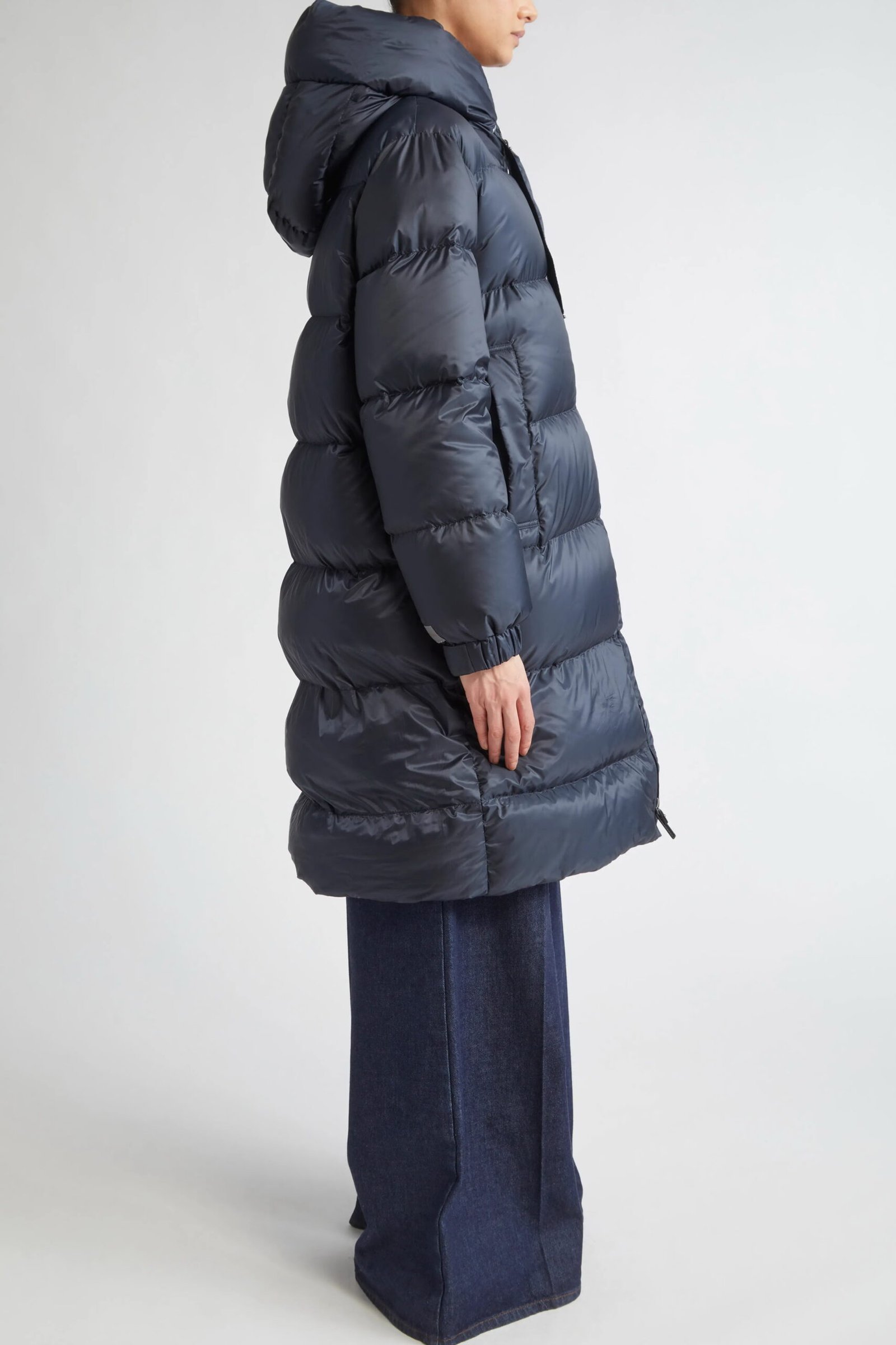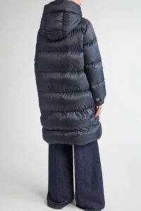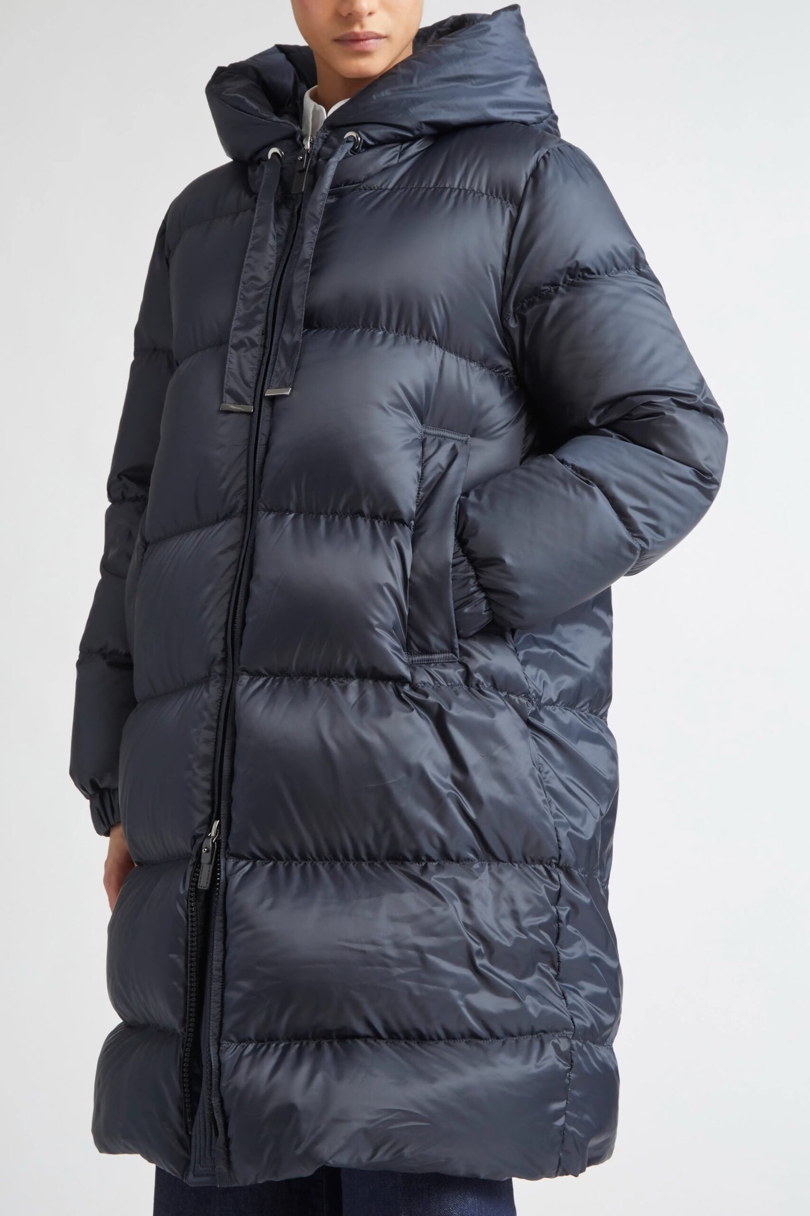 Piumino midi dalla linea dritta, con cappuccio a coulisse e tasche a filettone.