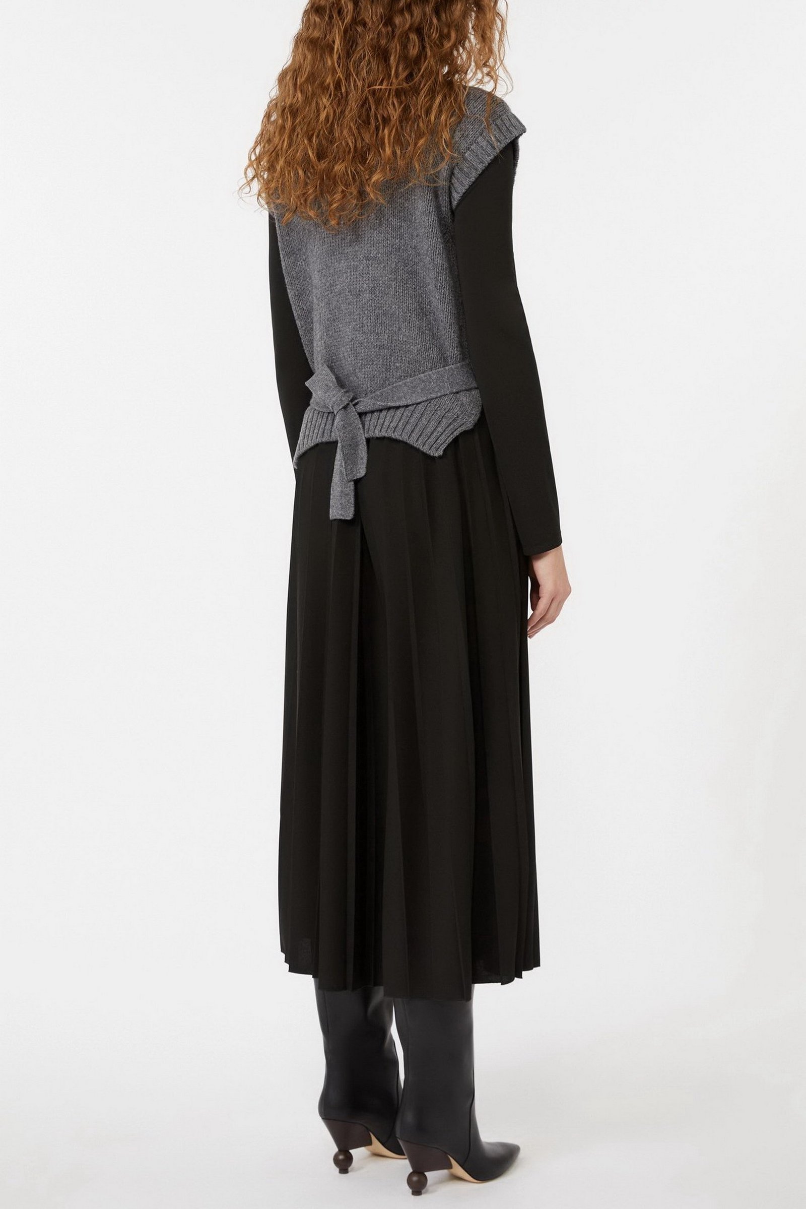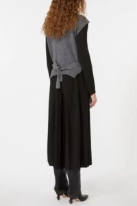 Abito lungo caratterizzato da gilet sovrapposto in pura lana, effetto trompe-l’oeil, da indossare insieme e separati.