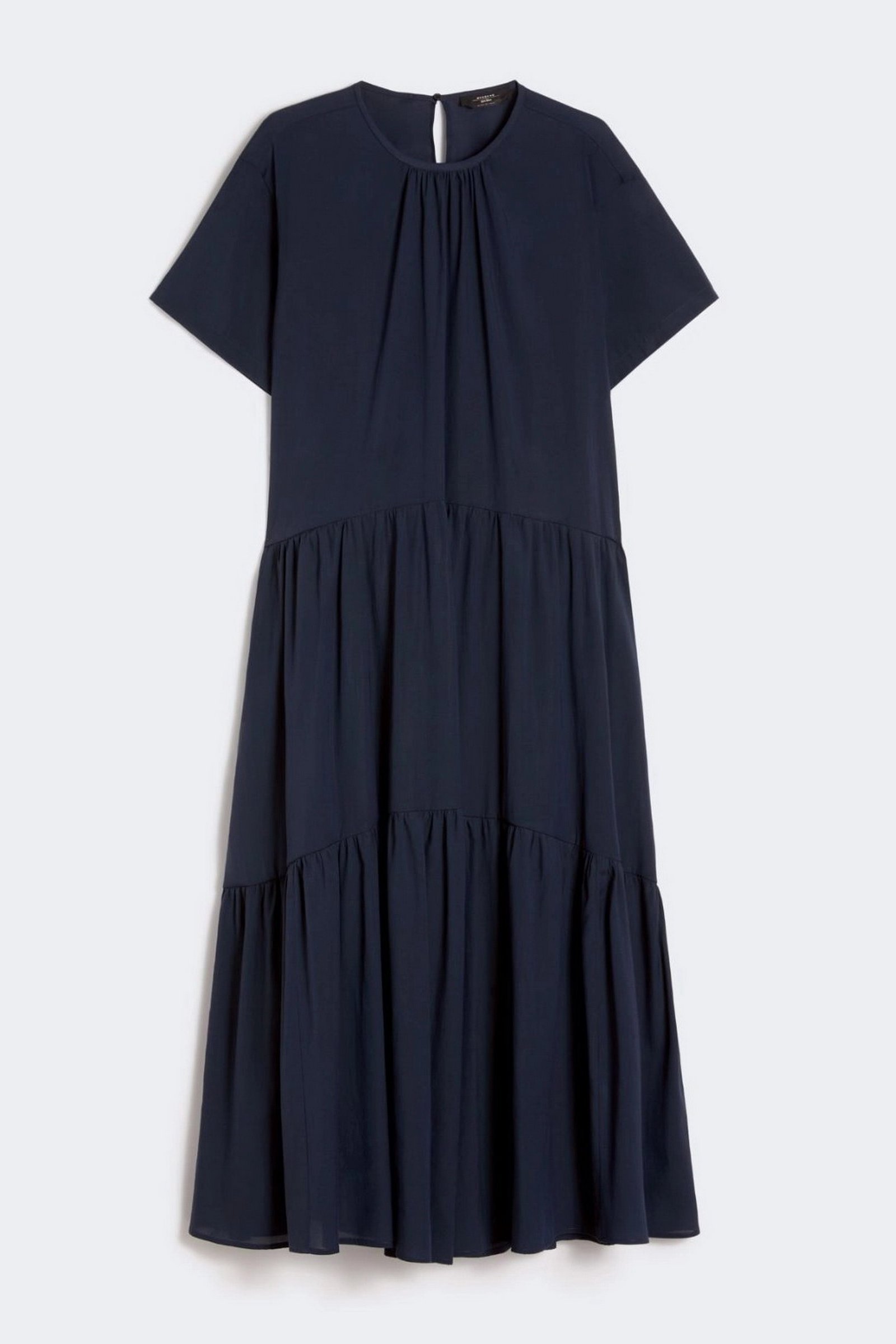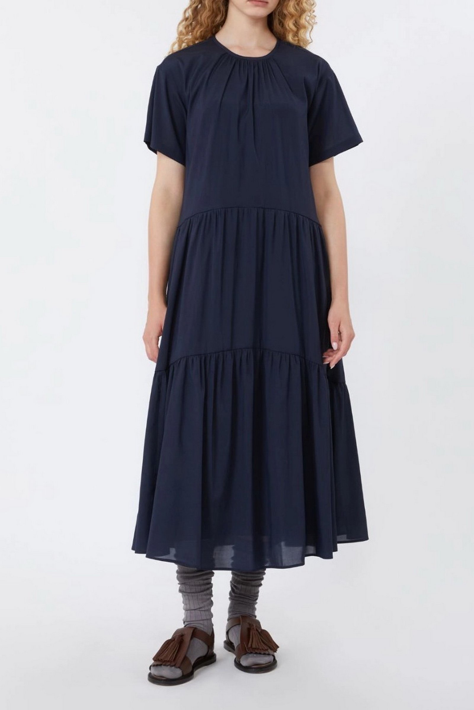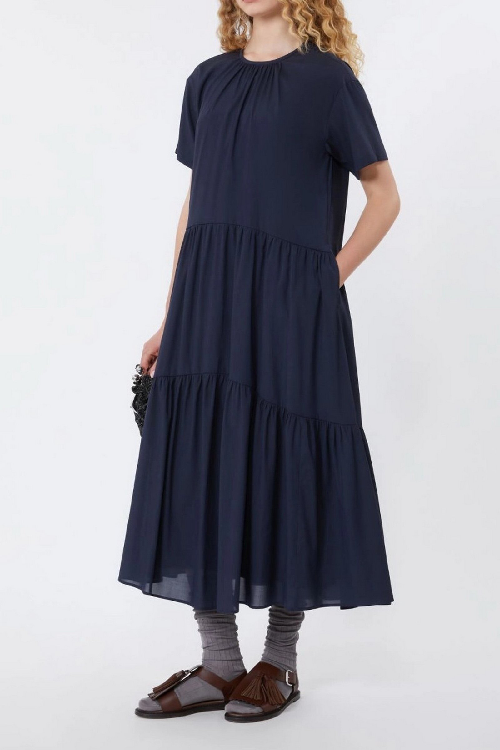 Abito lungo dalla linea ampia, caratterizzato da gonna a balze che dona movimento e volume.
