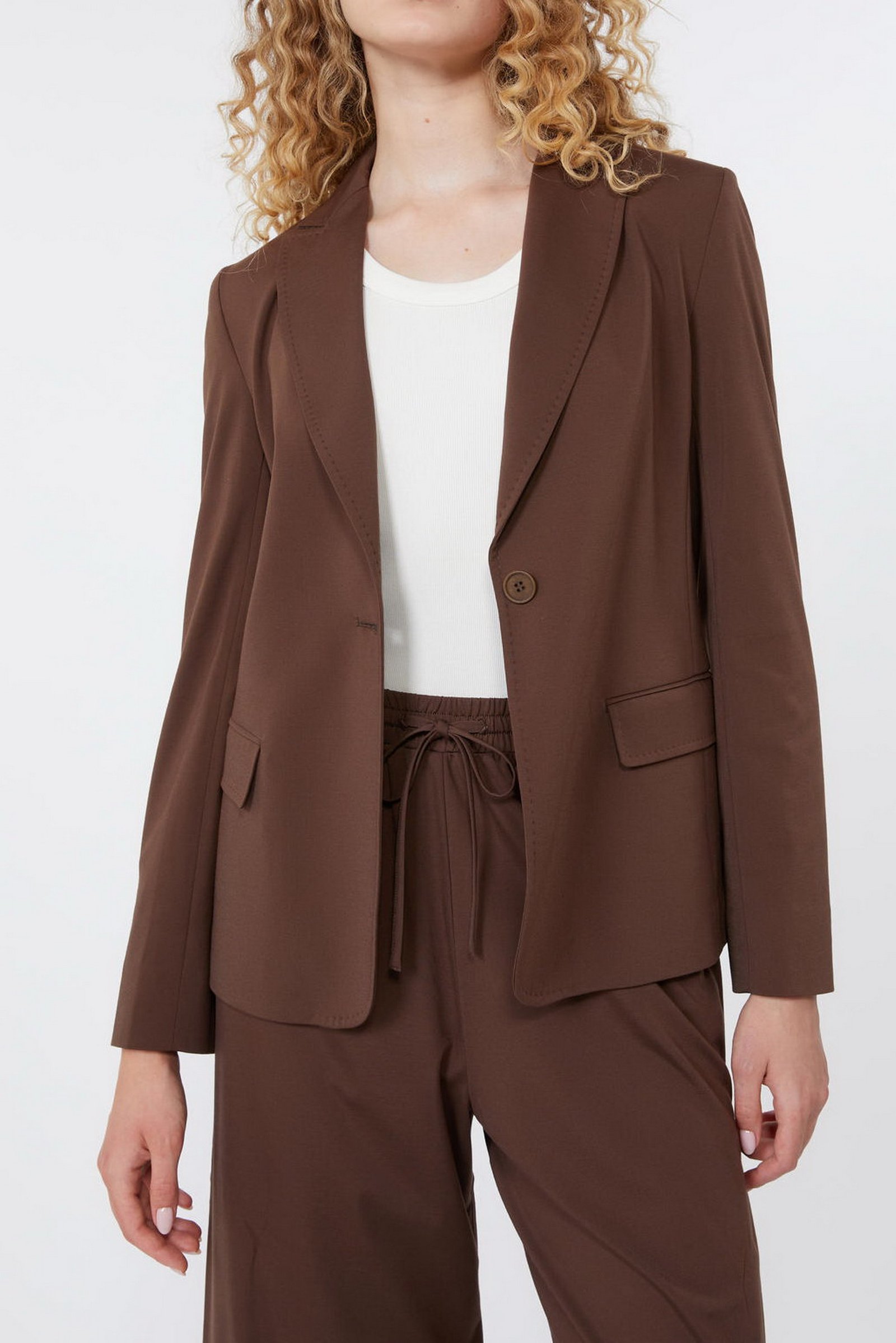 Blazer in jersey di lyocell e viscosa con rever a lancia, maniche lunghe, tasche con patta applicata. Chiusura monopetto con bottone singolo. Linea femminile. Semifoderato.