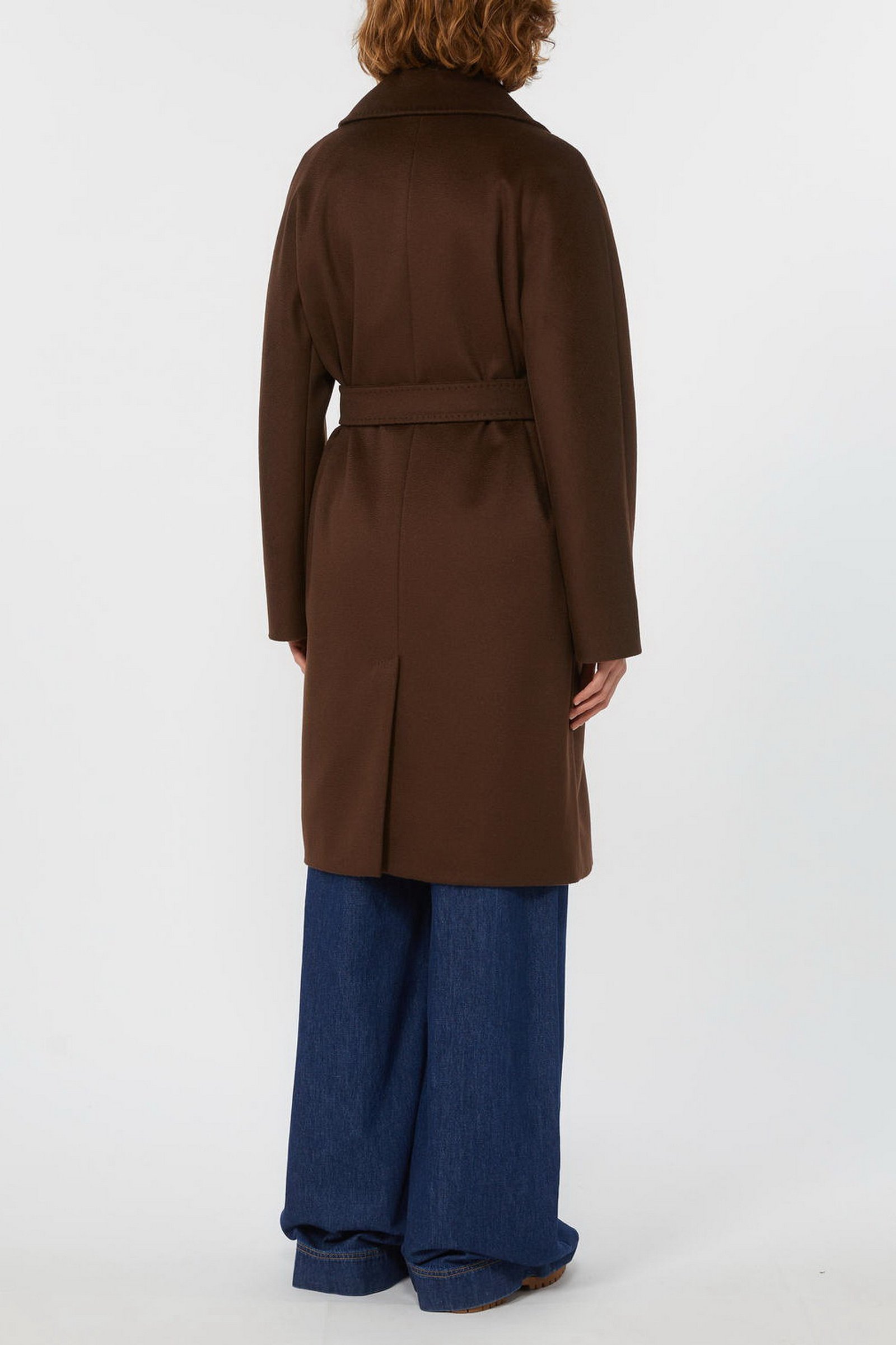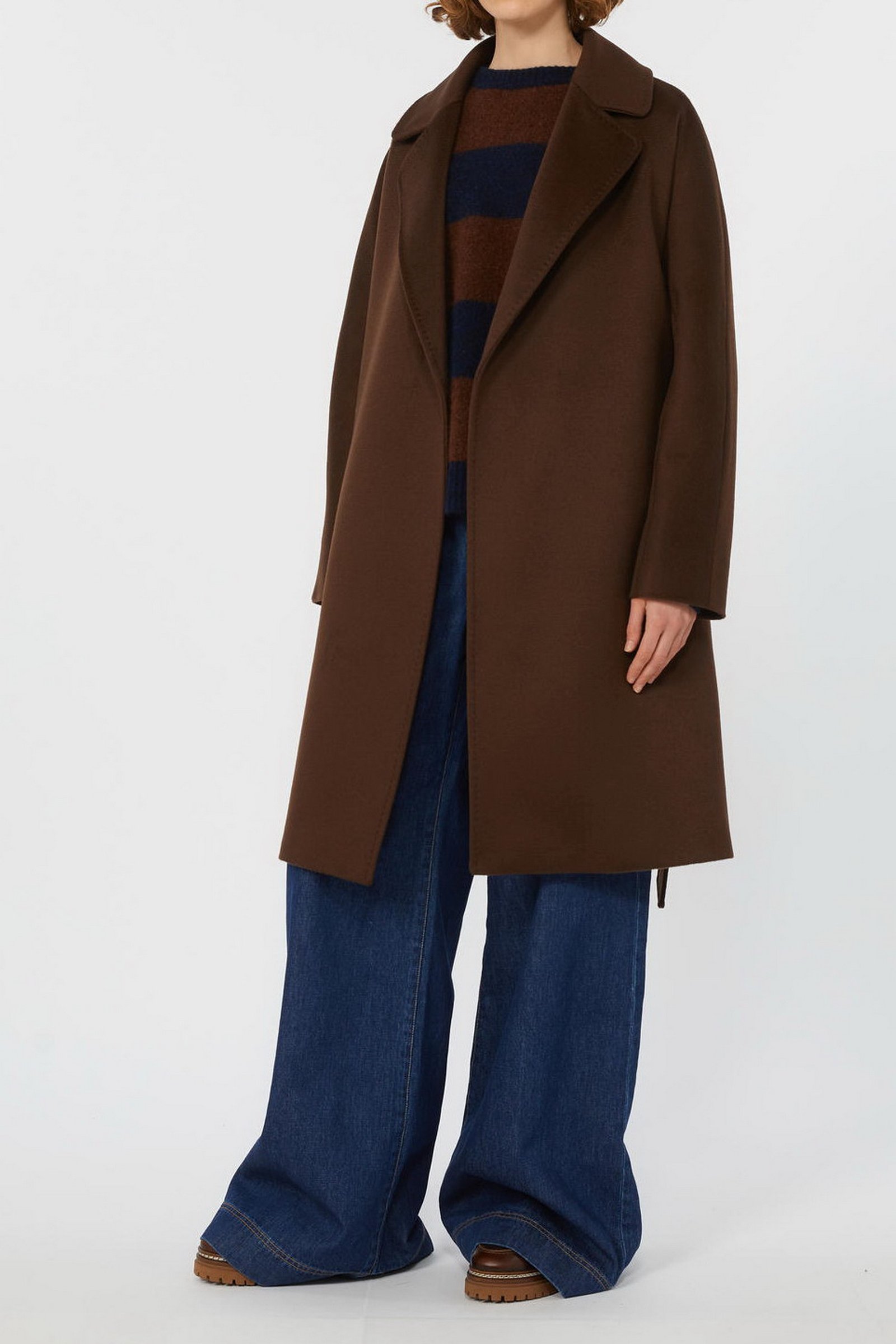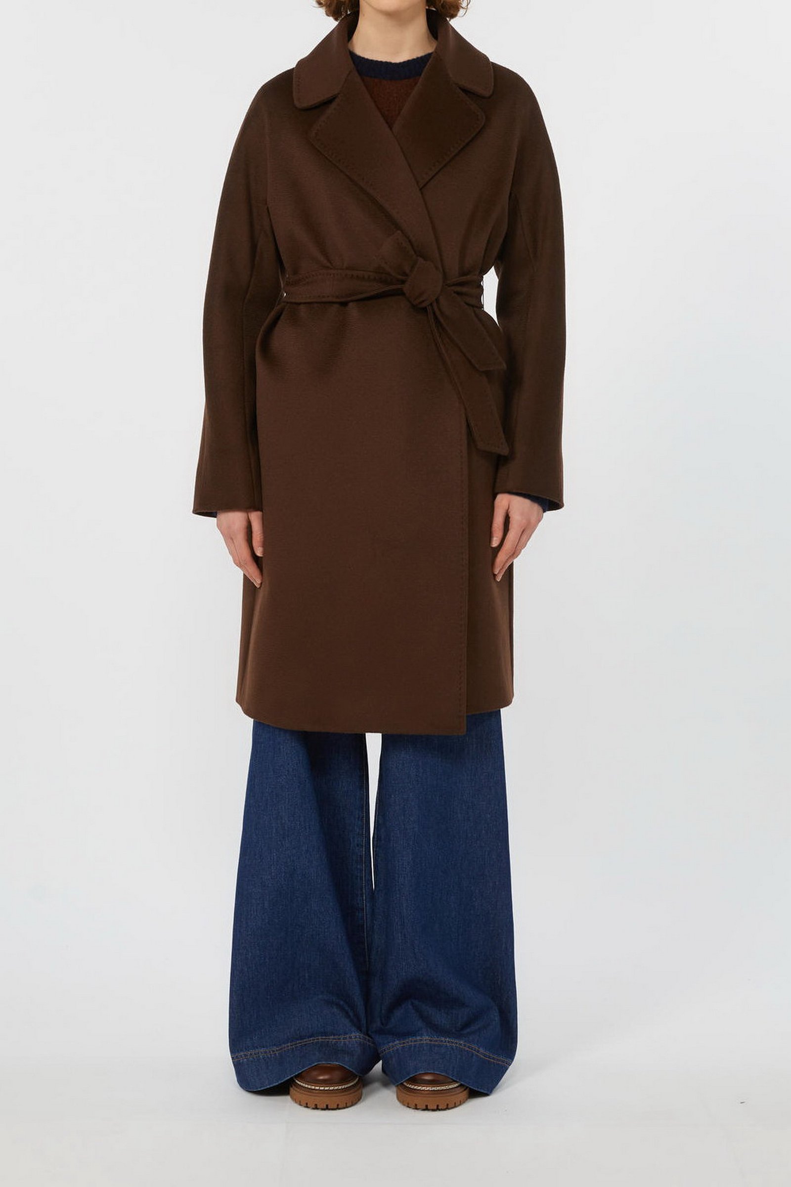 Cappotto midi a vestaglia, chiuso con cintura abbinata che evidenzia la silhouette femminile.