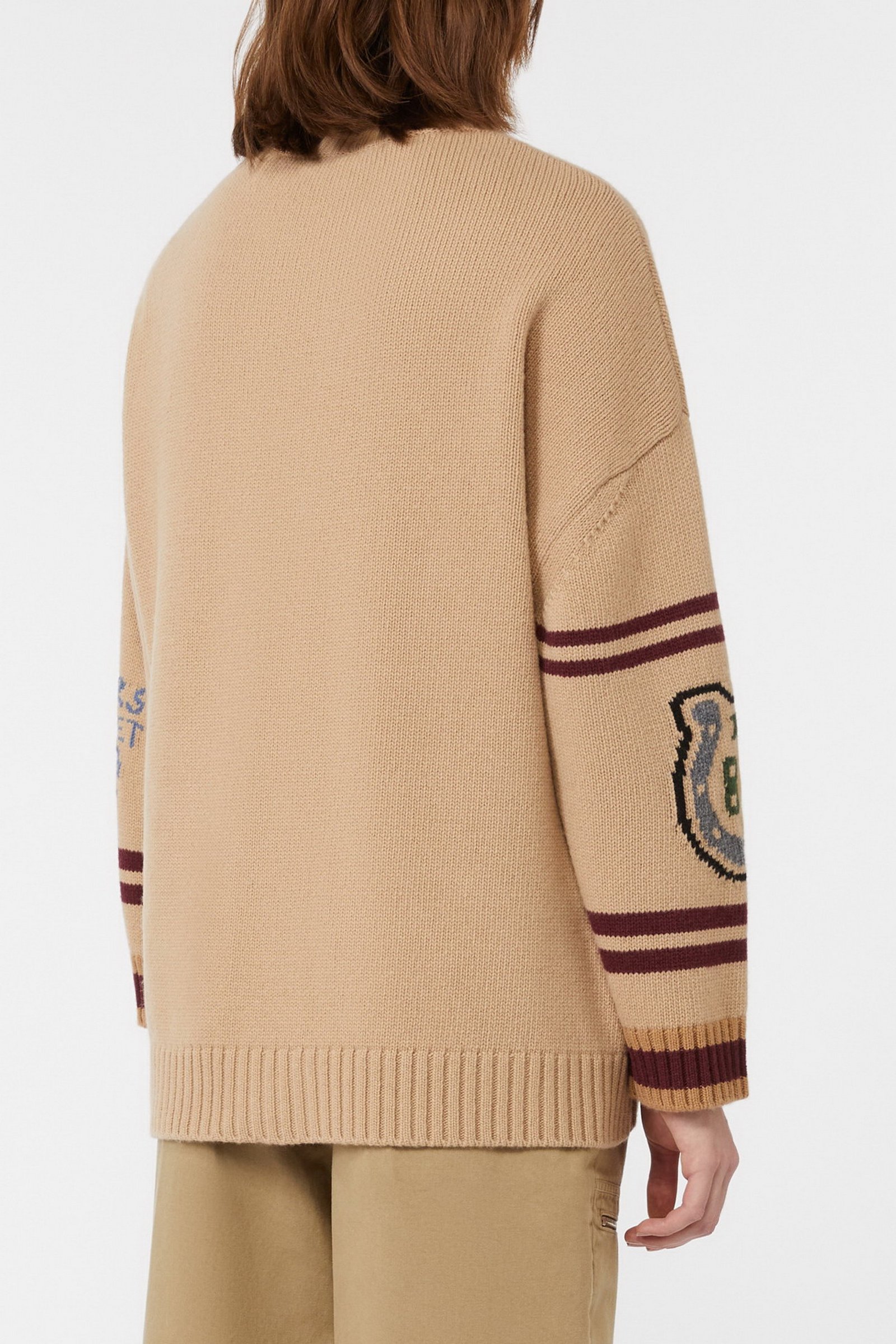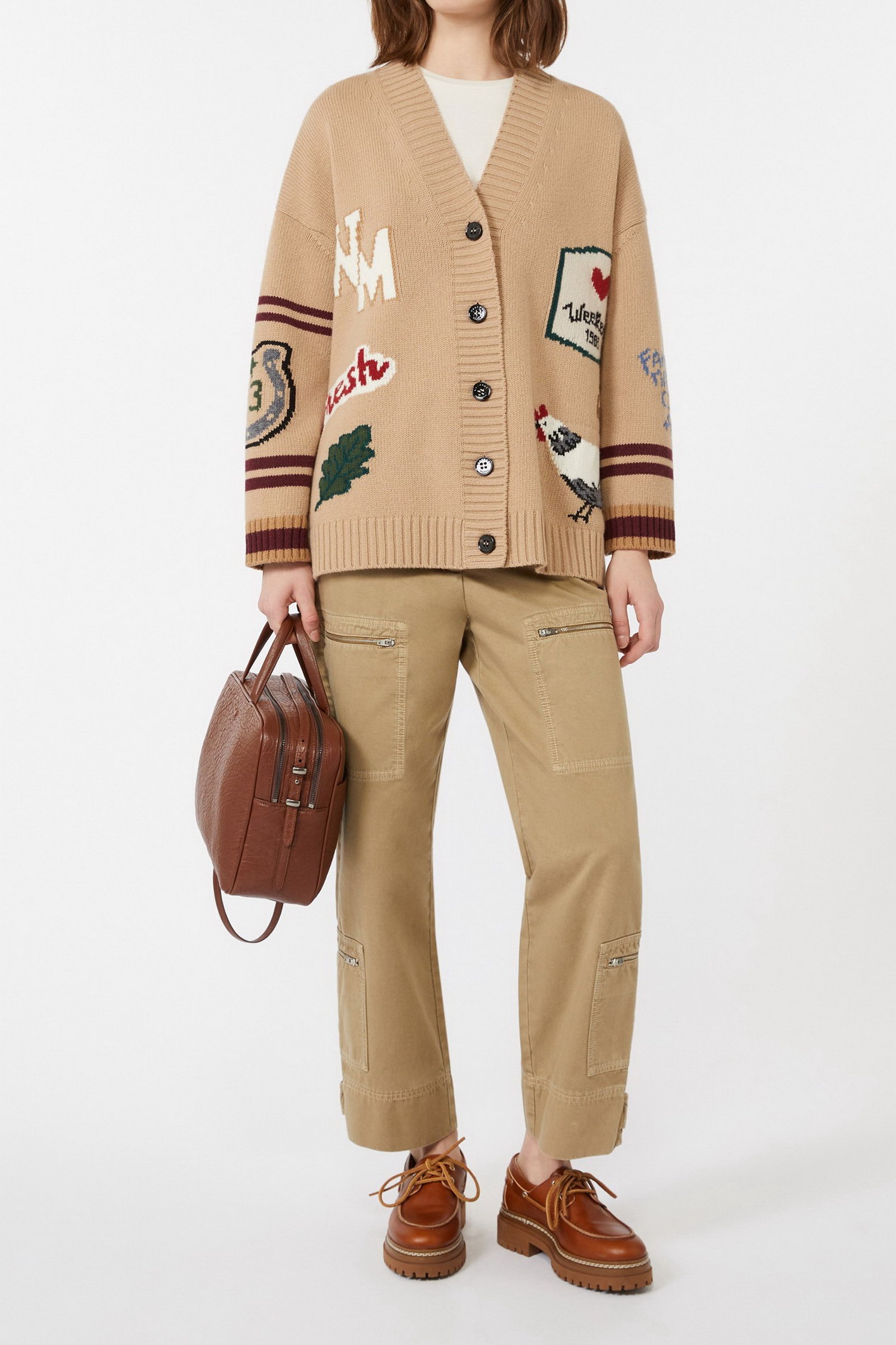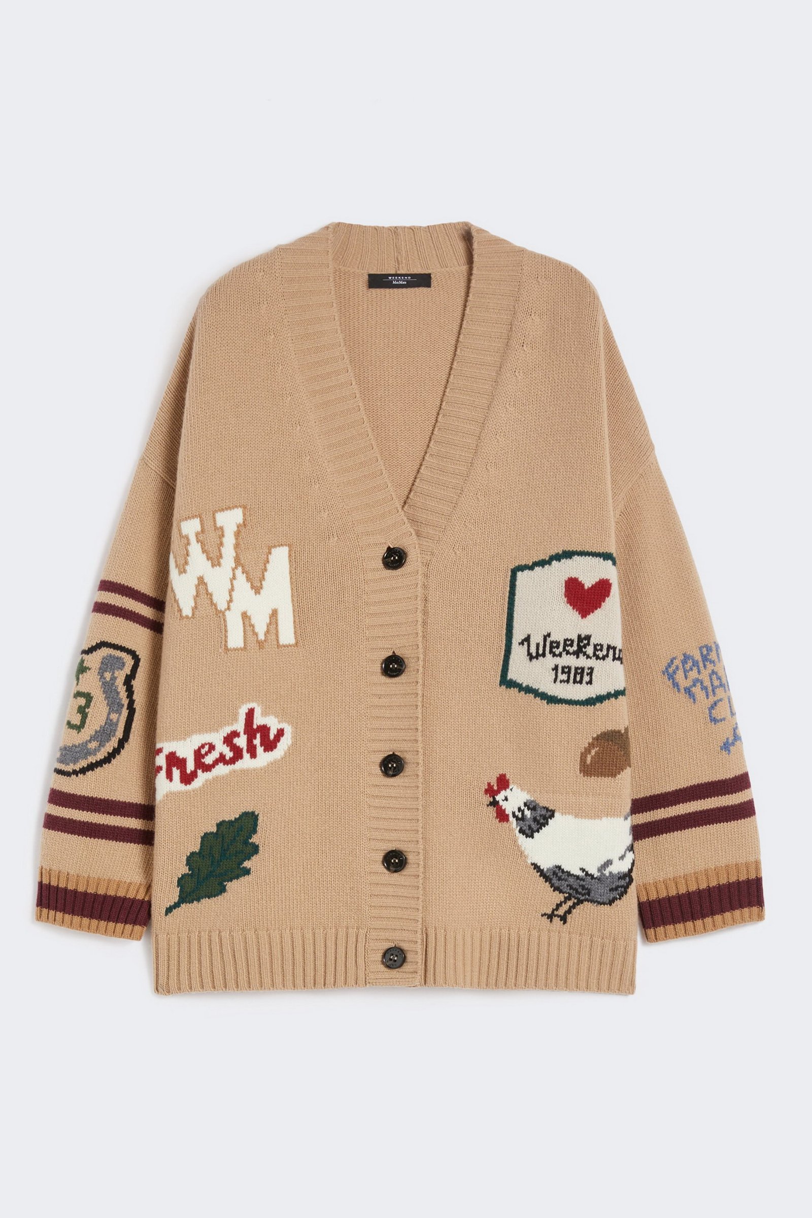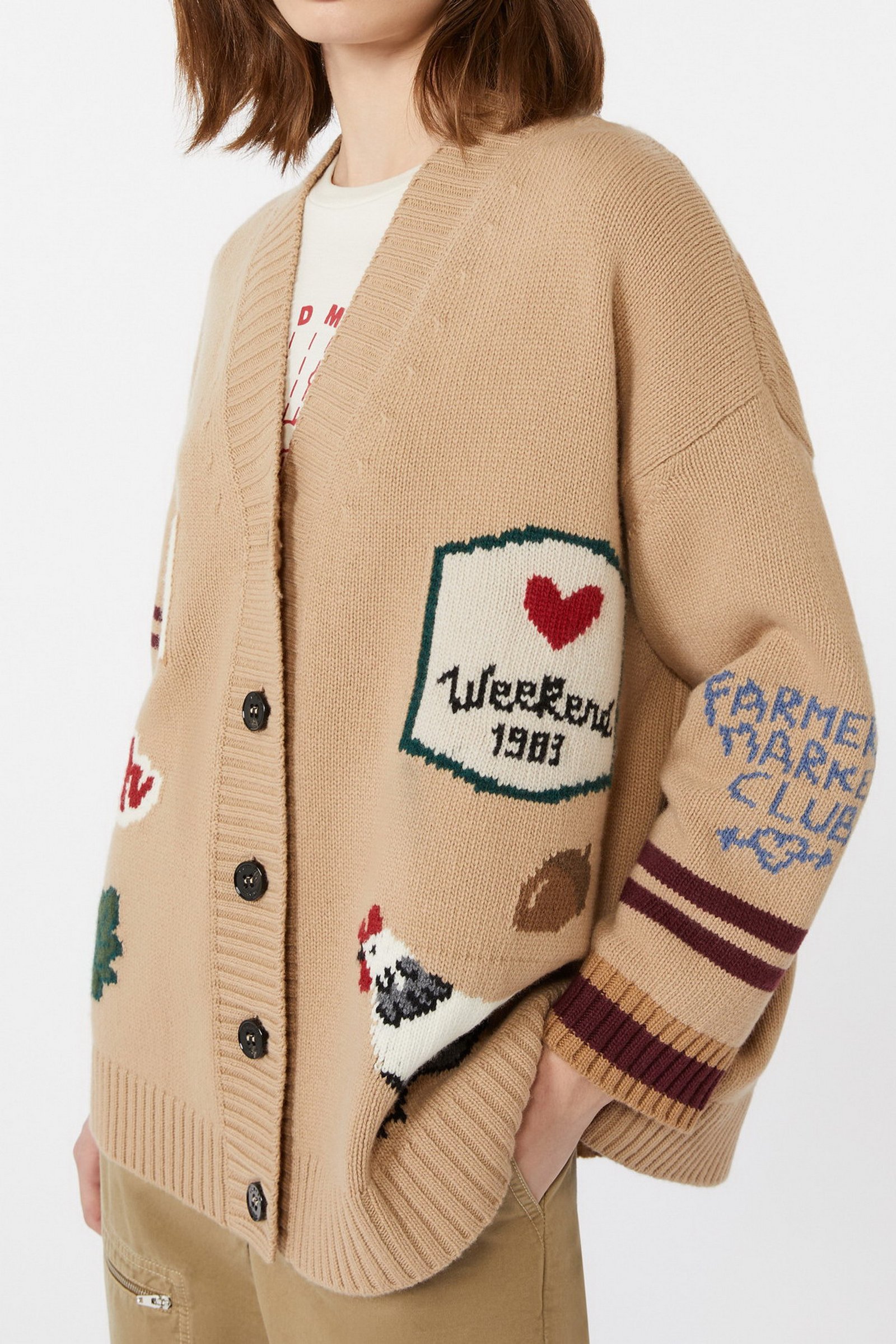 Cardigan overfit, impreziosito da una lavorazione ad intarsio con disegni sul davanti e le maniche.