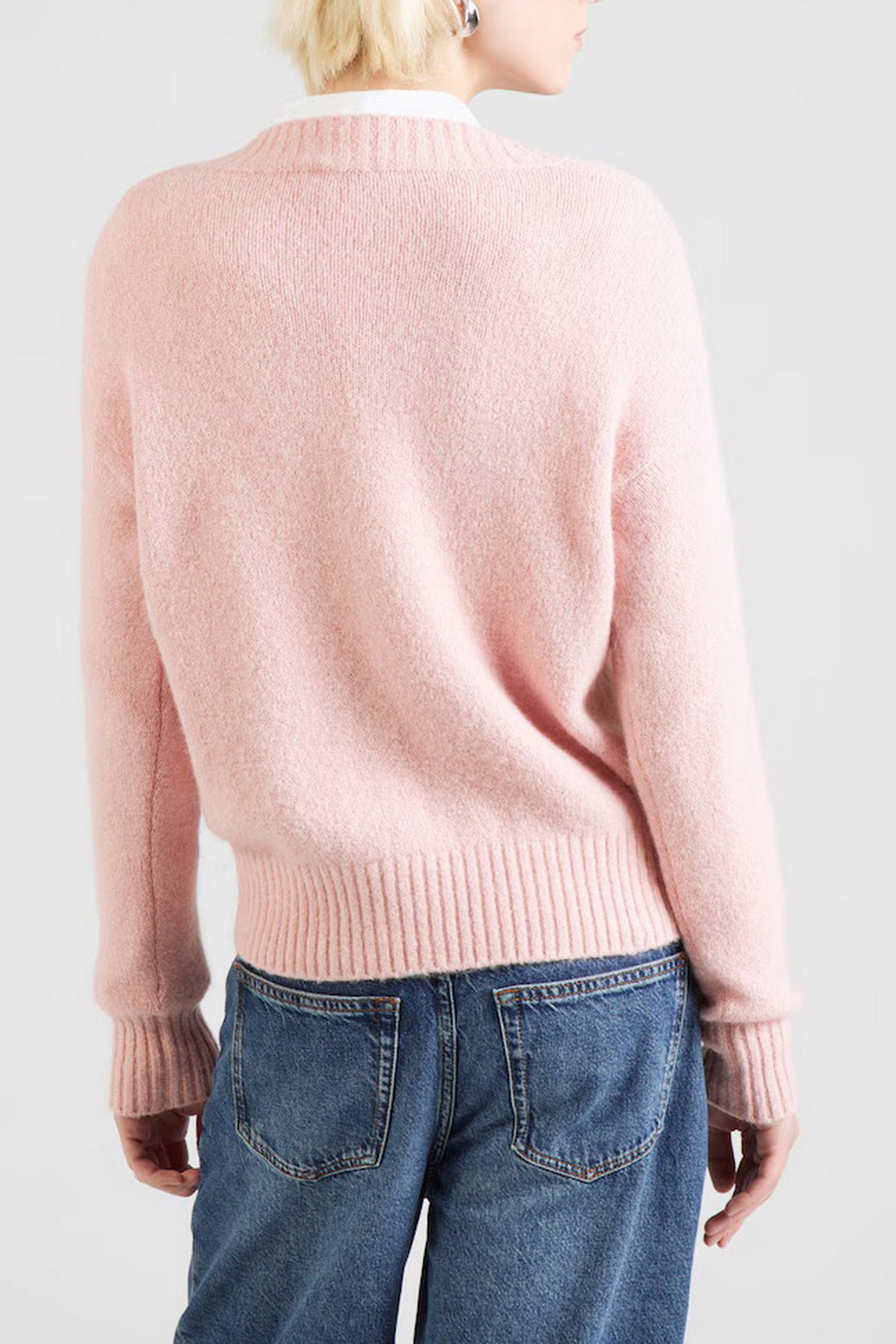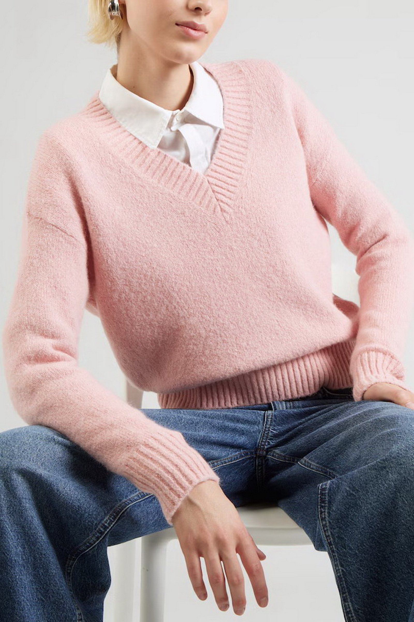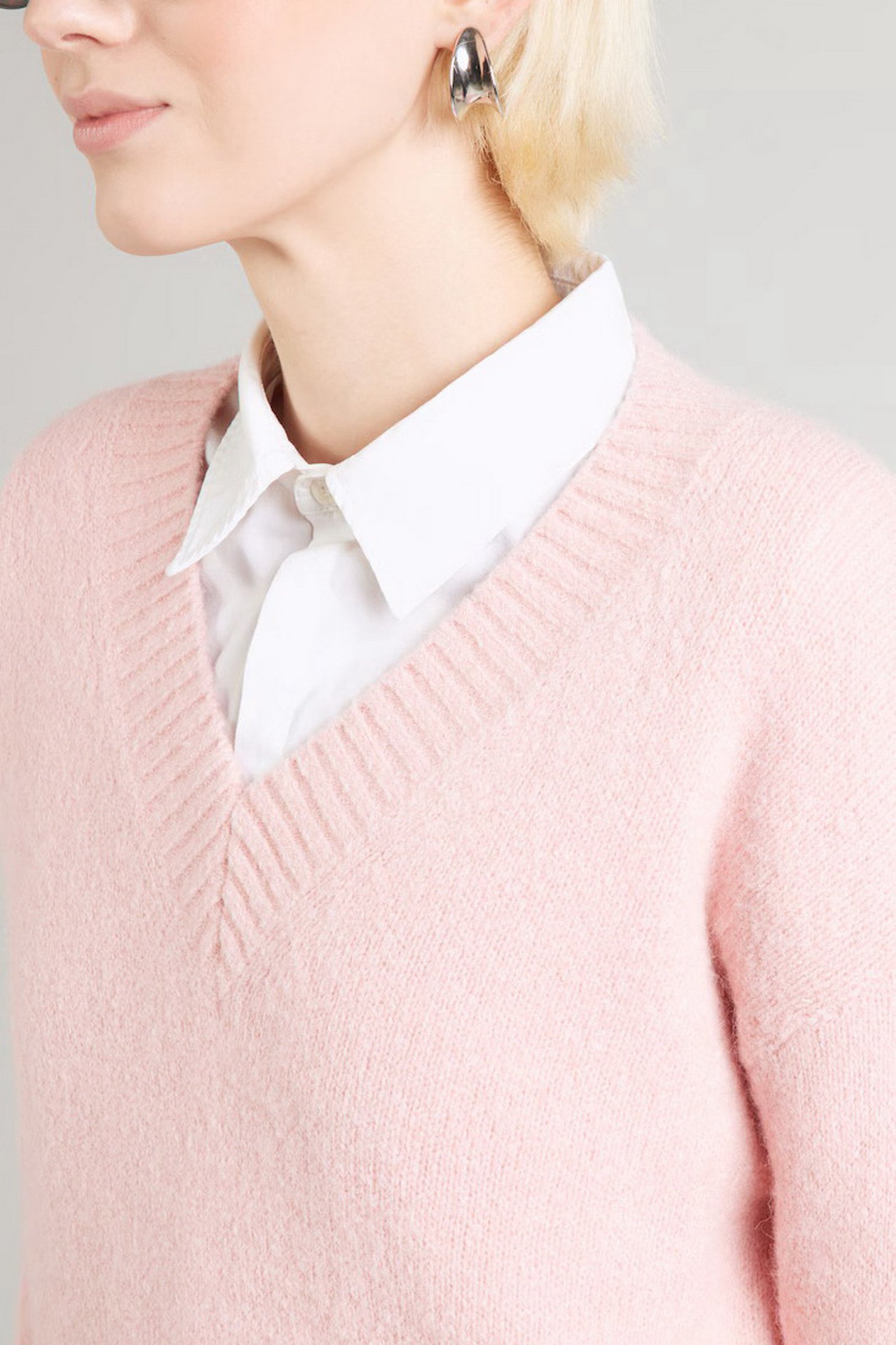 Filato in maglia 45% alpaca, 23% poliammide, 15% cotone, 15% modal, 2% elastan; bordi 43% alpaca, 27% poliammide, 14% cotone, 14% modal, 2% elastan.