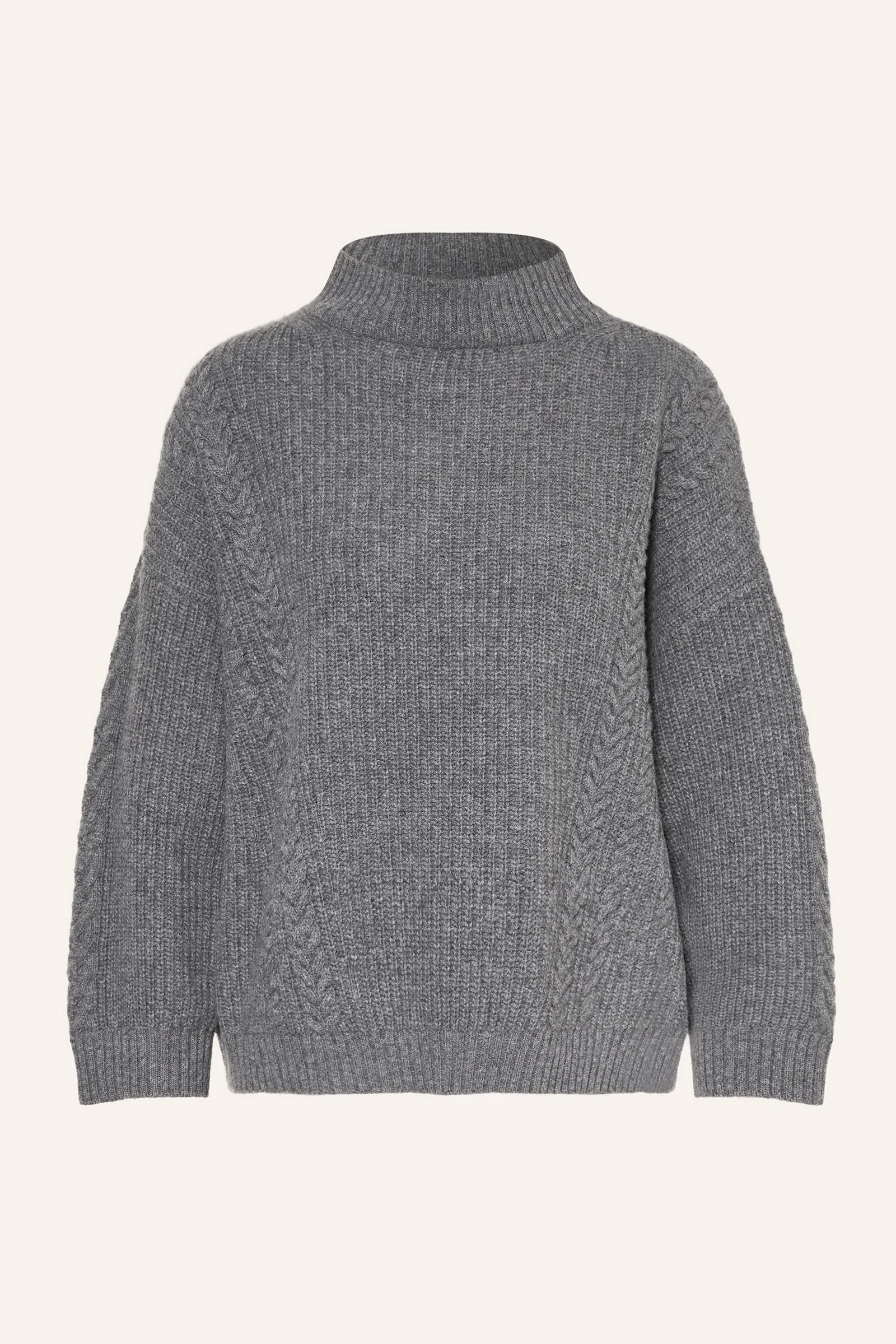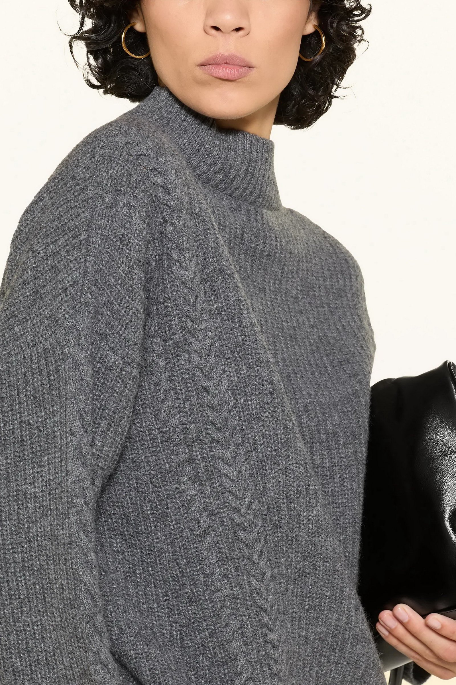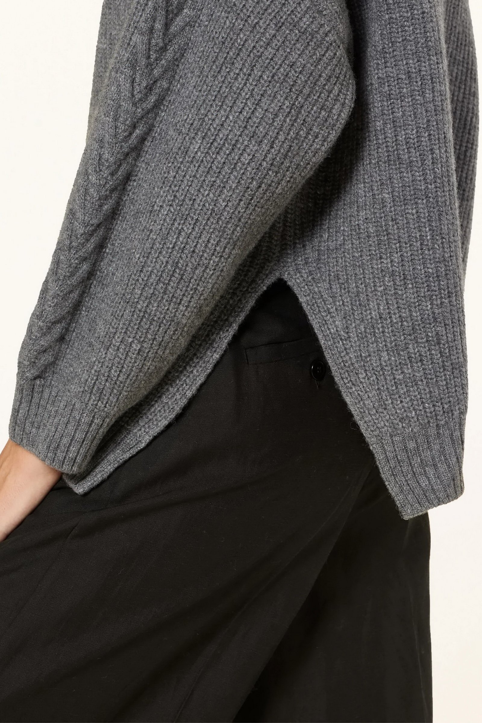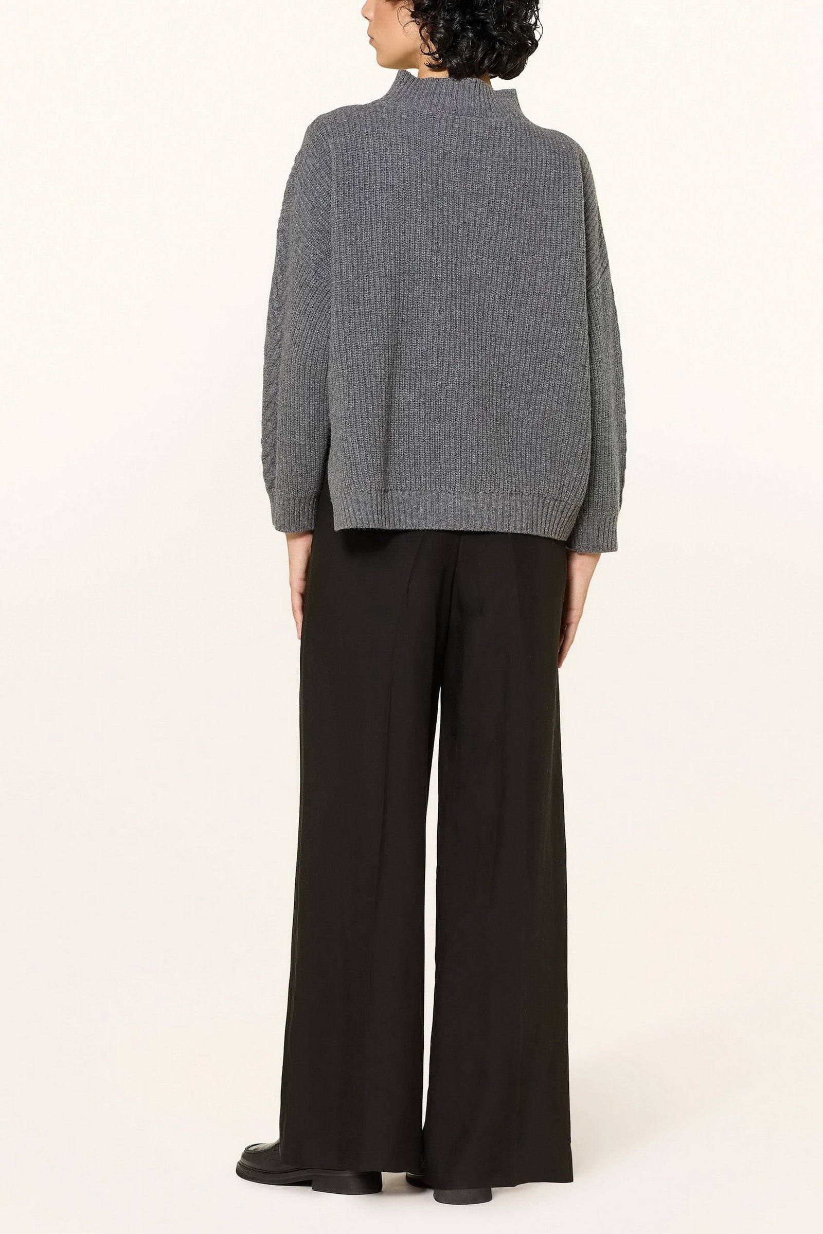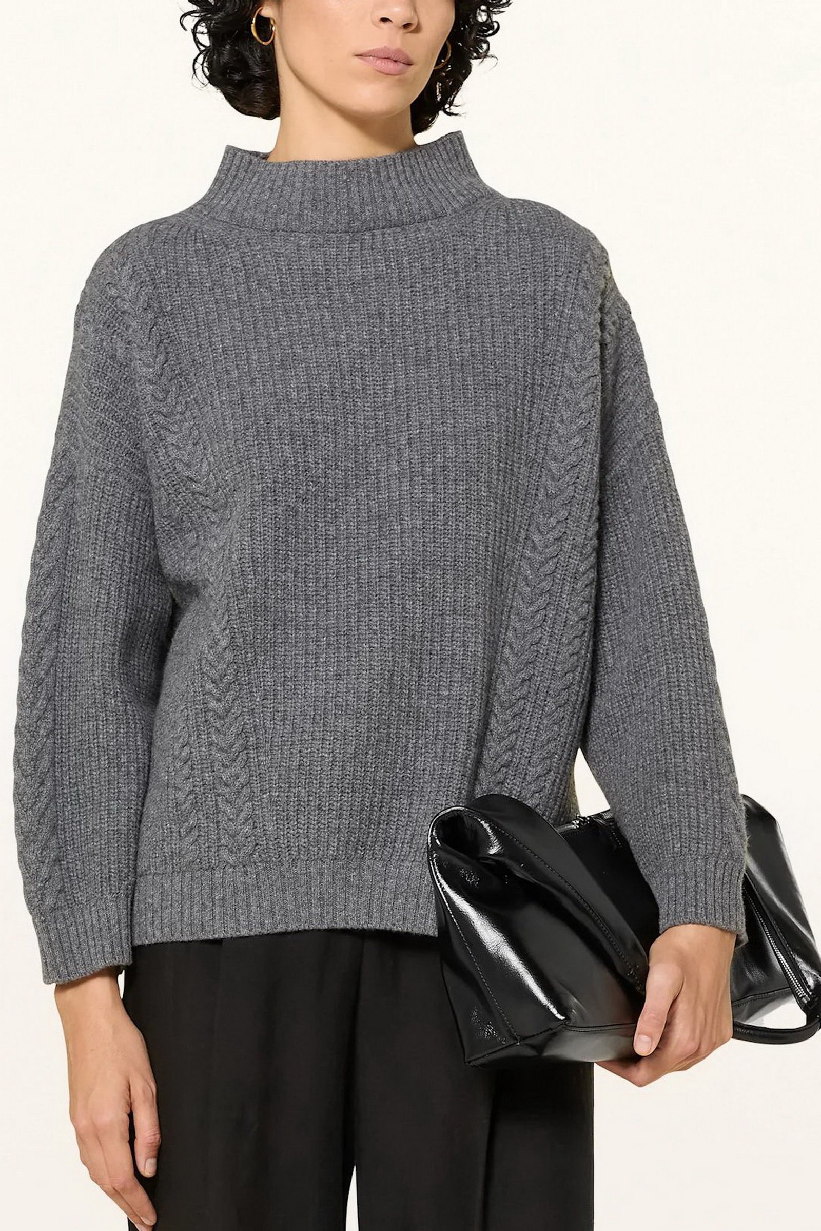 Maglia in filato di pura lana con lavorazione a punto pannocchia. Dal volume morbido, il capo ha collo a cratere, maniche lunghe a giro basso, spacchi laterali. I motivi a trecce arricchiscono la texture del capo.