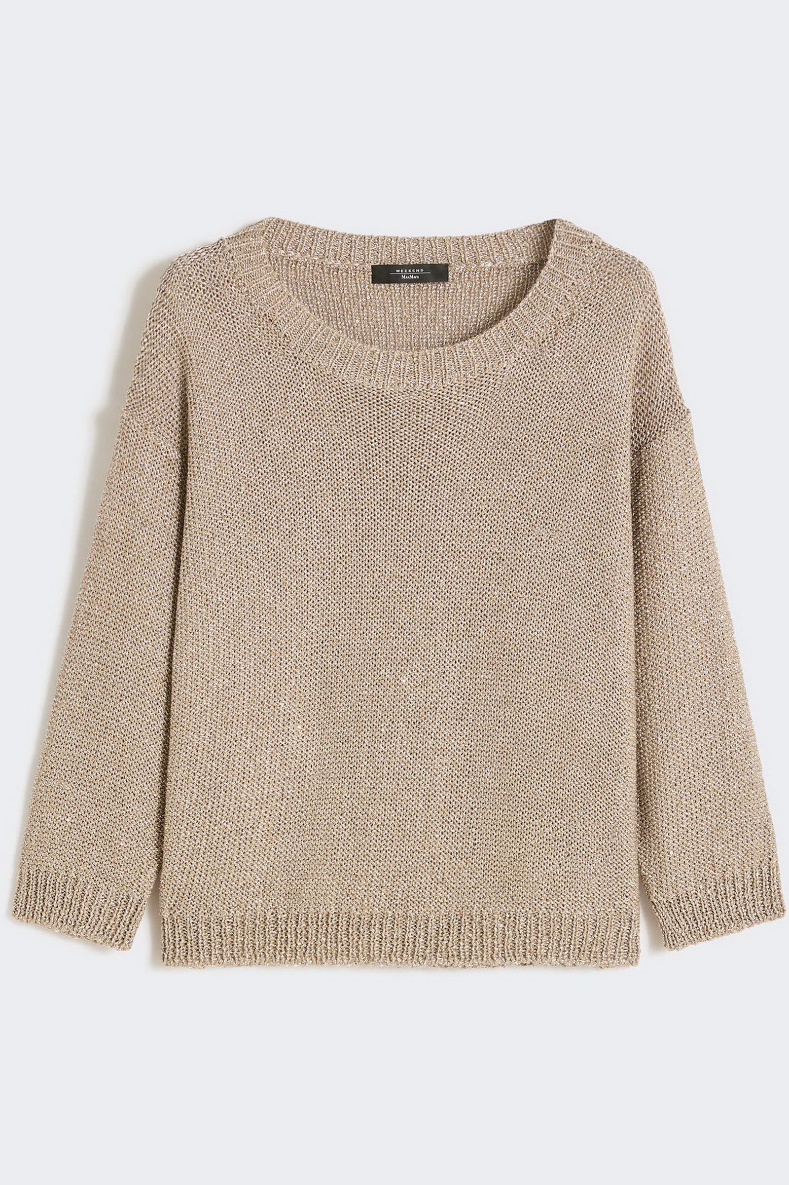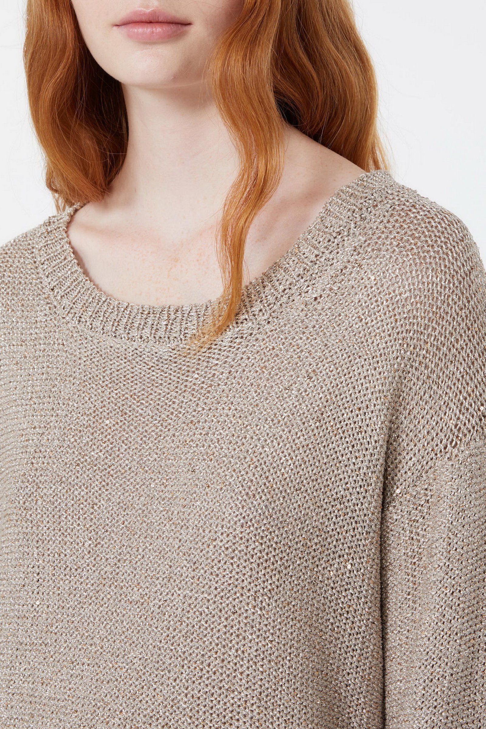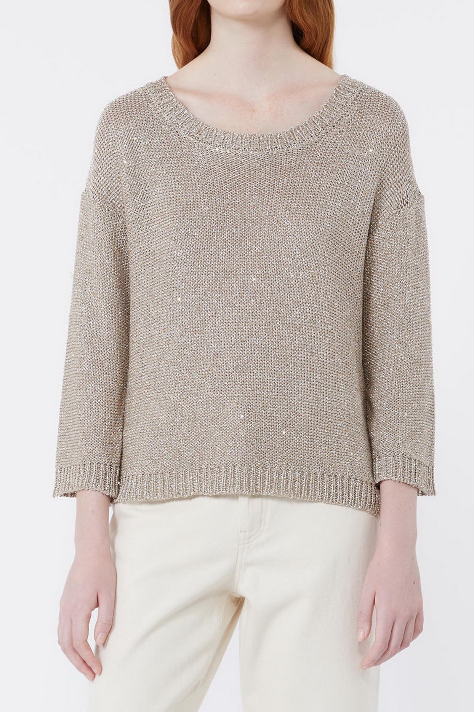 Maglia in filato di misto viscosa con texture metallizzata. Il capo ha scollo rotondo e maniche lunghe. Bordi rifiniti a coste. Linea dritta.