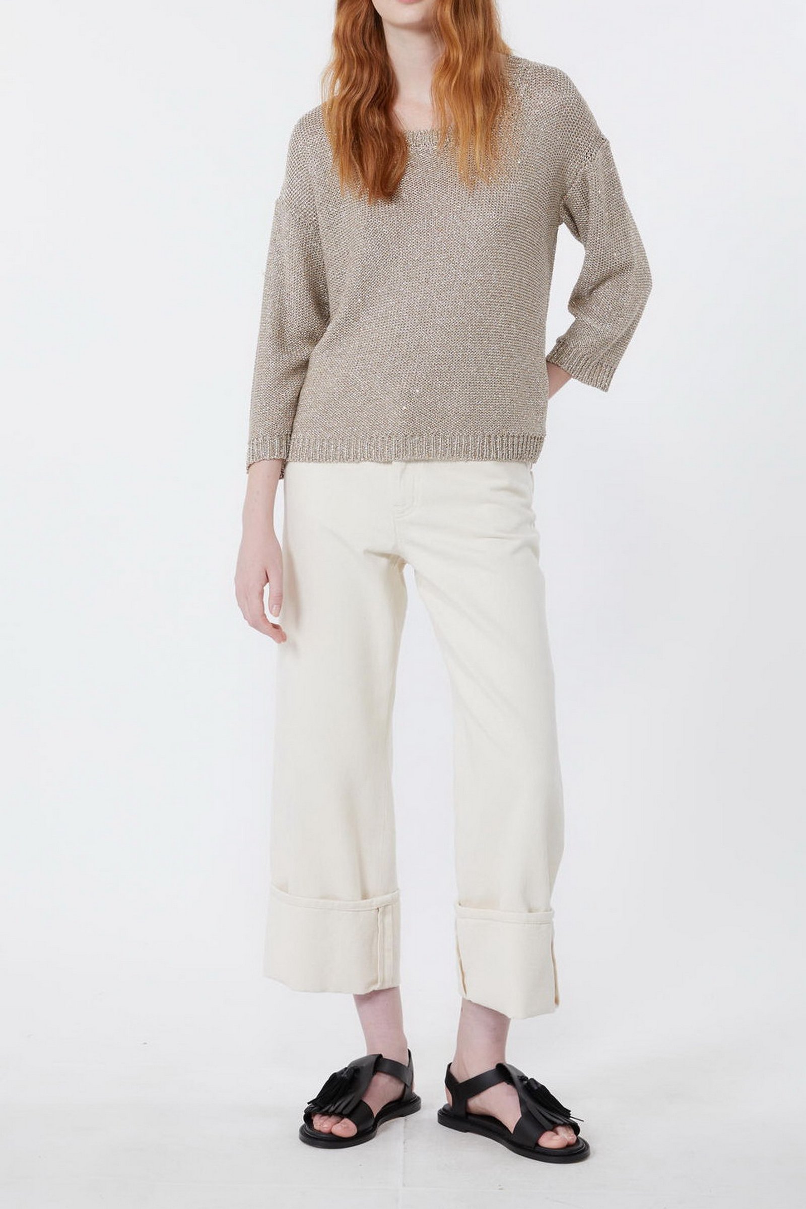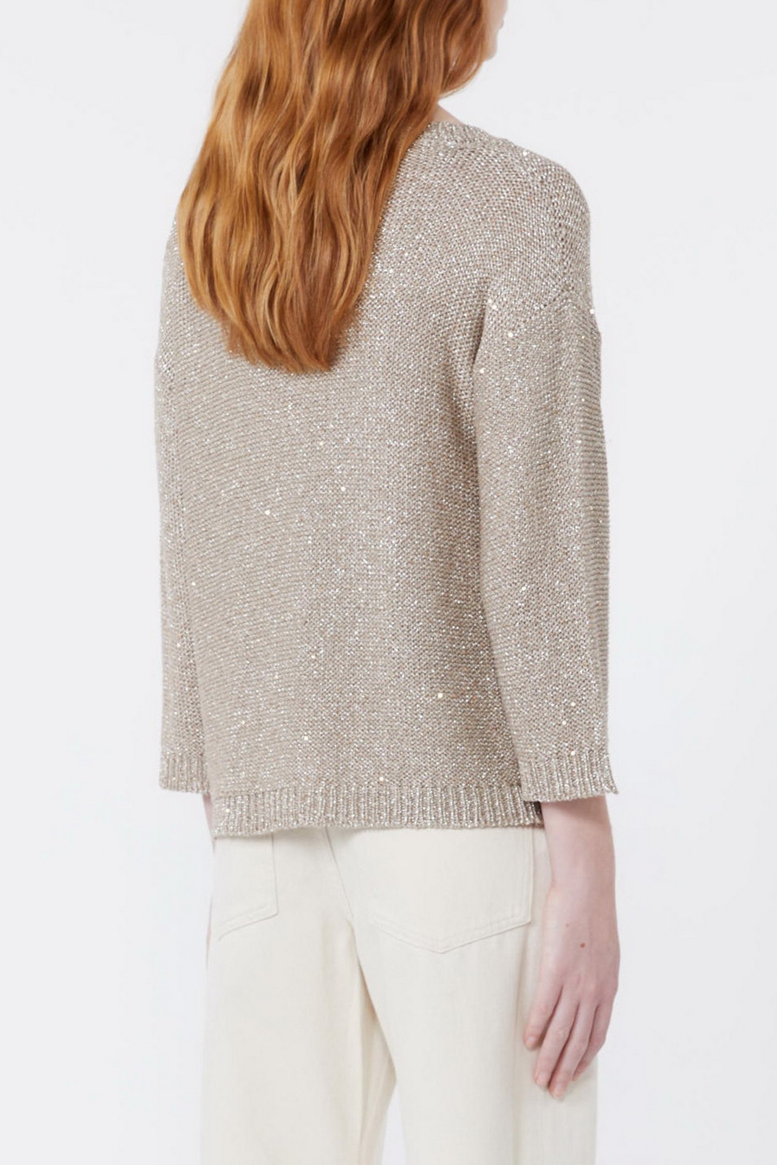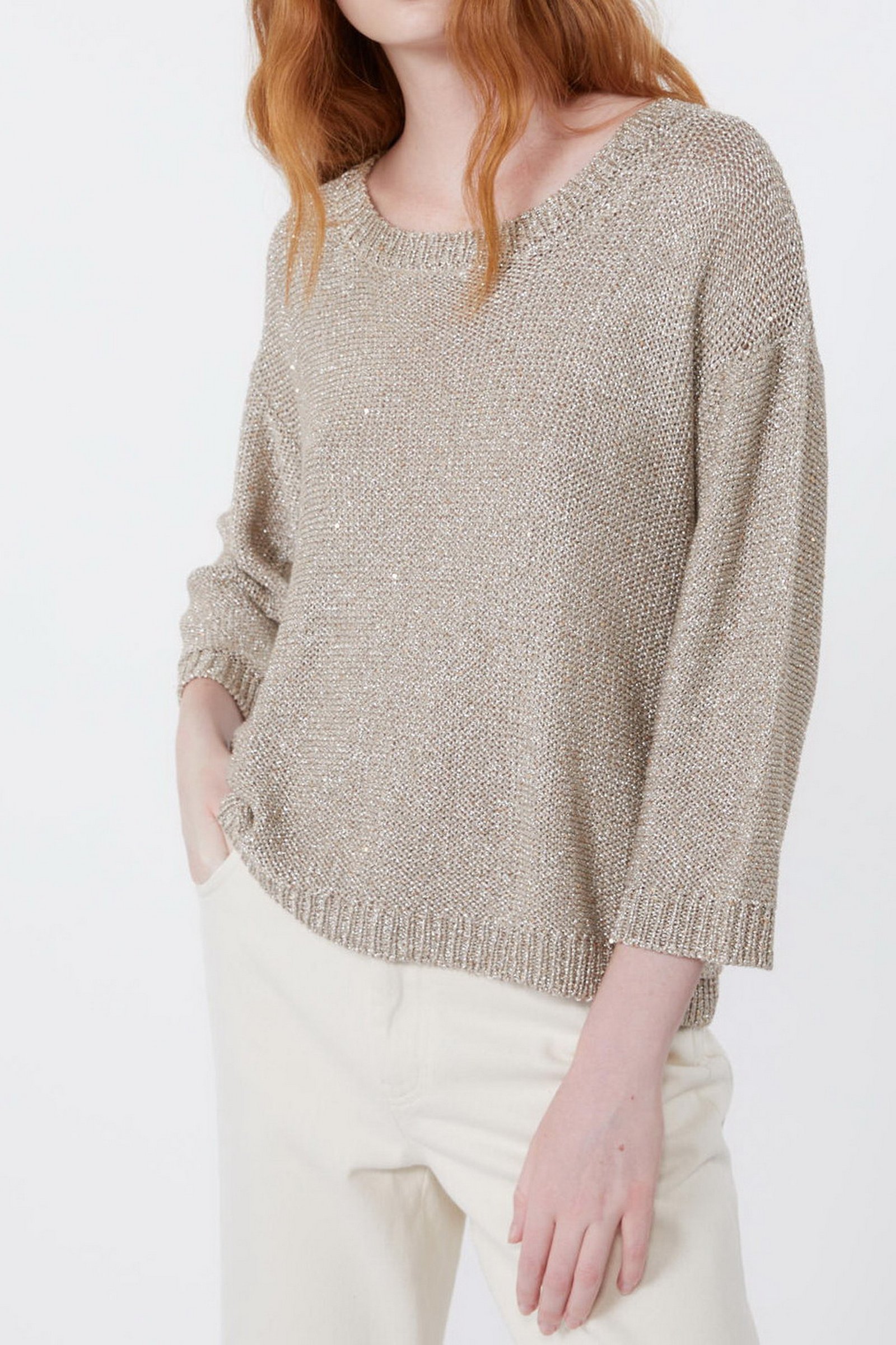 Maglia in filato di misto viscosa con texture metallizzata. Il capo ha scollo rotondo e maniche lunghe. Bordi rifiniti a coste. Linea dritta.