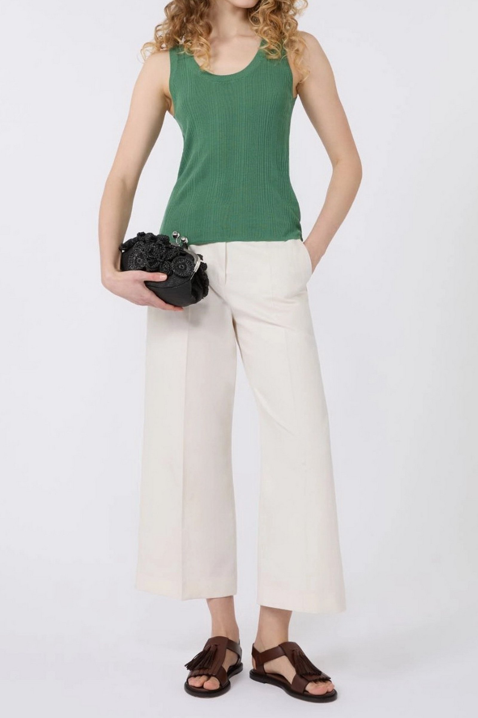 Maglia smanicata dalla linea aderente, rifinito da una lavorazione a coste irregolari.