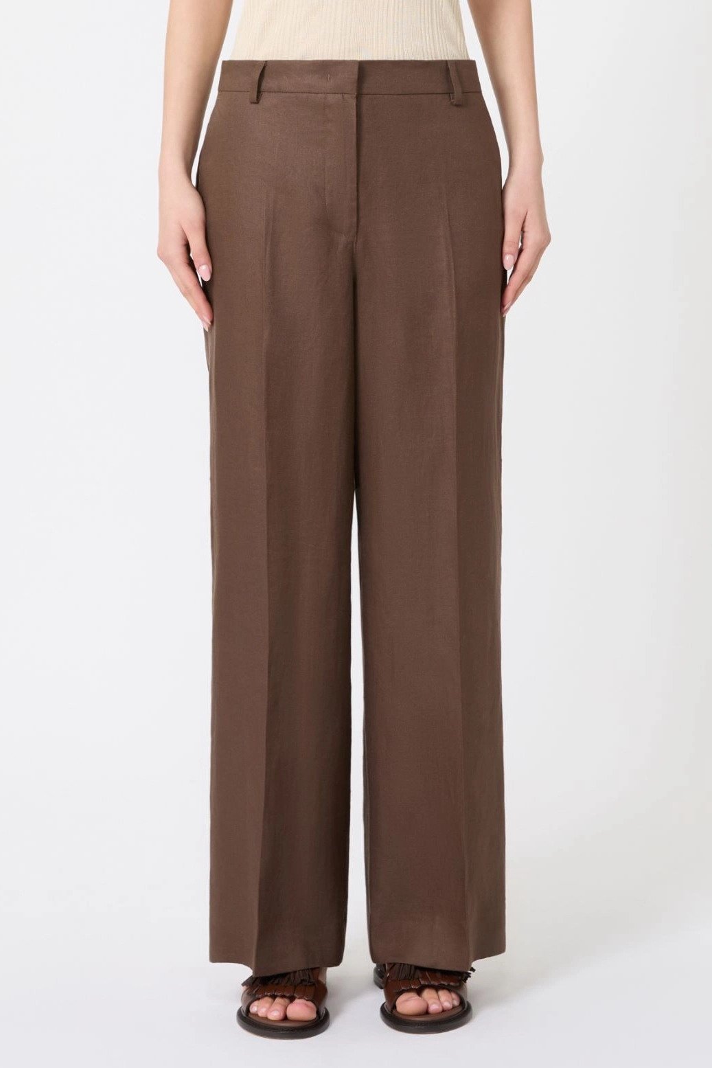 Pantalone wide leg con gamba dritta e piega stirata che definisce il volume.