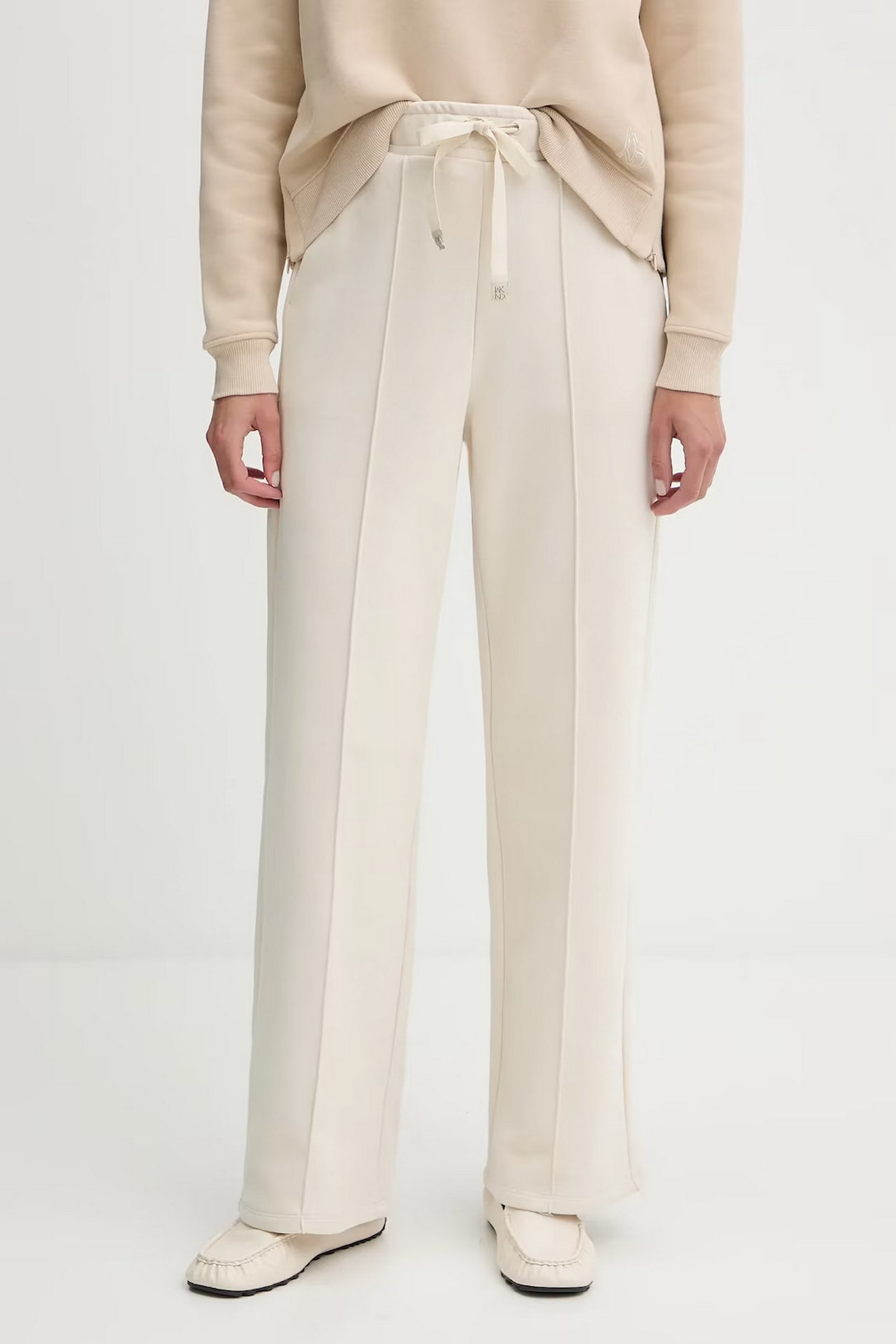 Pantalone dalla texture morbida, con gamba larga e piega cucita sul davanti.