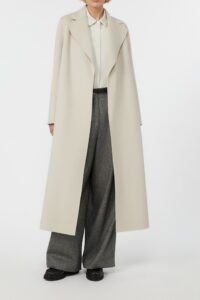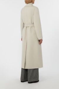 Cappotto lungo a vestaglia con ampio spacco centrale sul retro.