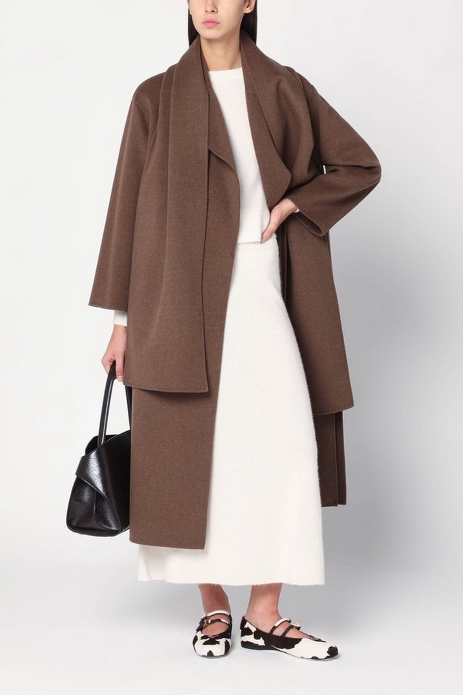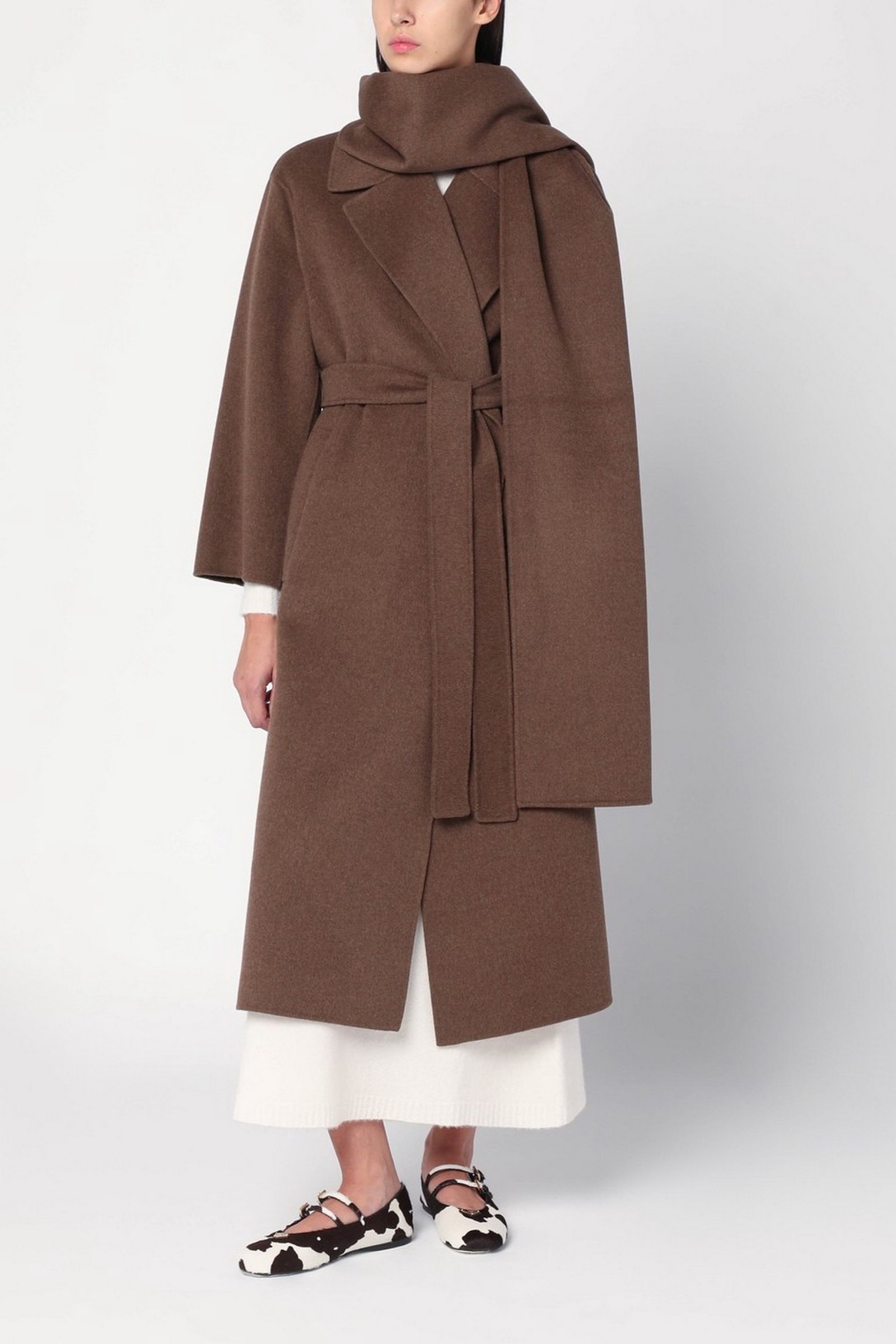 Cappotto lungo dalla silhouette a vestaglia, con sciarpa abbinata ampia per un perfetto total-look.