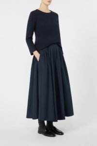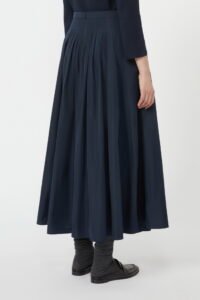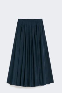 Gonna ampia caratterizzata da una costruzione con pieghe fermate in vita a diverse altezze, che dona movimento.