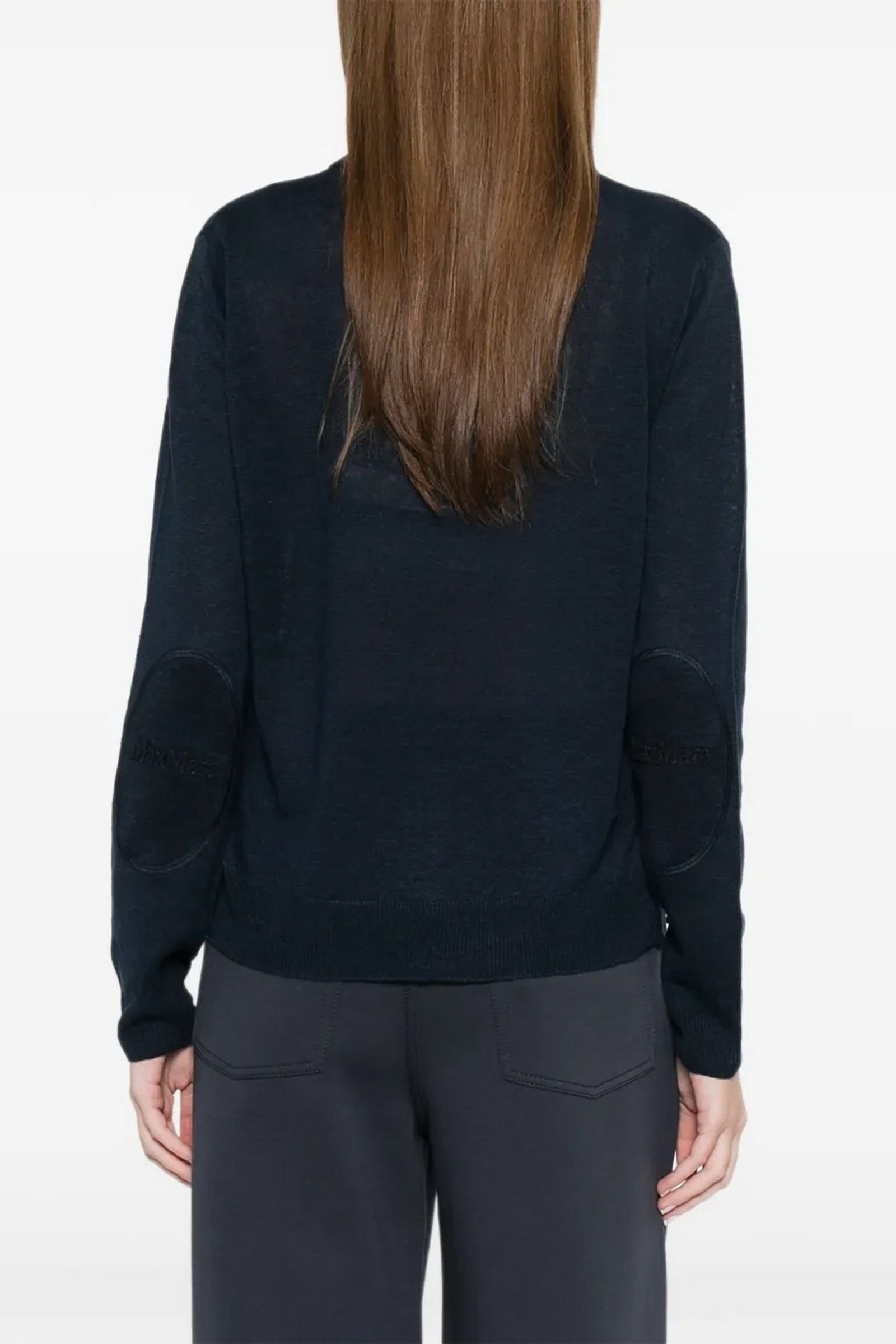 Maglia girocollo, caratterizzata da toppe in maglia tinta unita con logo a rilievo sui gomiti.