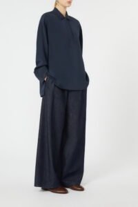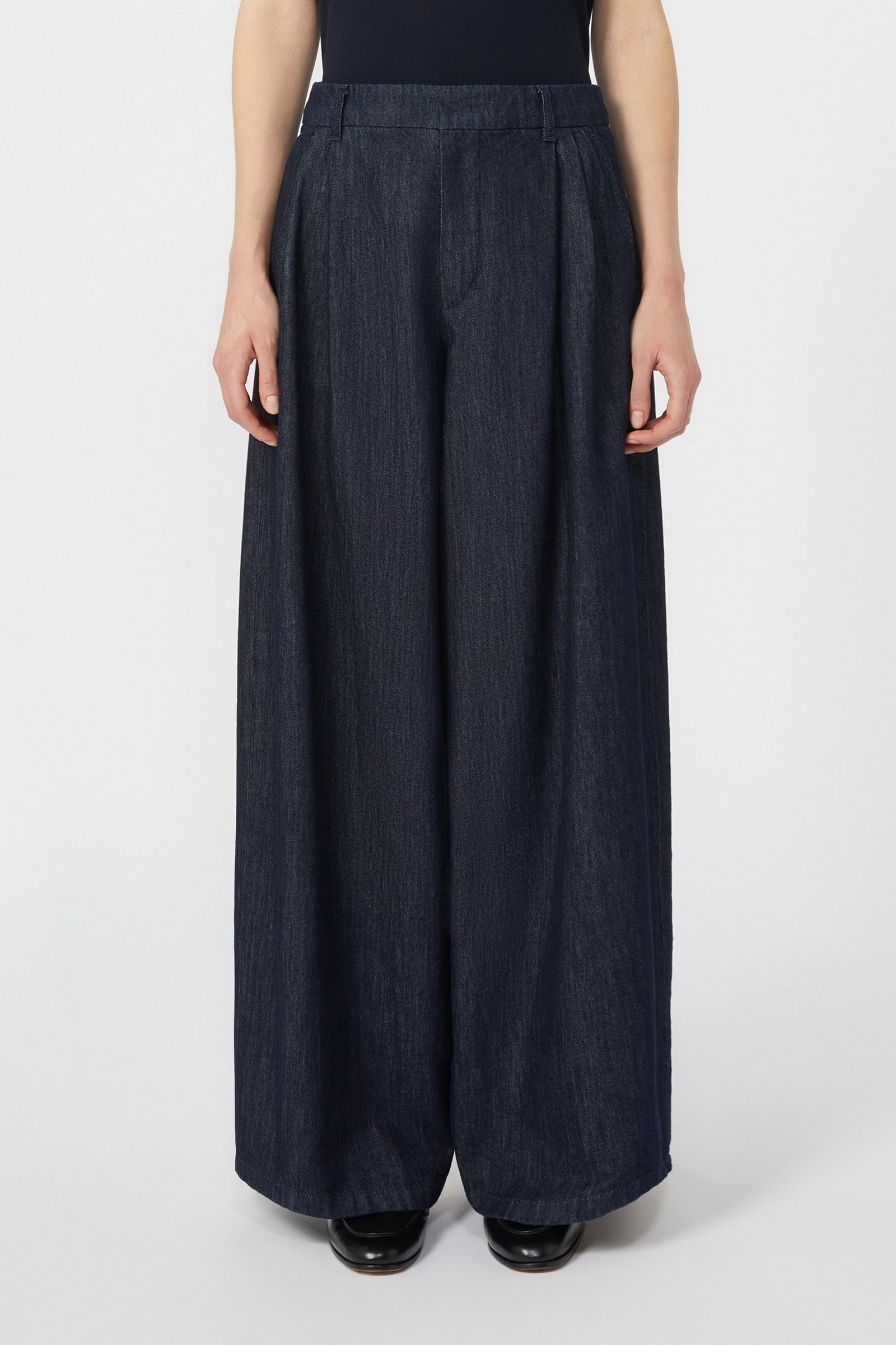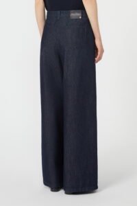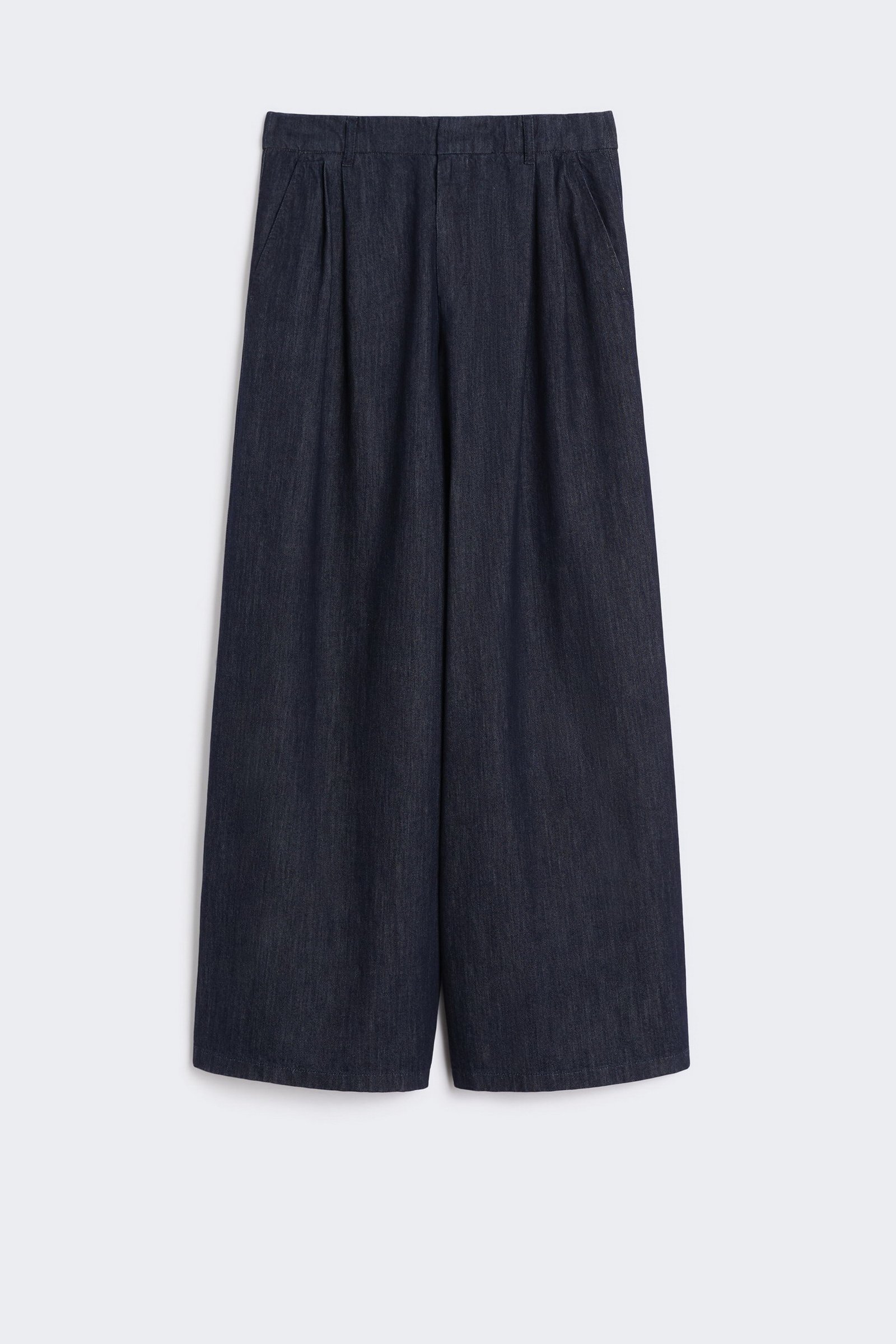 Pantalone con linea ampia sulla gamba e doppia pince in vita sul davanti.