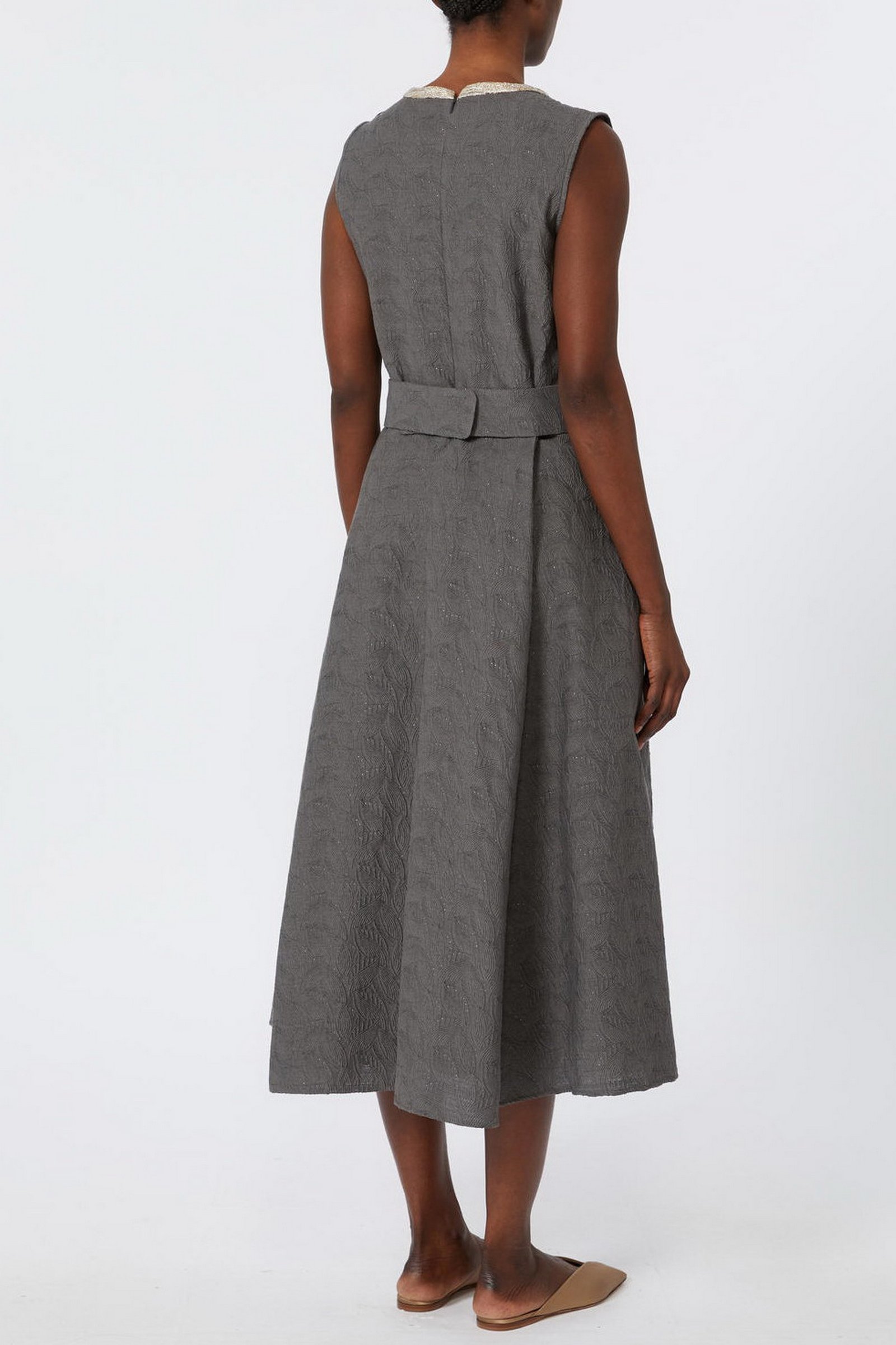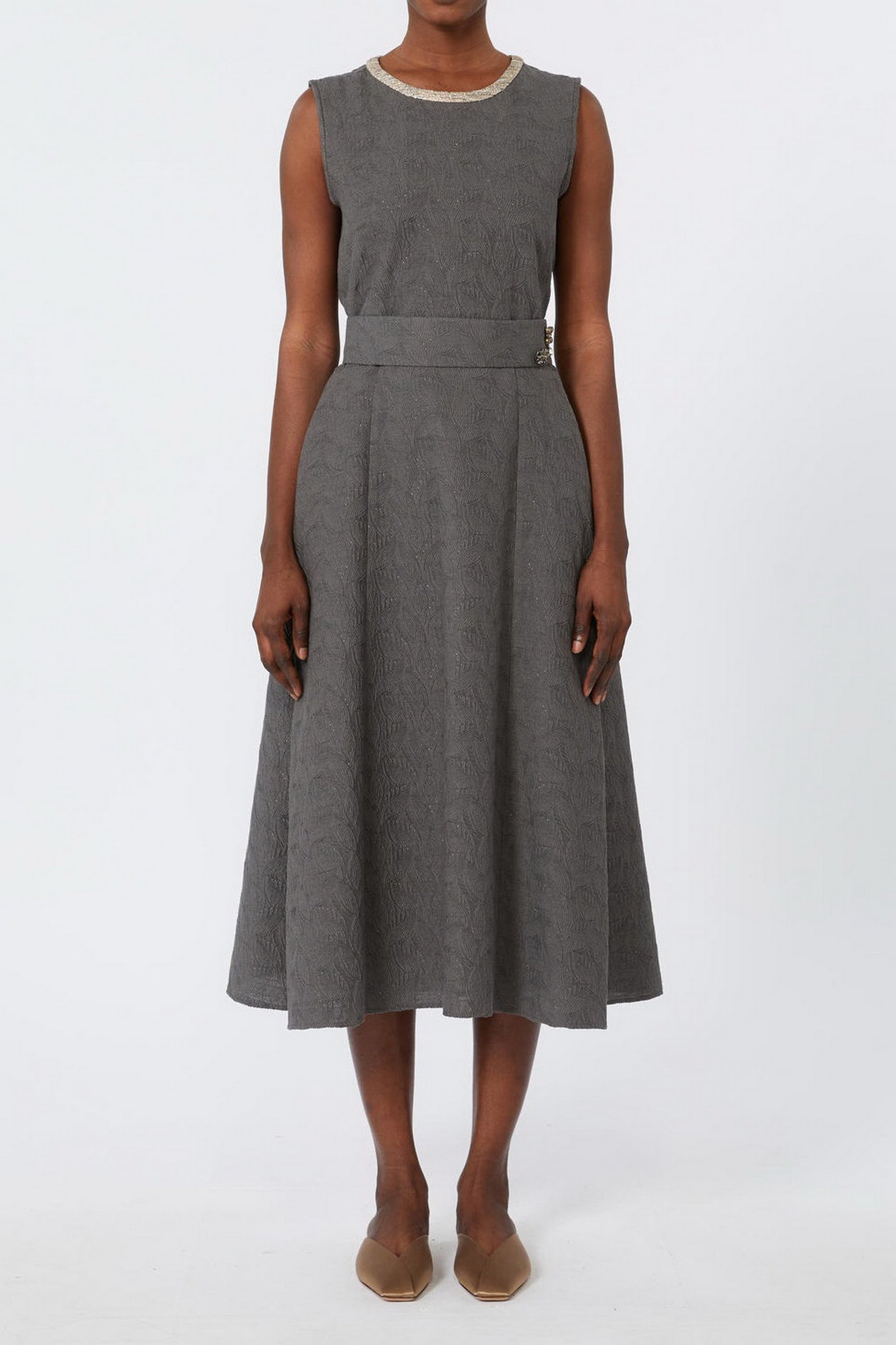 Abito midi smanicato con taglio in vita e gonna svasata con motivo a pieghe.