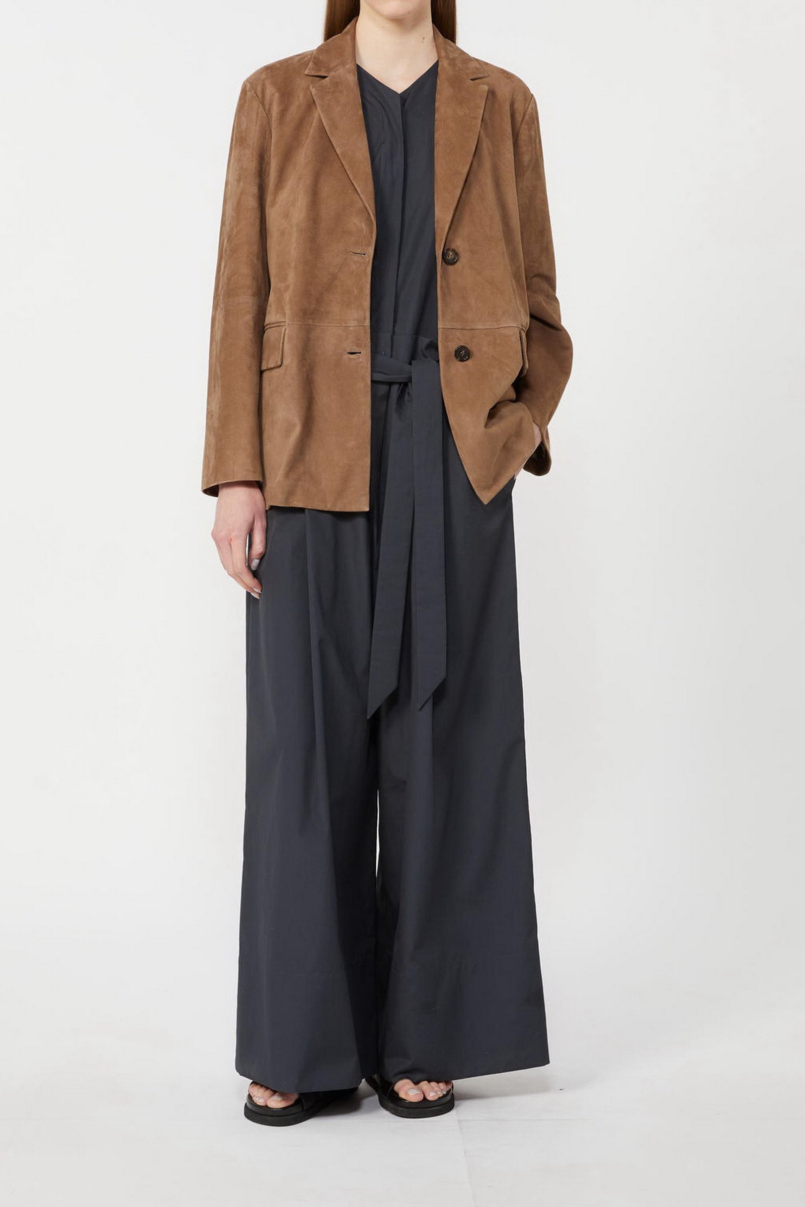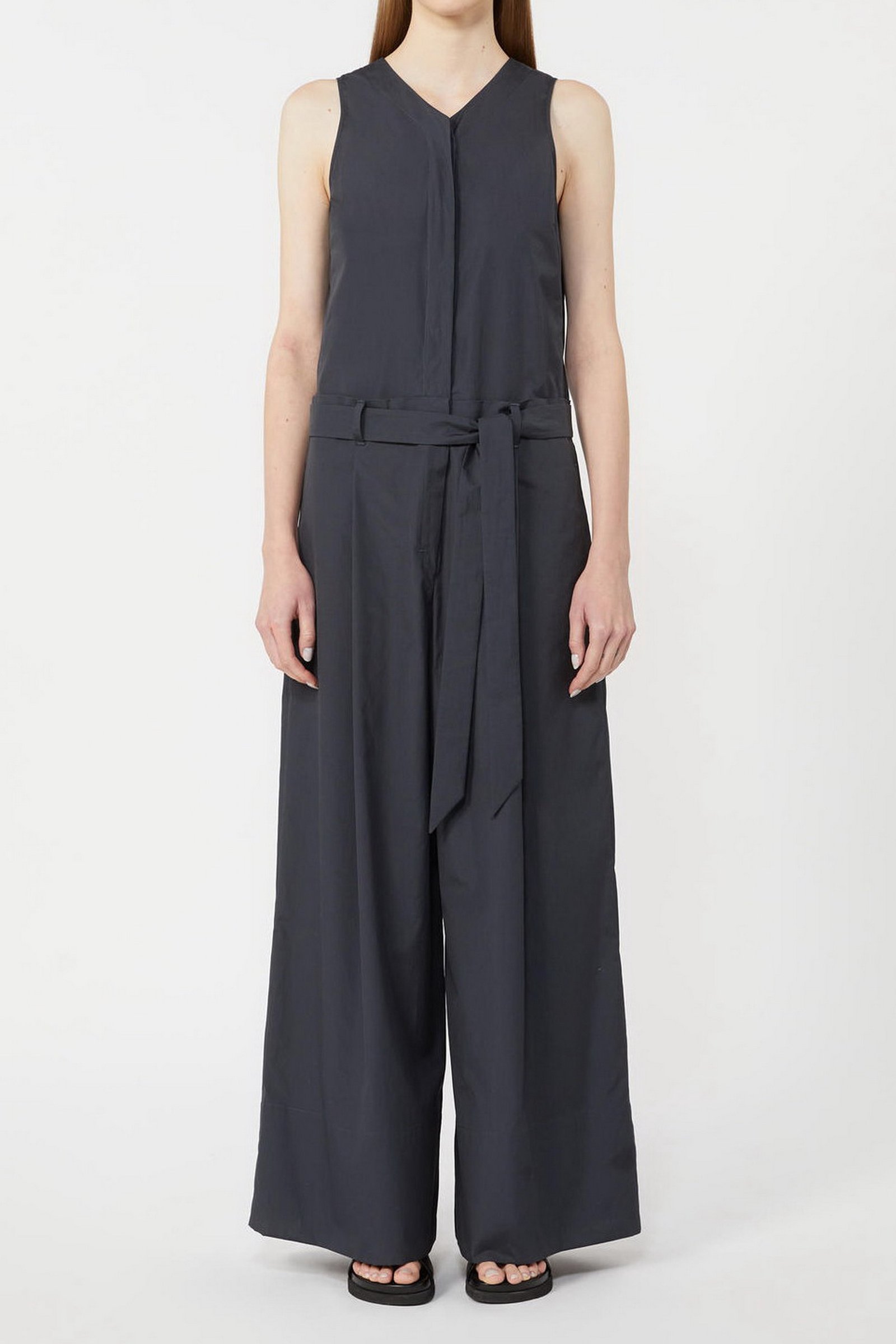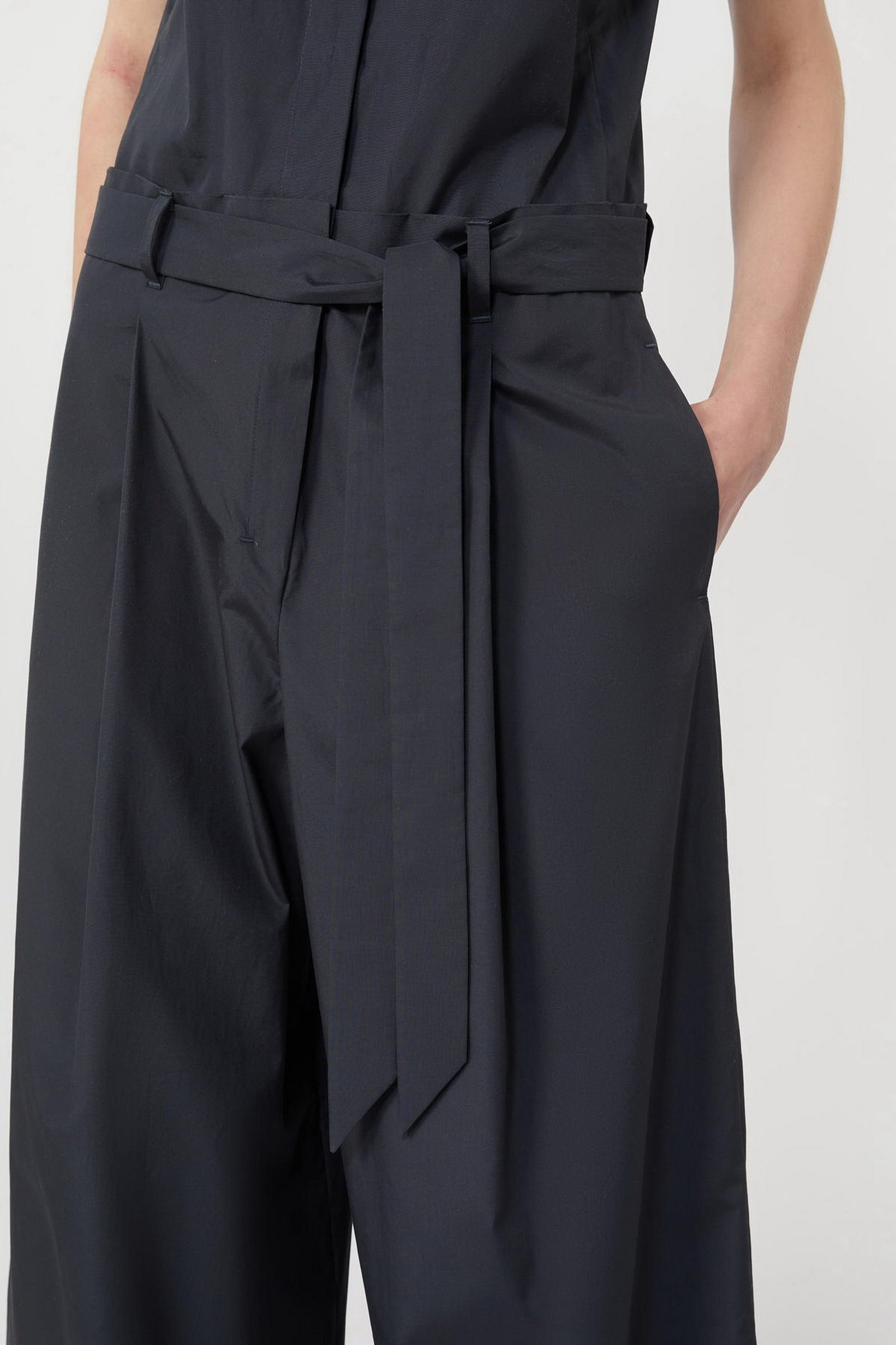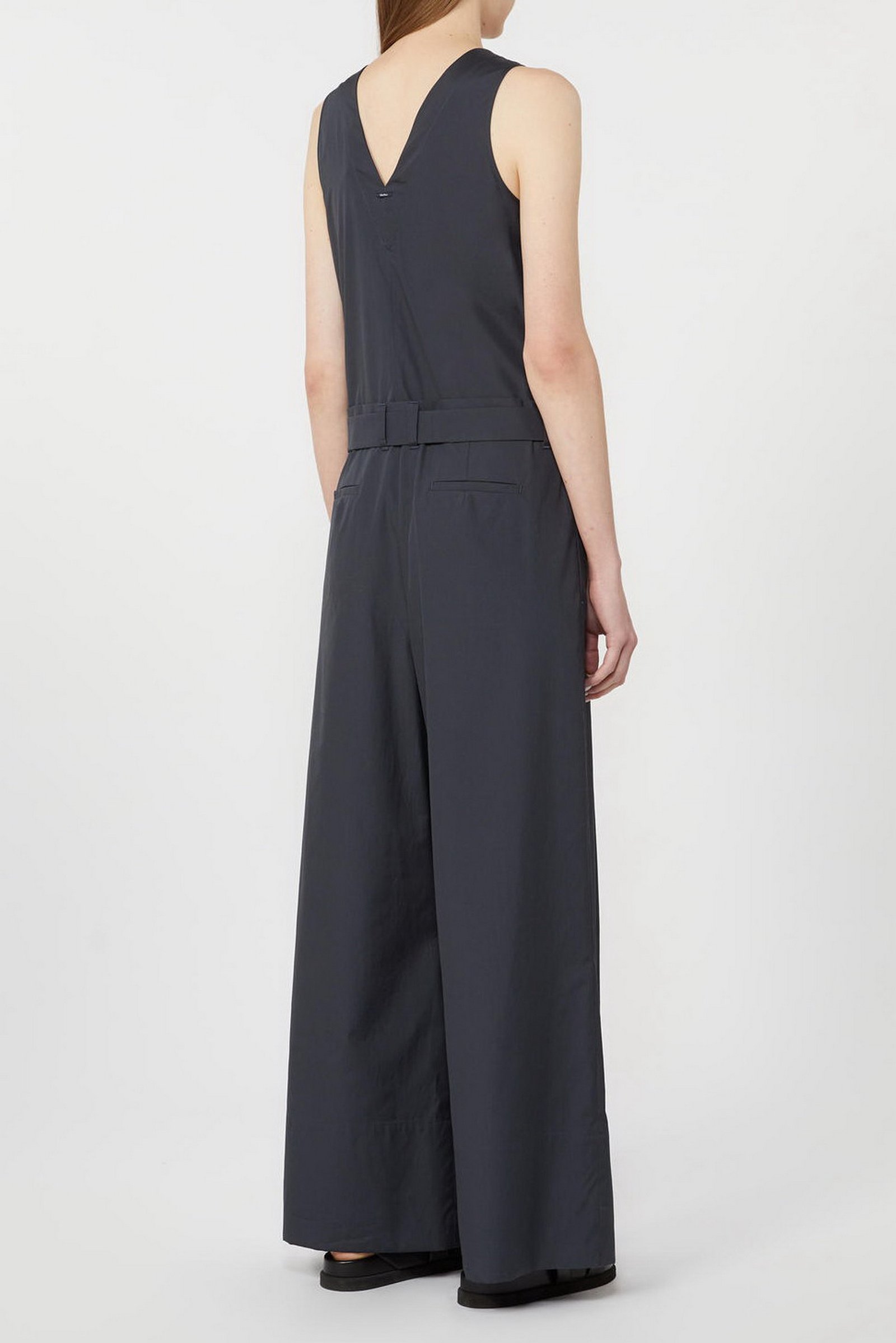 Tuta smanicata, caratterizzata da una silhouette con gamba larga e pinces sul davanti.