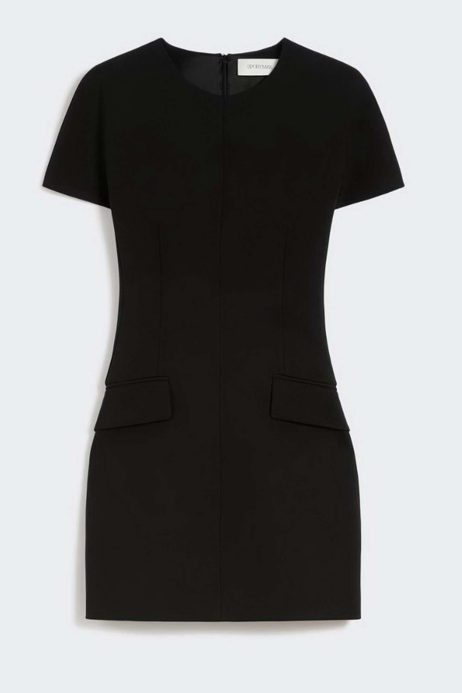 Abito dalla linea a clessidra, realizzato in jersey crêpe. Le pince e i fianchi sagomati disegnano un punto vita aderente, mentre i fianchi rimangono arrotondati, con tasche a patta di ispirazione maschile. Maniche corte con taglio a kimono.
