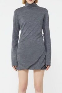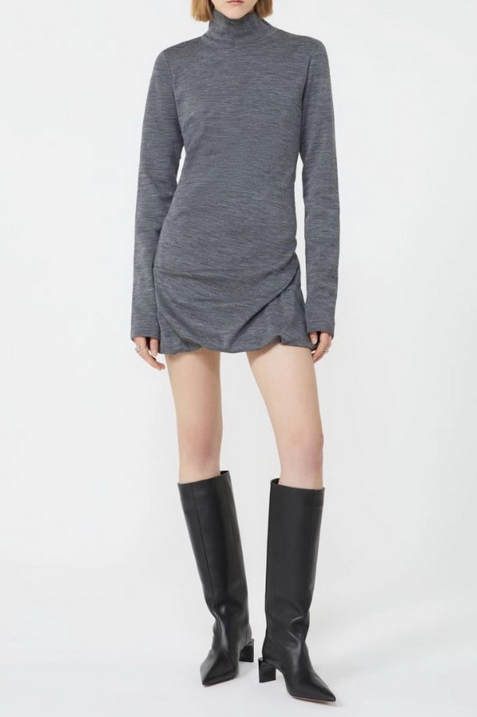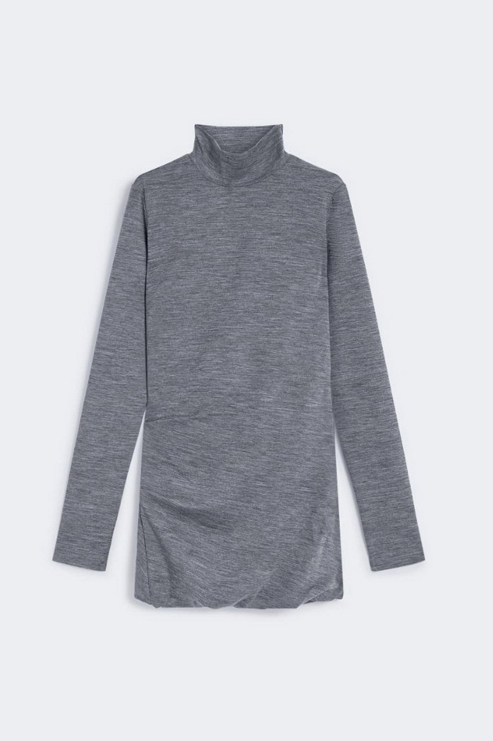 Abito in jersey fluido con costruzione a chiocciola, che crea drappeggi e twist. Aderente, presenta collo a lupetto e maniche lunghe.