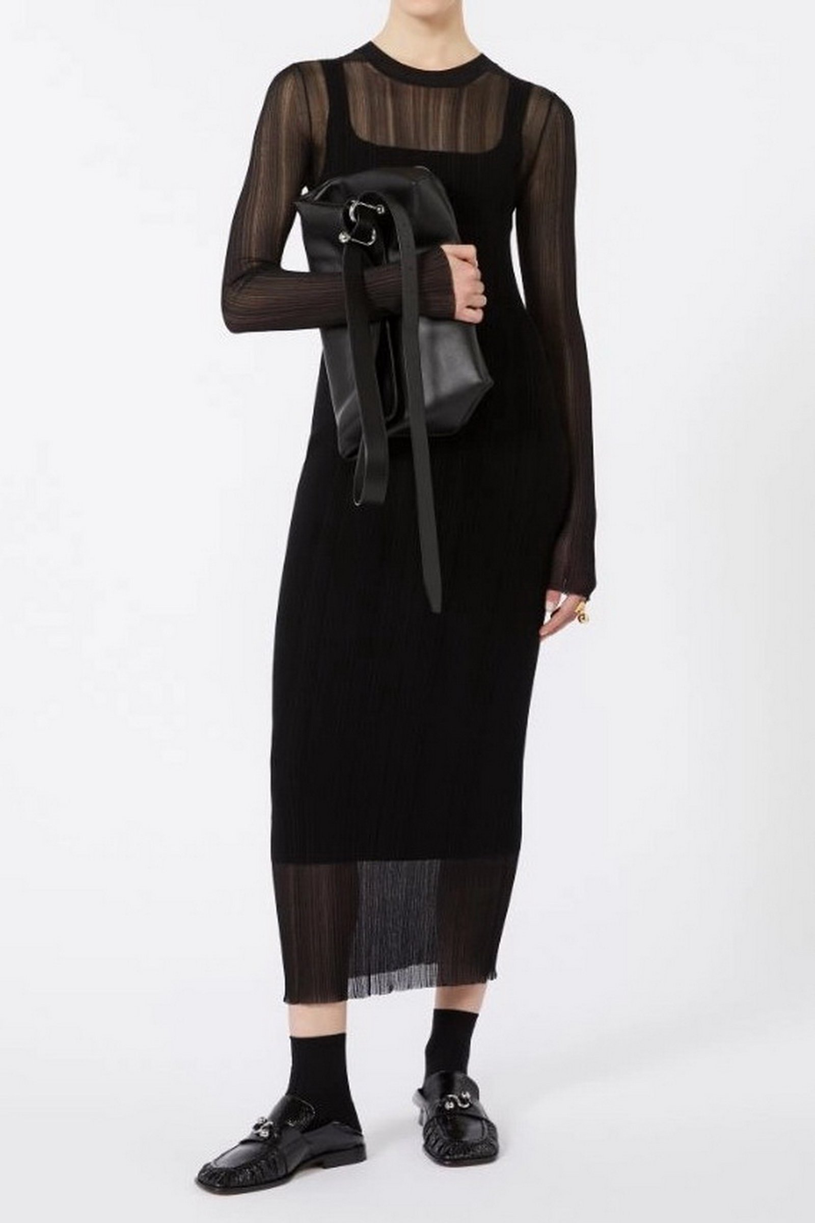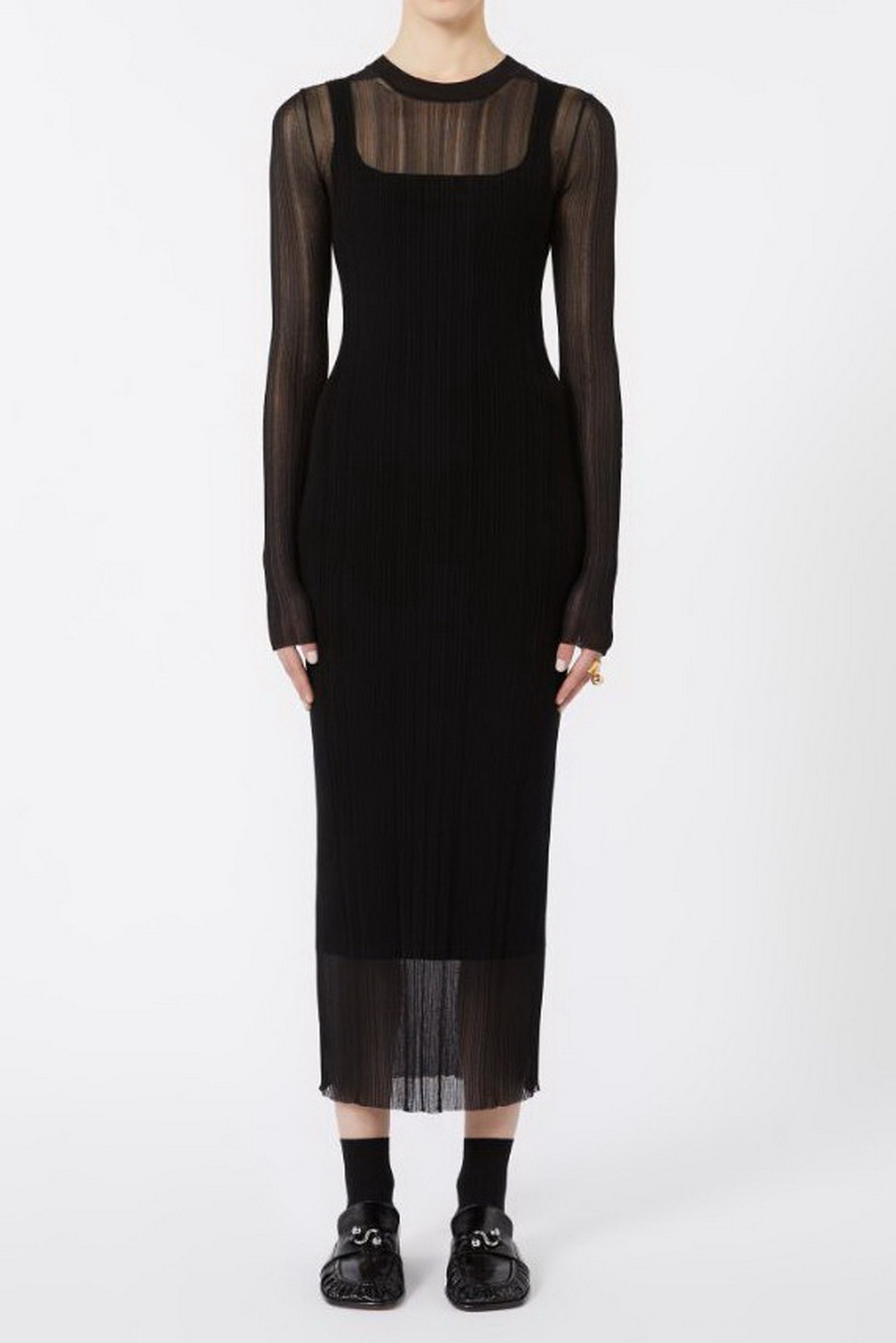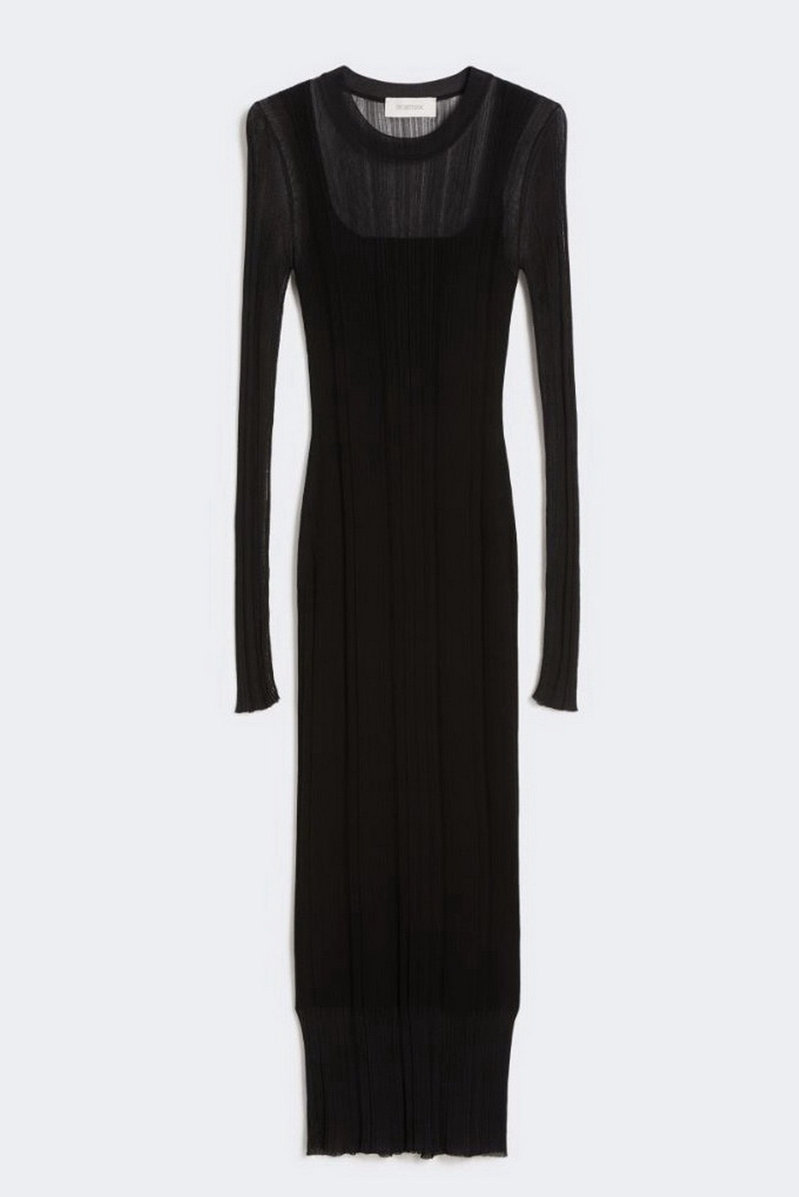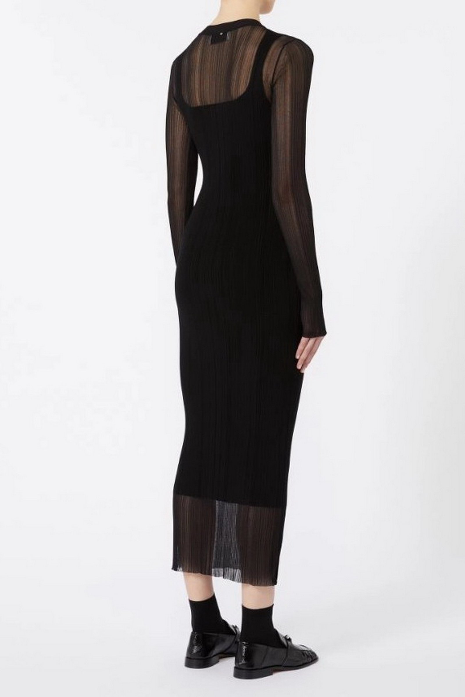 Abito in maglia di viscosa stretch, con una speciale lavorazione semi trasparente e opaca per un effetto trompe l’oeil. Manica corta e fit aderente per una silhouette in evidenza. – Abito in maglia di viscosa stretch a coste – Scollo a giro e manica corta – Maglia con effetto trompe l’oeil coprente con linea a canottiera – Vestibilità regolare