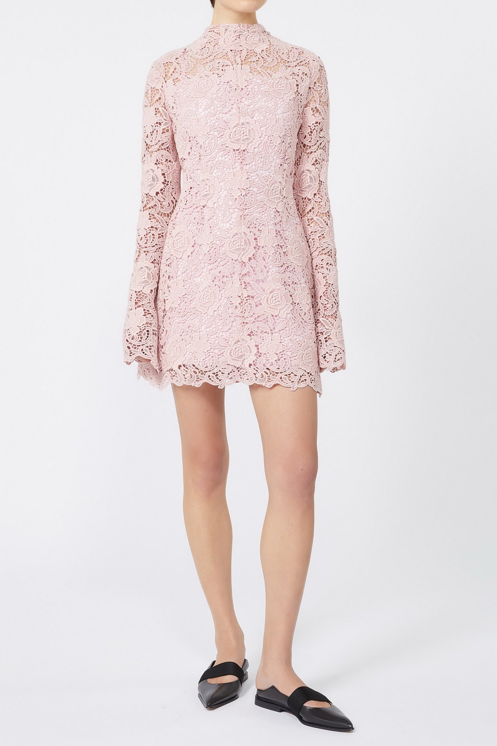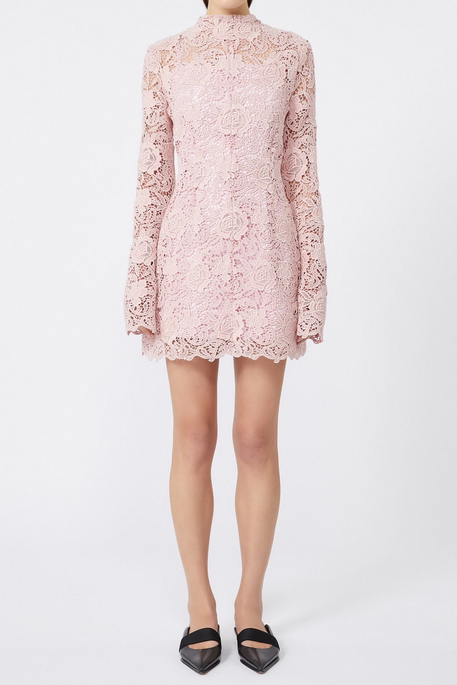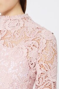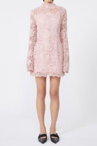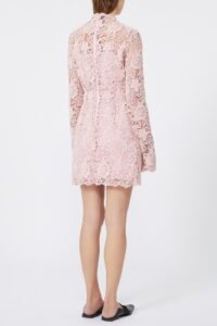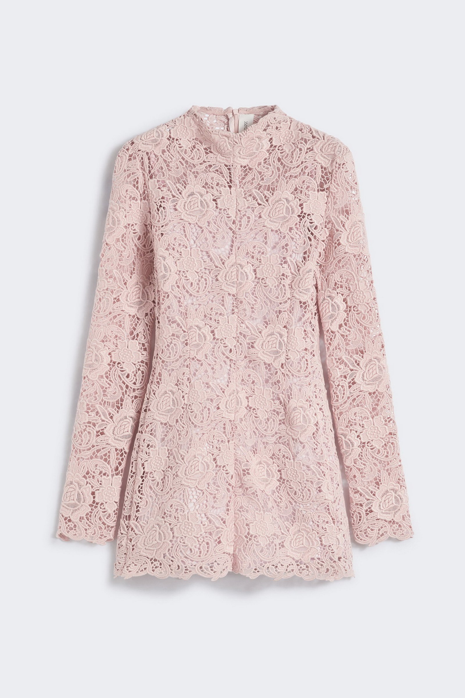 Abito dalla silhouette grafica, realizzato in macramè floreale. La costruzione con pince e fianchetti sagomati enfatizza i fianchi e stringe il punto vita.