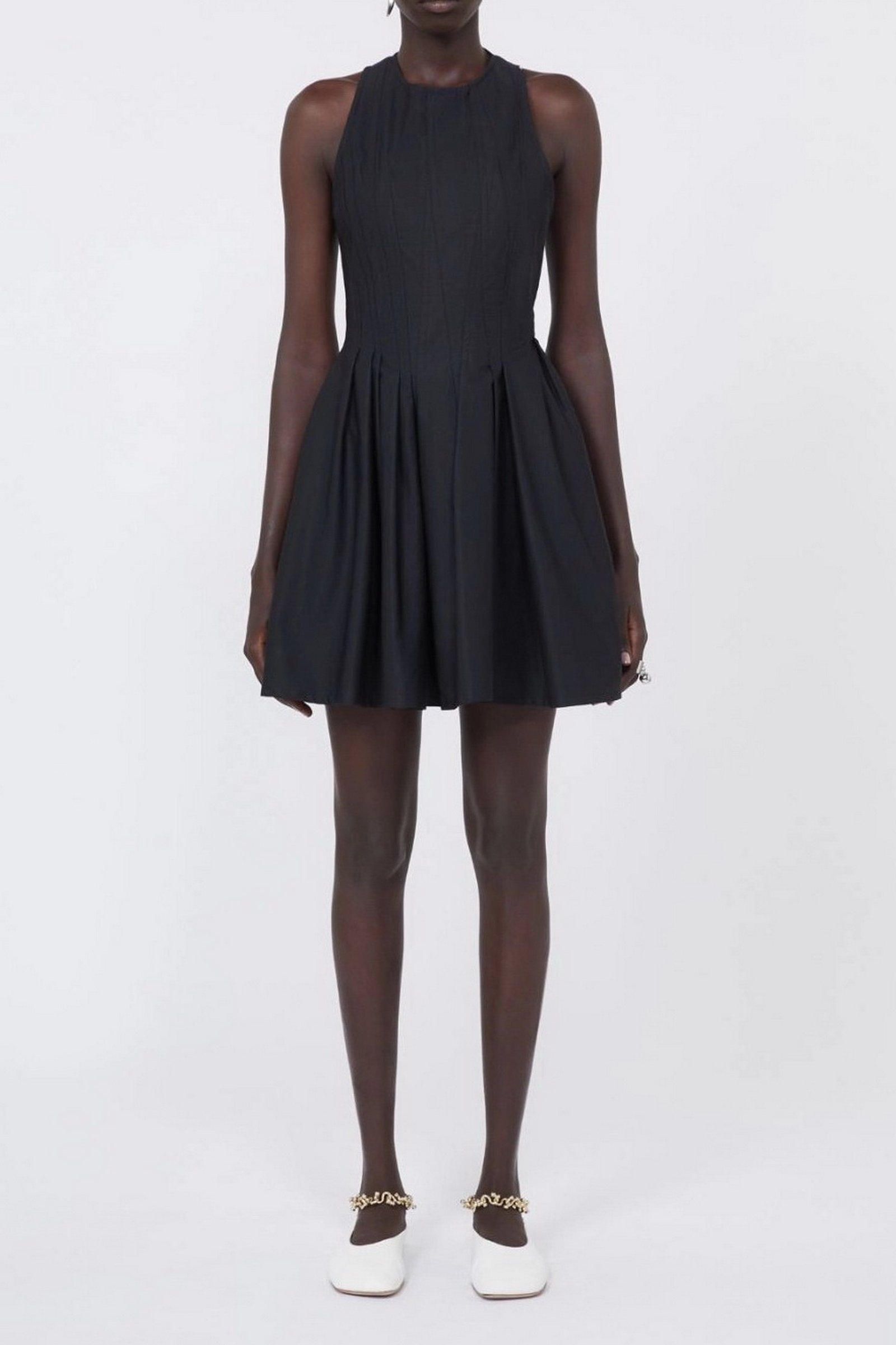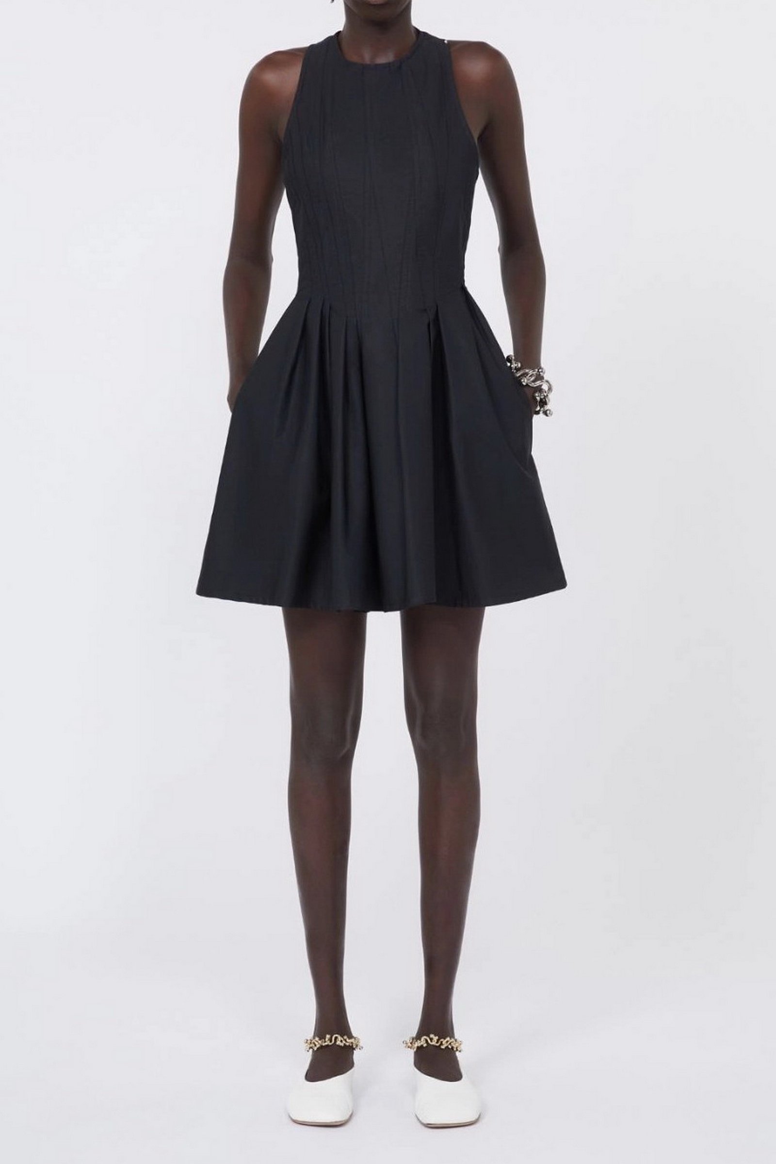 Abito corto in tela pesante di puro cotone, con linea smanicata e motivo di tagli e pince irregolari sul corpino. Il volume si allarga morbidamente sulla gonna.