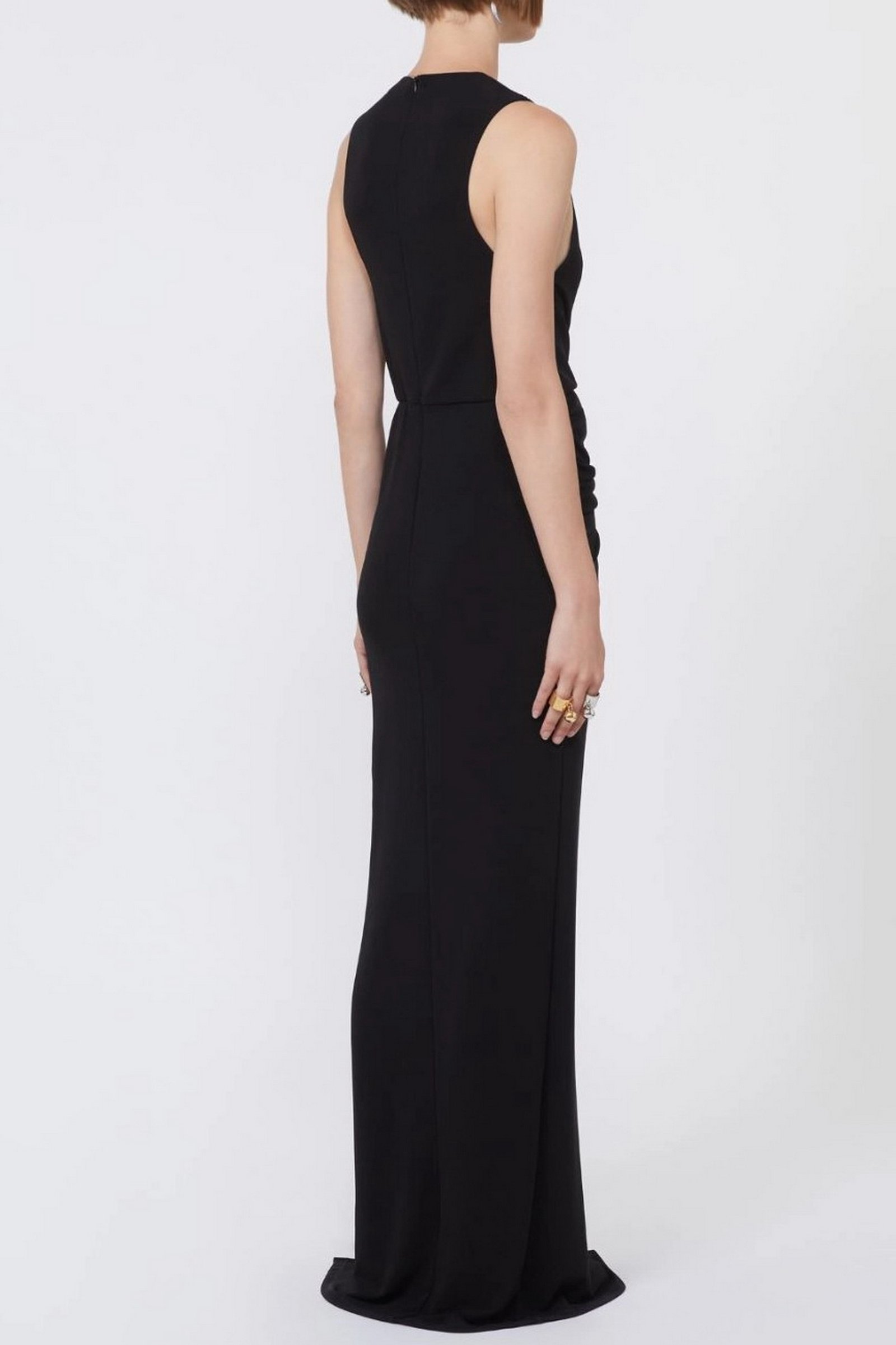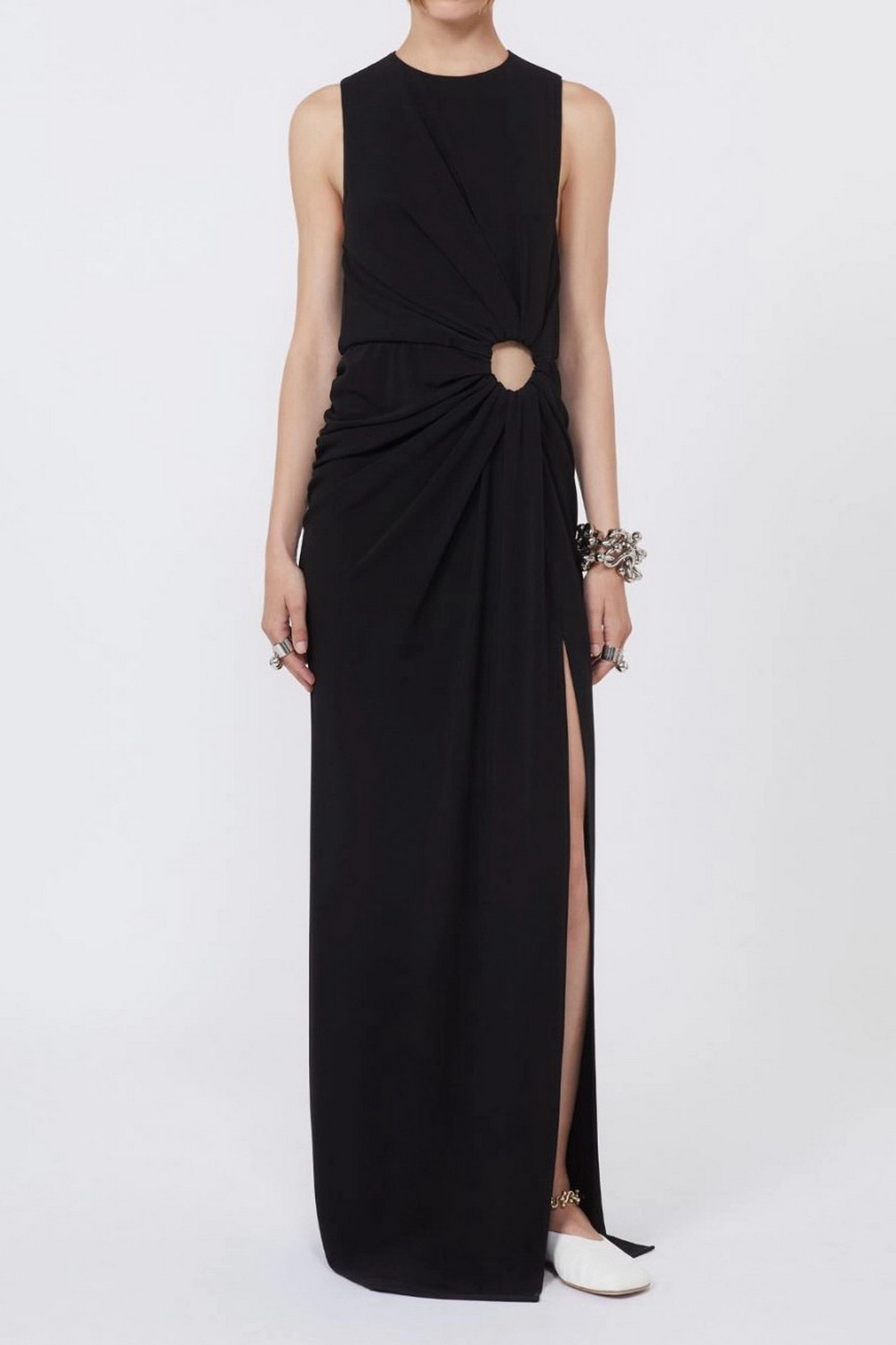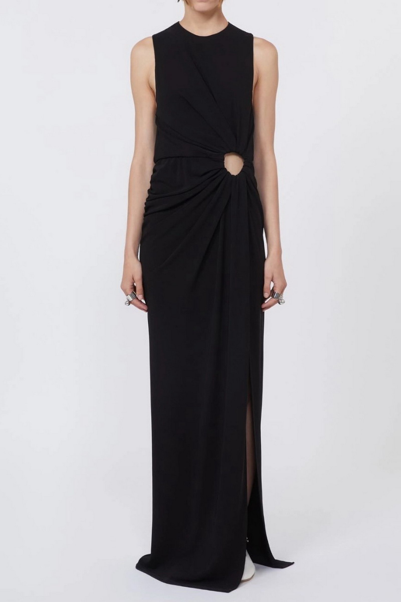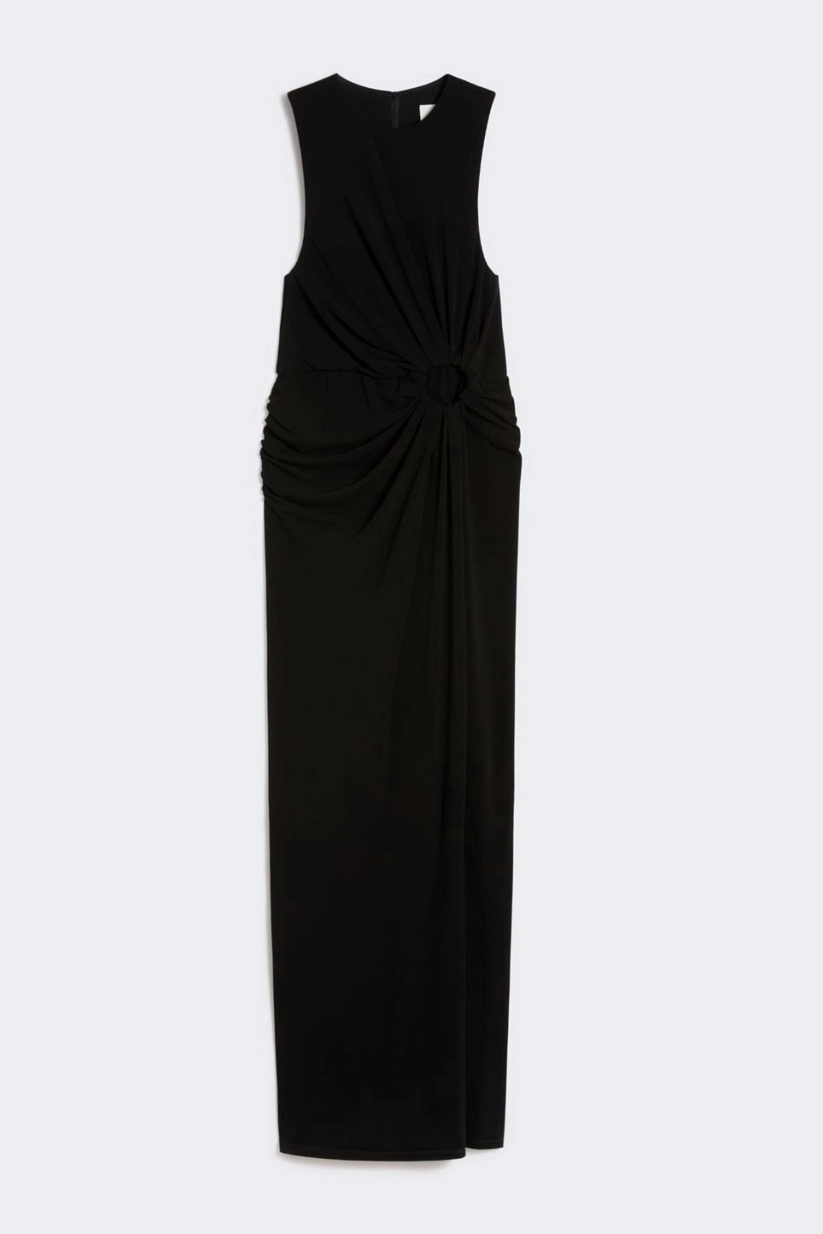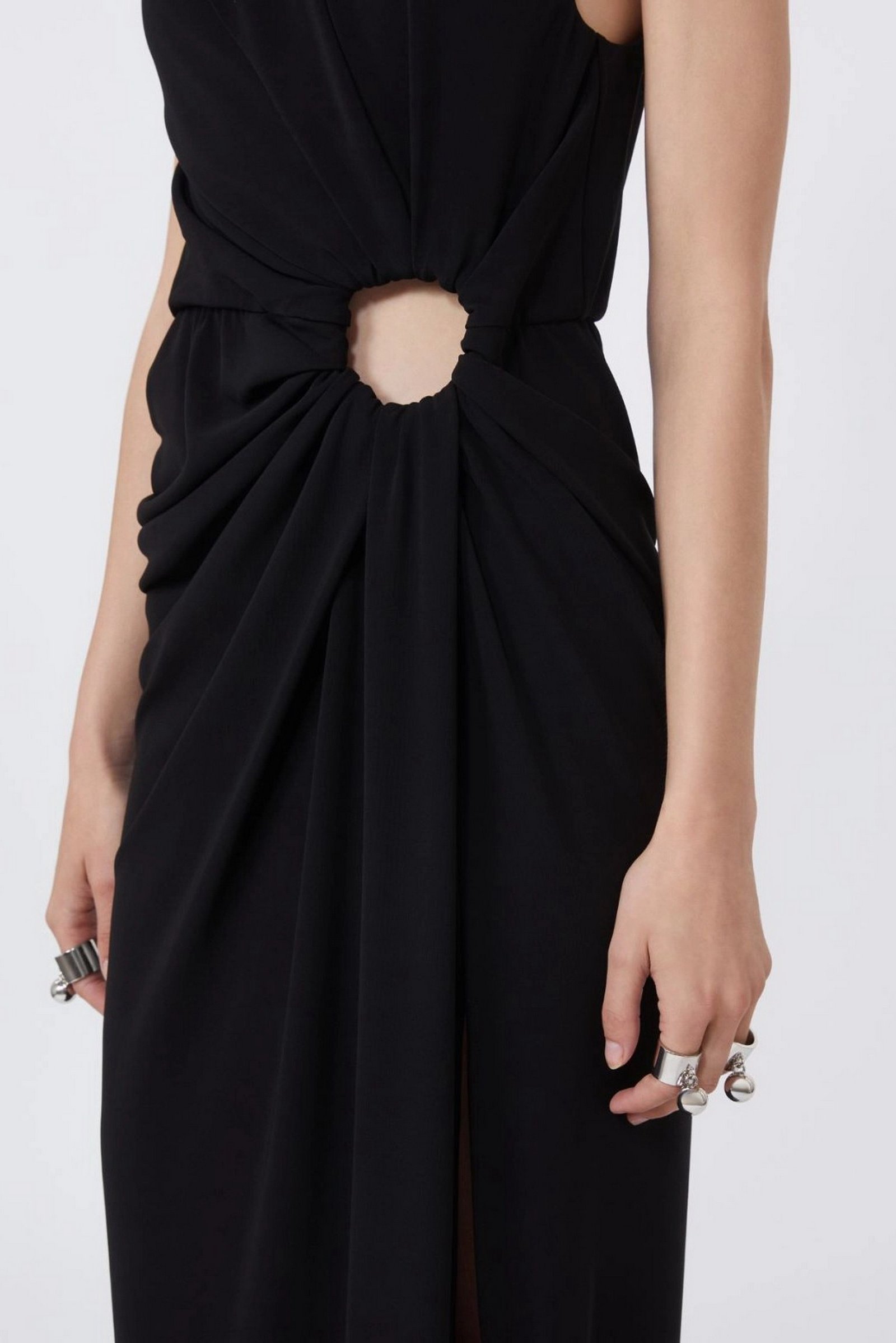 Abito aderente in jersey crêpe, con linea smanicata e scollo stondato. L’anello metallico posizionato sul fianco sinistro crea un motivo di drappeggio su tutto il capo e un oblò aperto. Motivo di arricci lungo il fianco destro.